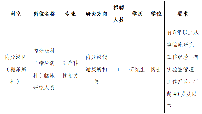 | 根据医院发展和工作需求,现向社会招聘高层次人才1名。 一、招聘岗位和人数 内分泌科(糖尿病科)研究人员1名 二、薪酬待遇 工资待遇按国家事业单位有关政策规定执行。 三、招聘范围 面向社会。 四、招聘条件 应聘人员应同时具备下列基本条件及岗位任职条件。 (一)基本条件 1.具有中华人民共和国国籍。 2.遵守中华人民共和国宪法和法律。 3.具备良好的品行和职业道德。 4.具备岗位所需的专业或者技能条件。 5.适应岗位要求的身体条件。 (二)应聘人员具有以下情形之一者,不得报考: 1.受过刑事处罚的; 2.被开除中国共产党党籍的; 3.被开除公职的; 4.被依法列为失信联合惩戒对象的; 5.法律、法规规定的其他情形。 (三)岗位任职条件 ![]() 以上所列期限计算截止至报名开始日。专业名称参照《广东省2025年考试录用公务员专业参考目录》。如报考人员所学专业未列入《广东省2025年考试录用公务员专业参考目录》的,可选择专业要求中相近专业报考,但所学专业必修课程须与报考岗位要求的专业主要课程基本一致,并提供原毕业院校出具的认定为相近专业的证明方可报考。 五、报名与资格审查 (一)报名时间 2025年7月23日至7月29日17:00。 (二)报名方式