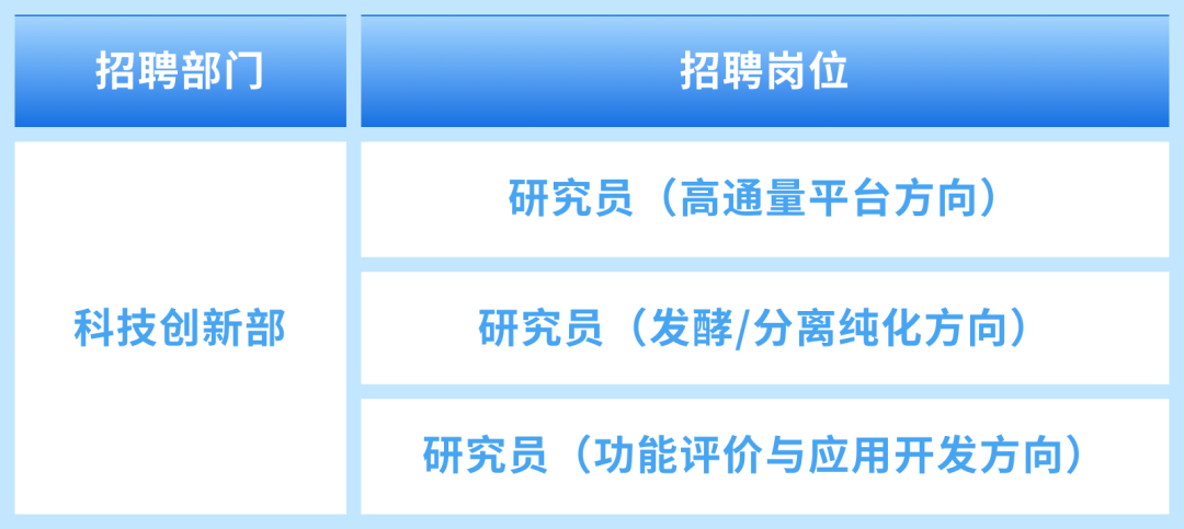 ![]() 招聘公告 国投生物制造创新研究院有限公司(以下简称国投创新院)是国家开发投资集团有限公司(以下简称国投集团)全资子公司,成立于2024年12月,注册资本60亿元,是国投集团在生物制造产业领域集科技创新、产业培育、运营管理等功能于一体的管理平台,以技术研发、股权投资、成果孵化等方式培育和发展生物制造产业。 国投新质蛋白生物制造创新中心是国投创新院控股建设的研发平台,旨在通过合成生物学技术推动新质蛋白产业的发展,促进新来源、新功能、新品质的蛋白原料和产品的研发与产业化。中心联合国内知名学术机构共建国家级合成生物制造创新中心,通过资本投资,聚焦新质蛋白研发、规模化生产及产业链整合,打造“科技创新+产业培育”的新质蛋白产业集群。中心依托AI赋能的高通量合成生物研发平台、数据驱动的工艺放大和柔性中式技术,实现高效低成本的工业菌种创制,加速各类新型蛋白产品开发和生产成本优化。 为满足国投创新院及所属单位发展所需要的人才,拟面向社会公开招聘。招聘工作全程委托国投人力资源服务有限公司(以下简称国投人力)负责组织实施。有关事项公告如下: 一 招聘岗位 国投生物制造创新研究院有限公司 社会招聘岗位 ![]() 国投新质蛋白生物制造创新中心(无锡) 社会招聘岗位 ![]() 国投新质蛋白生物制造创新中心(无锡) 校园招聘岗位 ![]() 二 岗位职责与资格条件 基本条件 1.政治立场坚定,严格遵守党的政治纪律和政治规矩; 2.认可国投集团及国投创新院企业文化,承诺遵守国投集团规章制度; 3.具有良好的职业操守和个人品行,诚实守信,廉洁从业; 4.符合公司战略规划需求方向,满足招聘岗位所需的专业知识、能力、学历等方面的任职资格条件; 5.具有正常履行职责的身体条件和心理素质。 资格禁入条件 1.违反政治纪律和政治规矩的; 2.存在严重违纪违法或正在接受调查处理的,受到诫勉、组织处理或者党纪政务处分等影响使用的; 3.存在任职回避、竞业限制、违规经商办企业、纳入失信被执行人名单以及法律、法规、规章制度规定的其他不适宜引进情形的。 岗位职责与任职条件 具体岗位职责与任职条件详见国聘报名链接:https://gtcxy.iguopin.com/ 扫码投递简历