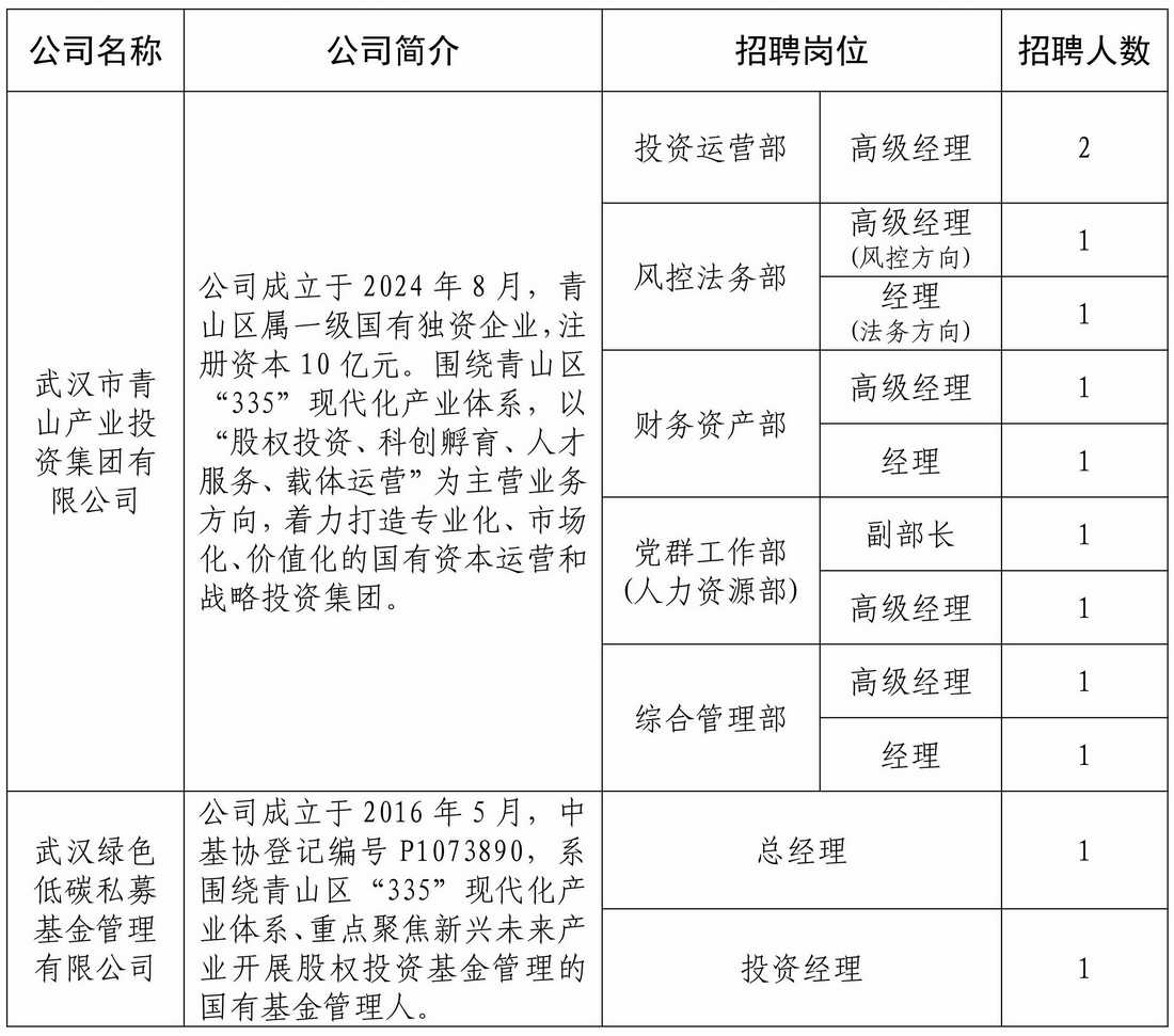 | 为进一步深化国企改革,加强青山区区管国有企业人才队伍建设,拓宽选人用人渠道,根据工作需要,青山区2家区管国有企业拟面向社会招聘工作人员,现将有关事项公告如下。 一、招聘岗位 本次面向社会招聘涉及武汉市青山产业投资集团有限公司和武汉绿色低碳私募基金管理有限公司,共11个岗位12人。