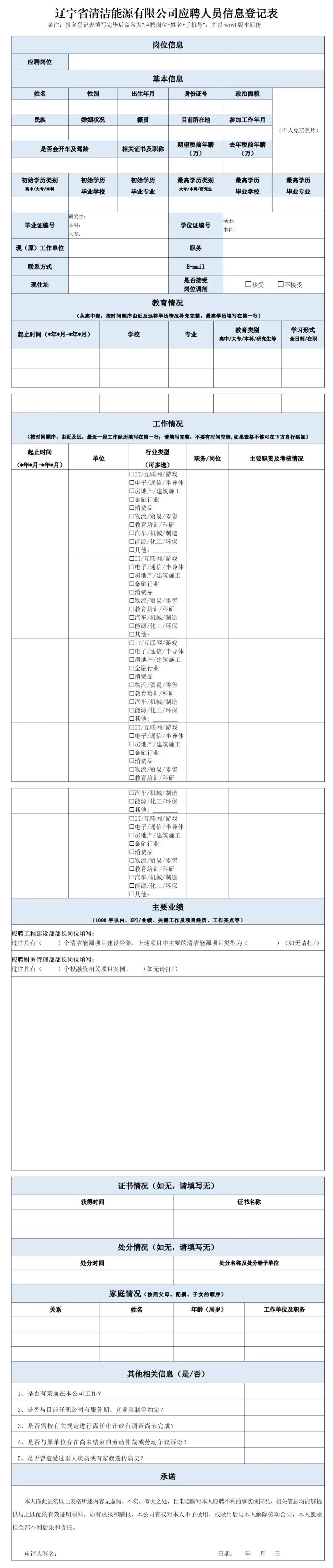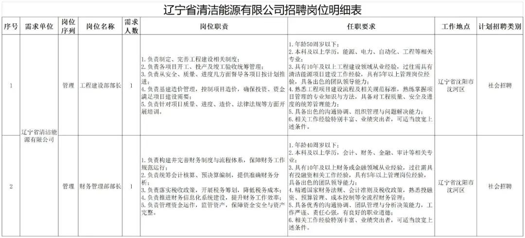 | 辽宁省清洁能源有限公司(以下简称“清洁能源公司”)是辽宁省能源产业控股集团有限责任公司(以下简称“能源控股集团”)控股的国有全资公司,于2024年12月25日在辽宁省沈抚改革创新示范区注册成立,注册资本20亿元人民币。清洁能源公司由能源控股集团联合其所属的辽宁能源投资(集团)有限责任公司、阜新矿业(集团)有限责任公司、辽宁铁法能源有限责任公司、抚顺矿业集团有限责任公司共同出资组建,作为专业化平台公司,旨在落实省委、省政府清洁能源强省战略,实现省内清洁能源资源集约化、专业化、规模化开发。 为满足业务发展需求,清洁能源公司拟面向社会公开招聘2名管理岗人员,现将有关招聘事项公告如下: 一、招聘岗位及要求 详见附件1。 二、报名条件 (一)基本条件 1.具有中华人民共和国国籍,遵守宪法和法律; 2.政治立场坚定,拥护中国共产党的领导和中国特色社会主义制度,深刻领悟“两个确立”的决定性意义,增强“四个意识”、坚定“四个自信”、做到“两个维护”,在思想上政治上行动上同以习近平同志为核心的党中央保持高度一致; 3.具有良好的道德品行,有事业心和责任感,热爱能源事业。 (二)任职条件 详见附件1。 (三)不得参加招聘情况 有下列情形之一的人员,不得参加此次招聘: 1.曾因犯罪受过刑事处罚的、被开除公职的、正在接受纪律审查或涉嫌违法犯罪正在接受调查的人员; 2.受过党内严重警告或行政记大过以上处分的人员和受党纪、行政处分,尚处影响期内的人员; 3.被依法列入失信联合惩戒对象的人员; 4.有违法犯罪和不良记录的; 5.有其他情形影响录用的。 三、应聘程序 (一)报名 1.本次招聘采用网上报名方式,不接受现场报名。 报名截止时间:2025年8月5日17:00。 2.每位应聘人员只能应聘一个岗位,报名时提交的材料包括: ①填写完整的《应聘人员信息登记表》电子版和签字版扫描件; ②有效期内的身份证正反面扫描件; ③各学历阶段(大专及以上)毕业证书、学位证扫描件电子版; ④有效期内各学历阶段(大专及以上)的学信网《教育部学历证书电子注册备案表》《中国高等教育学位在线验证报告》电子版;留学回国人员须提供国家教育部留学服务中心的国外学历学位认证书; 学信网查询网站https://www.chsi.com.cn/ ⑤职称证书扫描件(如有)、执业资格证书扫描件(如有)。 以上材料,需发送到指定邮箱:LNSQJNY@vip.163.com,序号②-⑤放到一个文件夹压缩在一起,序号①不用压缩。邮件及压缩包、简历均命名为:“应聘岗位+姓名+手机号”。 (二)资格初审 根据岗位任职资格要求及应聘人员提交的应聘材料进行资格审查,符合条件者择优进入下一环节,资格审查贯穿始终。 (三)初面 1.初面形式:将以电话和短信形式另行通知; 2.初面人数:根据资格审查结果,择优邀约人员进入初面环节,按照每个岗位初面人数与岗位招聘数不低于3:1确定进入初面人员名单; 3.初面时间及地点:具体初面时间及地点将以短信形式发送至入选人员手机,请收到短信人员务必按照短信提示时间回复是否参加面试,未回复短信者,招聘项目组会以电话进行沟通确保收到相关信息,若未能接通者,视为放弃面试机会; 4.线上测评:进入初面的所有应聘人员面试前参加线上领导力测评,该测评作为面试参考,不计入总分。 (四)复面 1.复面形式:将以电话和短信形式另行通知; 2.复面人数:按初面成绩由高至低,按照每个岗位复面人数与岗位招聘数不低于2:1确定进入复面人员名单; 3.复面时间及地点:具体复面时间及地点将以短信形式发送至入选人员手机,请收到短信人员务必按照短信提示时间回复是否参加面试,未回复短信者,招聘项目组会以电话进行沟通确保收到相关信息,若未能接通者,视为放弃面试机会。 (五)资格复审及考察 本次公开招聘最终以初面及复面的综合成绩排名为录用依据(初面成绩占比40%,复面成绩占比60%的权重),综合成绩相同的,按照复面成绩由高到低的顺序进行排名。 对拟录用人员进行资格复审和考察,包括但不限于人员身份信息、学历信息、法院民事诉讼信息、金融风险记录、商业利益冲突等。 (六)体检 对拟录用人员安排到指定体检机构进行新员工入职项目体检。体检不合格者或放弃体检者,不予录用。 (七)公示与录用 拟聘人员信息统一在辽宁省国资委门户网站、智引人才微信公众号进行公示,公示期为5个工作日。公示结束后,为无异议人员办理录用手续。清洁能源公司对首次录用人员实行试用期制度,试用期按有关规定执行。 四、注意事项 (一)应聘人员应对所提供信息的真实性、完整性负责,如发现与事实不符的,清洁能源公司有权取消其应聘资格。? (二)应聘人员应保持所留联系方式畅通有效,如因应聘人员通信不畅而引起信息传递问题,由应聘人员本人负责。? (三)清洁能源公司对应聘信息将严格保密,不做他用。? (四)招聘公告的解释权归清洁能源公司所有。 (五)咨询电话:024-31358586、13066531153(电话咨询时间:工作日9:00-12:00,13:30-18:00)。 附件: