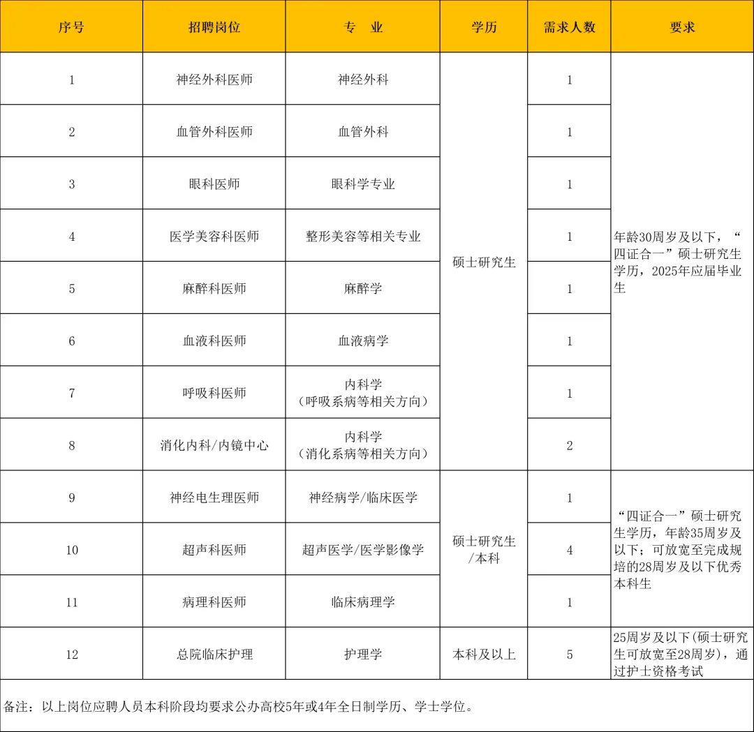 | 为做好医院专业人才招聘工作,满足学科发展人才储备需要,经研究,决定启动第二批人才公开招聘工作,现就有关事项公告如下: 招聘岗位及条件 (一)基本条件 1.具有中华人民共和国国籍; 2.遵守宪法和法律; 3.拥护中国共产党的领导,具有正确的政治方向和立场,有良好的思想素质和职业道德,无违规违纪等不良记录; 4.身体健康,适应岗位要求的身体条件; 5.岗位所需的专业知识或技能; 6.具备招聘岗位所需的其他条件。 (二)有下列情形之一的不得报名应聘 1.刑事处罚期限未满或者涉嫌违法犯罪正在接受调查的人员; 2.尚未解除党纪、政纪处分或正在接受纪律审查的人员; 3.违约免费医学生; 4.曾在其他公开招聘考试中被认定有舞弊等严重违反招聘纪律行为的人员。 (三)招聘岗位及要求 应聘岗位要求的年龄以身份证为准(如“25周岁以下”为“1999年8月1日以后出生”,其他涉及年龄计算的依此类推)。招聘岗位及要求详见《附表1.2025年专业技术人员岗位需求表》。 附表1. 2025年专业技术人员岗位需求表