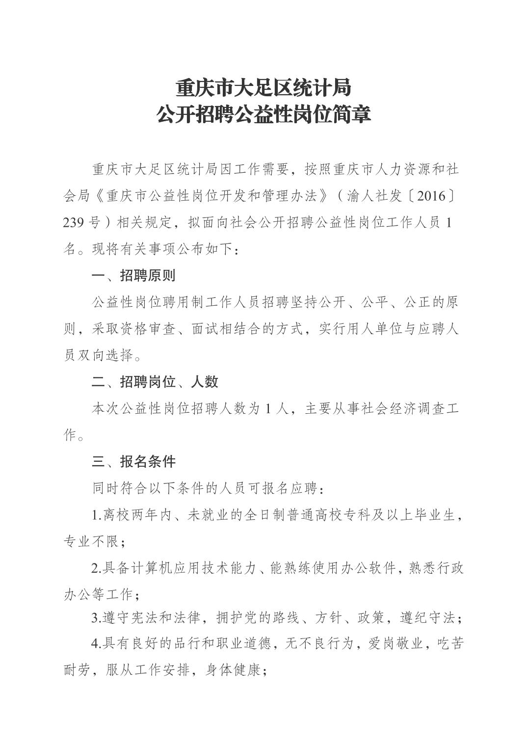 标签: 重庆市大足区统计局公开招聘公益性岗位简章关键词:1.重庆市大足区统计局2.公益性岗位招聘3.统计局招聘简章4.大足区统计局招聘5.公开招聘公益性岗位