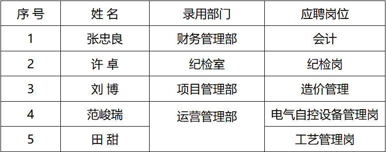 根据公司2025年社会招聘计划及相关流程,经笔试、面试等环节考核,现对录用人员进行公示(具体名单附后): 一、公示时间 2025年9月1日-2025年9月5日(共5个工作日) 二、录用人员名单