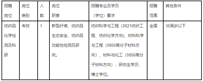 宁波市市场监督管理局局属事业单位宁波市产品食品质量检验研究院公开招聘高层次人才公告 根据《宁波市事业单位公开招聘工作人员实施办法》和《宁波市市场监督管理局局属事业单位公开招聘工作人员实施细则》有关规定,宁波市市场监督管理局局属事业单位宁波市产品食品质量检验研究院(宁波市纤维检验所)决定面向社会公开招聘事业编制工作人员1名。现就有关事项公告如下: 一、招聘单位简介 宁波市产品食品质量检验研究院(宁波市纤维检验所)是宁波市市场监督管理局所属公益二类财政部分补助事业单位,拥有5个国家级质检中心,7个省级质检中心,是国家认监委CCC强制性认证检测实验室和国家市场监督管理总局、国家卫健委、农业农村部三部委联合发文认可的国家复检机构,是宁波市综合性最强的产品质量检验检测技术机构。主要从事食品、食品相关产品、纤维、纺织服装、皮革制品、化工产品、机械产品、电子电器产品、文体教育用品、黄金珠宝、建筑材料、居家用品、家庭装饰、智能化信息工程等与人们工作和生活息息相关的产品检验检测、质量鉴定、跨越贸易技术壁垒、标准制订、消费咨询等工作,为政府部门、企业和消费者提供优质、科学和高效的专业技术服务。 二、招聘原则和办法 招聘工作坚持公开、平等、竞争、择优原则,按照德才兼备的用人标准,采取公开报名、统一考试和择优聘用的办法进行,通过笔试、面谈、体检和考核等程序面向社会公开招聘事业编制工作人员。 三、招聘对象基本条件 (一)遵守中华人民共和国宪法、法律和法规; (二)遵守纪律、品行端正,具备良好的职业素质; (三)具有招聘岗位所需的学历、资历、专业、任职资格、职业(执业)资格及技能要求; (四)具有适应岗位要求的身体条件; (五)具备岗位所需的其他条件。 四、招聘岗位、人数、专业、学历、范围及资格条件 ![]() 注:1.年龄的计算截止时间为公告发布之日。 2.应聘人员属于2026年全日制普通高校应届毕业生的,凭就业协议或推荐表或学生证报名,但须在2026年12月31日前取得相应学历、学位。应聘人员属于国外、港澳留学回国(境)人员,可凭国(境)外学籍证明报名,但须于2026年12月31日前取得教育部中国留学人员服务中心出具的境外学历、学位认证书,专业名称相似的以所学主干课程为准。历届生须已取得招聘岗位要求的学历学位证书或认证书。上述时间,以学历学位证书或认证书的落款时间为准。 五、招聘办法和步骤 (一)报名与资格审查 1.报名时间:自公告发布之日起至2025年10月10日。 2.报名方式:本次报名采用线上报名:请将报名所需材料在规定的时间内发送至电子邮箱:zjnbifc@163.com,文件名为“报名岗位+姓名”。 3、报名所需材料: 本人身份证、学历证书、学位证书、相关资格证书的原件和复印件、报名表(见附件)。应聘人员提供的个人信息必须真实有效,证件不全或提供证件与岗位资格条件不相符者,不能通过报名资格审查。 现场咨询:2025年9月20日(9:00-14:00), 现场确认报名地点:宁波国际会展中心(宁波市鄞州区会展路181号)。 4. 资格初审 报名结束后,招聘单位将对应聘人员的报考资格进行初审,证件不全或提供证件与报考资格条件不相符合者,不能通过报名资格审查。 报名资格审查通过名单将于报名结束后3个工作日内在宁波市市场监督管理局网站上公布。 (二)资格复审和面谈 本次招聘岗位为紧缺岗位,符合报考条件的应聘人数与招聘计划数之比不足3:1时,按符合招聘条件的实际应聘人数进入面谈环节,根据应聘者教育背景、专业素养、学术水平、科研成果、创新能力等情况,经面谈考核直接确定选聘体检、考察对象。 1、资格复审 招聘单位将在面谈前,对入围人员进行资格复审,具体时间、地点将在宁波市市场监督管理局官网站上另行通知。参加资格复审者请携带身份证、本人简历、户口本、学历(学位)证书、经历证明等原件及复印件。证件(证明)不全或所提供的证件(证明)与报考资格条件不相符者,不能通过资格复审;不按规定的时间和地点参加资格复审者视作自动放弃。 2、面谈 本次面谈总分为100分,不足70分者淘汰。应聘人凭《面谈通知》和身份证参加面谈,面谈对象不按规定的时间和地点参加面谈的,视作放弃面谈资格。 3.成绩 在面谈合格人员中,按总成绩从高分到低分按1:1的比例确定体检、考核对象,若总成绩相同的增加考试课目。面谈成绩以及参加体检与考核人员名单于面谈结束3个工作日内在宁波市市场监督管理局网站。(http://scjgj.ningbo.gov.cn/)上公布。 (三)体检与考核 参加体检人员按要求时间到指定地点参加体检,体检标准参照《浙江省国家公务员录用体检标准(试行)》执行。未按要求时间到指定地点参加体检的,视为考生自动放弃。 体检结束后,招聘单位将对体检合格者的思想政治表现、道德品质、业务能力、工作实绩等情况进行详细考核。考核不合格者淘汰。 因体检、考核不合格或考生自动放弃出现招聘岗位空缺时,在面谈合格人员中,按总成绩从高分到低分依次递补。 (四)公示与聘用 拟聘用人员名单报经市人力资源和社会保障局核准后,同时在宁波人力资源和社会保障局网及宁波市市场监督管理局网站上公示七个工作日。公示期满后无异议,办理人事关系转移手续并签订聘用合同。在办理人事关