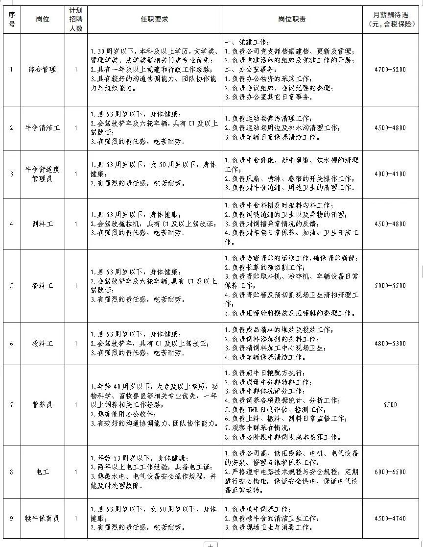 | 因工作需要,根据《中华人民共和国劳动法》《中华人民共和国劳动合同法》等有关规定,东营市东凯人力资源服务有限公司面向社会公开招聘一线劳务派遣工作人员,派驻到山东省黄三角农高区某牧业公司工作,现将有关事项公告如下: 该牧业公司位于省黄三角农高区花苑路西首,公司深耕农牧循环产业经济发展,重点建设国家级示范牧场,是一家从事奶牛养殖、生鲜乳销售为主的企业。 一、招聘岗位计划 招聘岗位、人数、要求等详见下图: ![]() 二、招聘条件 (一)基本条件 1.具有中华人民共和国国籍,遵纪守法,品行端正,无不良嗜好和违法违纪行为,身体健康; 2.符合招聘岗位所要求的其他条件; 3.具备缴纳社会保险的条件。 (二)有下列情形之一的,不得报名 1.曾因犯罪受过刑事处罚或正在被立案审查的; 2.曾被开除公职的; 3.现役军人、服务期限不满(含试用期)的机关事业单位工作人员; 4.法律法规政策规定不得聘用的其他情形。 三、招聘程序 (一)报名 1.报名时间:2025年9月18日开始报名,长期招聘。 2.报名方式:微信扫描下方二维码,按照要求填报应聘登记表发送至13792055186@163.com。 ![]() 3.报名须知:应聘人员如实填写相关个人信息资料,应聘人员多次发送报名资料的,以第一次发送报名资料为准,重复发送无效。 (二)面试 对于报名人数较多的岗位,根据工作需要确定是否进行初选,初选以简历筛选方式进行,未通过简历筛选的人员不再另行通知,同时纳入我公司人才储备库。 面试的具体时间、地点和方式另行通知。应聘人员应保持报名时填报联系方式通畅,以便通知或递补,因应聘人员个人原因延误的,应聘人员自主承担相关责任。 (三)聘用及待遇 1.面试通过人员体检合格(体检费用由应聘人员个人承担)并提交无犯罪记录证明后,确定为拟聘用人员,聘用方式采用劳务派遣形式,由劳务派遣公司与受聘人员签订劳动合同。聘用期间,如有违反劳动合同规定或严重违反公司规章制度行为或被服务单位退回的,经协商一致,解除劳动合同。对拟聘用人员实行试用期制,试用期1个月,试用期满后经考核胜任岗位的,办理正式聘用手续。 ? ? 2.工资待遇面议,按照相关规定缴纳社会保险。 咨询电话: 0546-8307622 ?13792055186 标签: 山东省黄三角农高区牧业公司招聘 劳务派遣工作人员 牧业公司招聘 一线员工招聘 劳务派遣简章 |