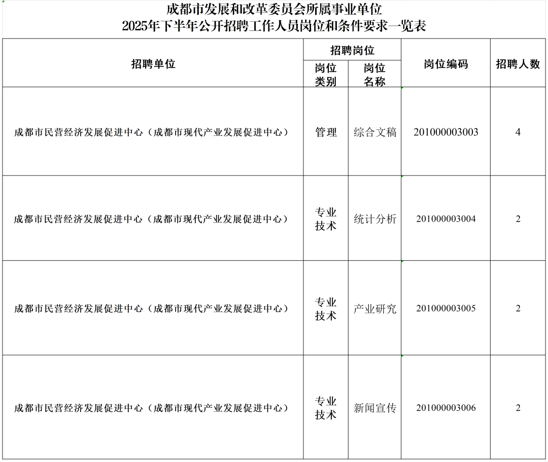 成都市发展和改革委员会所属事业单位公开招聘公告 因工作需要,根据国家、省公开招聘事业单位工作人员相关规定,按照 “ 公开、平等、竞争、择优 ” 原则,在四川省人力资源和社会保障厅统一安排下,成都市发展和改革委员会面向社会公开招聘工作人员10名,本次公开招聘进入事业单位的为编制内正式工作人员,招聘的工作人员按《事业单位人事管理条例》及相关规定实行事业单位聘用制管理。现将公开招聘有关事项公告如下。 招聘对象和范围 符合职位要求的社会在职、非在职人员。所有人员应当在面试资格审查截止前取得相应学历学位证书。未在规定时间内取得有关证书的,不得进入下一环节或不得聘用,责任由应聘人员承担。 招聘岗位 本次共招聘10名。具体岗位和条件详见文末附件1:《成都市发展和改革委员会所属事业单位2025年下半年公开招聘工作人员岗位和条件要求一览表》。