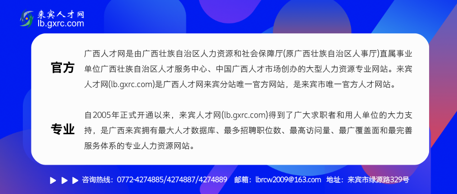 为加强我市艺术类人才队伍建设,更好地推动群文事业高质量发展,根据来宾市机构编制委员会《关于印发来宾市直机关事业单位后勤服务人员聘用制管理暂行办法通知》(来编〔2013〕140号)的规定,我局决定公开招聘来宾市群众艺术馆事业单位后勤服务人员。为使招聘工作顺利进行,特制定本公告。 一、招聘岗位、人数及要求 声乐演员(后勤服务控制数)1名。 二、招聘对象的基本条件 (一)具有中华人民共和国国籍; (二)遵守宪法和法律,拥护中国共产党领导和社会主义制度; (三)具有良好的政治素质和道德品行; (四)具有正常履行职责的身体条件和心理素质; (五)一般为18周岁以上(2007年10月16日前出生)。具体条件以《来宾市文化广电和旅游局2025年公开招聘事业单位后勤服务人员岗位计划表》(附件1,下称《计划表》)为准; (六)具有下列情形之一的人员,不得报考; 1.现役军人; 2.在读的普通高校非2025年应届毕业生(其中,在读的非2025年应届毕业的专升本人员、研究生不得以已取得的学历、学位证书报考); 3.曾因犯罪受过刑事处罚或曾被开除公职的人员; 4.曾在各级公务员或事业单位招考中被认定有严重违纪违规行为在规定期限内不得报考的人员; 5.被辞退未满5年的公职人员; 6.尚未解除党纪、政纪处分或正在接受审查的人员,涉嫌违法犯罪正在接受司法调查尚未做出结论的人员; 7.基层公务员、事业单位工作人员服务期内的; 8.被依法列为失信联合惩戒对象的; 9.法律规定不得招聘为事业单位后勤服务工作人员其他情形的。 (七)其他说明 本次招聘若无特别备注,则岗位要求的资格、证书等均须在2025年10月16日前取得,工作年限、服务年限、处分年限等所涉及时间段的计算,均以2025年10月16日为截止日期,年限按足年足月累计。全日制或脱产就读期间参加社会实践、实习、兼职等不能作为工作经历。 三、报名程序 (一)招聘岗位查询。招聘岗位、人数、资格条件等详见《计划表》(附件1)。 (二)报名。凡符合报考条件要求的报考人员,可在报名期间下载《报名登记表》(附件2),填写相关信息,并由本人直接将报名材料送达至来宾市群众艺术馆9楼馆办公室(2025年公开招聘后勤服务人员工作领导小组办公室)进行资格审查。报名材料包括:《报名登记表》一式两份、本人有效居民身份证、户口薄、毕业证、职称或职业资格证明材料等原件和复印件各1份,以及招聘岗位要求的其他证件。若无法到达现场报名的,可通过网上报名,发送到招聘专用电子邮箱,同时需电话联系确认邮件发送成功,因未电话联系确认邮件发送成功,造成未能及时审核无法参加面试的,责任由考生自行承担。 报考人员所填写的报名信息资料必须真实、准确。因报名提交的材料不真实、不完整或错误填写报名信息,造成资格审查及后续考察不通过等后果的,由报考人员自行承担责任。报考人员填写虚假信息资料的,一经查实,立即取消报考资格。对伪造、变造有关证件、材料、信息,骗取考试资格的,将按照有关规定处理。 报名时间:2025年10月16日至10月22日。现场报名、资格审查为报名期间的工作日上午8:00至12:00,下午15:00—18:00。 网上报名邮箱:lbqyg@163.com,联系电话:0772-4217007。 现场报名地点:来宾市群众艺术馆9楼馆办公室(2025年公开招聘后勤服务人员工作领导小组办公室)来宾市红水河大道346-2号 (三)资格审查。根据招聘岗位资格条件和有关要求,对报考者的资格条件进行严格审查。报考者通过现场报名的,当场确认是否通过资格审查;通过网上报名并确认初步通过资格审查的人员,本人须在面试前2天带上报名时资格审查的所有原件,到来宾市群众艺术馆9楼馆办公室(2025年公开招聘后勤服务人员工作领导小组办公室)进行面试资格复查。报考时间内报名申请未通过资格审查的,资格审查人员应说明原因。 网上报名资格复查时间:面试前2天(工作日)或者报名期间,每日上午8:00至12:00,下午15:00—18:00。 四、面试、考核和体检 (一)面试。资格审查通过后,招聘人数与面试人数比例达不到1:3的,按实际应聘人数进行面试。招聘人数超过15人的,增加初试环节。按照初试评分从高到低的顺序最高按1:15的比例确定面试人选。并通过电话通知入围面试人员,未入围面试者,不再另行通知。 面试的形式采用专业技能考评面试,主要测评考生的业务素质、专业知识应用和潜在能力等方面的综合素质。面试成绩总分为100分,60分为合格。面试成绩在面试结束时当场公布,面试成绩从高分到低分的顺序确定考核人选。面试成绩不合格者,不得确定为考核人选。 (二)考核。按照《来宾市市直机关公务员、事业单位工作人员录用(聘用)考核办法(试行)》(来政人发〔2007〕40号)的有关规定,对考核对象进行考核。考核着重考察应聘人员的思想政治素质、道德品质修养、业务能力、遵纪守法、岗位匹配度等情况。考核组应当广泛听取意见,做到全面、客观、公正,并据实写出书面考核材料,同时对考核对象报考资格条件进行复查。 体检。由我局组织考生体检,体检工作按照《中共广西壮族自治区委员会组织部广西壮族自治区人力资源和社会保障厅广西壮族自治区卫生健康委员会关于进一步规范事业单位公开招聘人员体检工作有关问题的通知》(桂人社规〔2019〕11号)执行。体检项目及标准按照《广西壮族自治区人力资源和社会保障