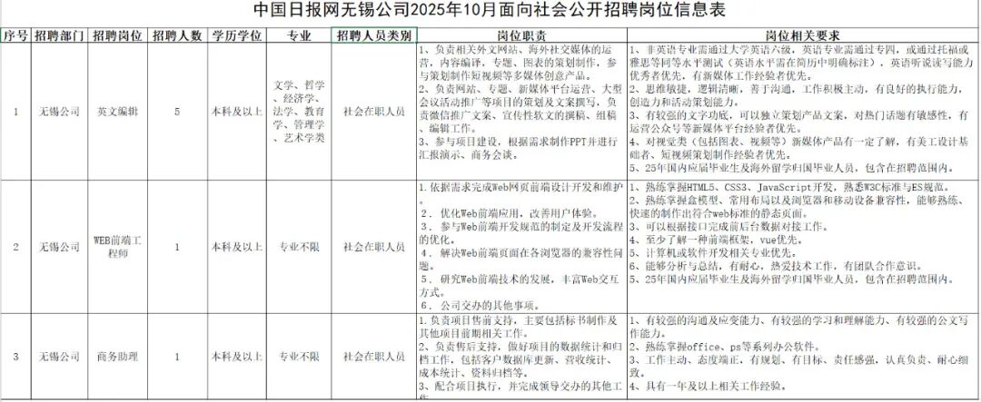 | 根据工作需要和有关规定,中国日报网无锡公司2025年10月拟公开招聘无锡公司3个工作岗位共7名人员,具体事项如下。 一、单位简介 中国日报网创办于1995年,是《中国日报》建设的综合性新闻资讯信息网络平台,是中央重点新闻网站,是全亚洲、也是全国范围内领先的英文新闻网站,是国际互联网上最具影响力的中国新闻网站之一。 中国日报网无锡公司成立于2013年12月,系中国日报社旗下中国日报网全资公司,是中国日报社在北京之外的中国大陆地区成立的唯一一家独立法人实体,是无锡高新区2013年引进的国家级重大新媒体项目。 二、应聘基本条件 (一)具有中华人民共和国国籍。 (二)政治立场坚定,拥护中国共产党的领导和社会主义制度,牢固树立“四个意识”,坚定“四个自信”,做到“两个维护”。 (三)拥护和遵守中华人民共和国宪法和法律法规,践行社会主义核心价值观,诚实守信,品行端正,遵规守纪。 (四)热爱党的新闻事业,恪守新闻工作者职业道德,热爱国际传播事业,具有良好的职业操守和团队合作精神。 (五)符合招聘岗位要求的学历学位和专业要求。 (六)具备适应岗位要求的专业技能、身体条件及心理素质。 (七)曾因犯罪受过刑事处罚人员,曾被开除党籍、在各级人员招考中被认定有舞弊等严重违反考试录用纪律行为的人员,被依法列入失信联合惩戒对象名单的人员,不得报考。报名人员不得报考录用后构成回避关系的招聘岗位。 三、招聘岗位及要求 英文编辑5人,WEB前端工程师1人,商务助理1人,共计3个岗位7人。 ![]() (点击图片放大) ![]() (中国日报网无锡公司2025年10月面向社会公开招聘岗位信息表下载) 四、招聘程序 (一)报名 报考中国日报网无锡公司岗位:可登录智联招聘网站、前程无忧网站或发送简历至wxhr@chinadaily.com.cn进行投递。 简历收取时间至以上岗位招聘流程结束。 (二)资格审查 中国日报网无锡公司按照公布的岗位资格条件对报考人员进行资格审查,必要时也可要求报考人员补充材料进行资格复核。 (三)笔试 由中国日报网无锡公司统一组织实施。每次开考前,将通过邮件、短信或电话等通知形式告知入围人员考试的时间、地点及其他有关事项。对未入围该环节的人员,不再另行通知。 笔试以答卷考试方式进行,内容主要为所报考岗位基础专业知识和能力测试。按照笔试成绩高低确定各岗位参加面试人选。 (四)面试 着重考察报考人员的政治素质及专业知识。如有报考人员主动放弃,按照笔试成绩由高到低的顺序依次递补。依据综合成绩(笔试占50%,面试占50%)由高到低排序确定考察人选。 (五)考察和体检 中国日报网无锡公司对考察人选进行考察,若人选考察合格,根据综合成绩排名择优确定拟录用人员。 中国日报网无锡公司组织拟录用人员到指定的医疗机构进行体检。体检费用由拟录用人员承担。拟录用人员对体检结果有疑问的,可申请到指定医疗机构复查一次。 如拟录用人员放弃资格或体检、考察不合格,按照综合成绩从高到低顺次递补。 (六)公示 考察和体检合格后,确定拟录用人员并在中国日报网站上进行公示,应届高校毕业生(即毕业学年的普通高等学校在校生)公示一般不少于7天,社会在职人员及留学人员公示一般不少于3个工作日。对公示期内反映问题影响聘用并查实的坚决不予录用。 (七)录用 公示期满无异议的,公示结束后报有关部门备案。待备案通过后,按规定与拟录用人员办理录用手续并签订劳动合同。 面向社会公开招聘人员实行试用期制度,试用期包括在劳动合同期限内。试用期满合格的,予以正式录用;不合格的,取消录用。 五、注意事项 (一)同一招聘周期内,候选人每人仅限报一个岗位,同时报名多个岗位视为放弃应聘资格。 (二)笔试、面试时间及相关注意事项将通过候选人申报职位时所填写的手机及邮箱地址发送通知,请应聘人员保持手机畅通、及时查收邮件。 (三)在招聘期间,报考人员如确定自愿退出的,请务必及时以电话并邮件形式沟通。 (四)本次公开招聘考试不指定教材、参考资料。 六、纪律要求 根据相关规定,报考人员应对所提供信息的真实性负责,并遵守中国日报网无锡公司公开招聘工作的相关要求。报考人员填报的主要信息不完整或不实的,无故未如约参加笔试、面试,以及违反招考单位招聘工作相关要求的,将被取消录用资格。 本公告由中国日报网无锡公司负责解释。 招录咨询电话:0510-68559063 中国日报网无锡公司综合管理部 2025年10月 标签: 中国日报网 无锡公司 招聘启事 网络媒体招聘 媒体公司职位 |