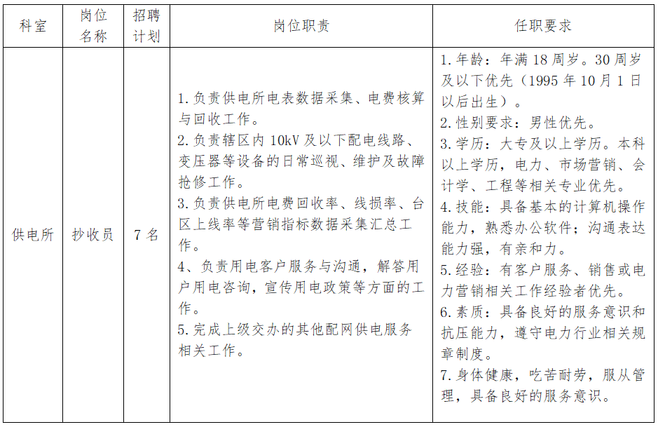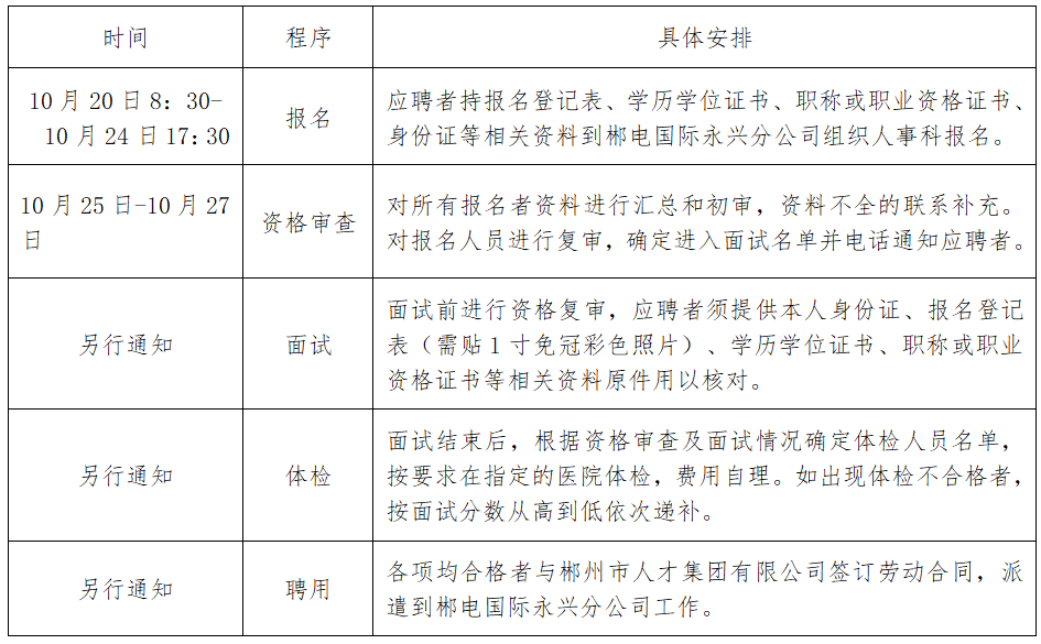 | 郴电国际永兴分公司劳务派遣人员招聘公告 根据公司经营业务工作需要,湖南郴电国际发展股份有限公司永兴分公司公开招聘劳务派遣人员7名,具体事项公告如下: 一、招聘岗位及要求 ![]() 二、基本条件 (一)坚定贯彻执行党的基本路线和国家的各项方针、政策,遵纪守法、廉洁自律、勤奋务实; (二)政治思想好,作风正派,处事公道;有创新意识、进取和团队合作精神; (三)具备招聘岗位的专业知识和技能,具有一定的业务水平和协调能力; (四)具有能够胜任本职工作的身体素质和心理素质; (五)无不良嗜好、违法犯罪和不良信用记录。 三、招聘程序 ![]() 四、待遇 基本薪资2360元/月(含个人部分保险),3年内每连续工作满1年调增100元/月,累计调增不超过300元/月;经派遣单位考核合格后,岗位津贴及节日福利等按公司相关制度执行;年度绩效工资以同岗位在职正式员工的50%为基数,根据考核结果发放。 五、其他事项 录用人员与郴州市人才集团有限公司签订劳动合同,派遣到郴电国际永兴分公司工作。 六、联系方式 1.联系部门:郴电国际永兴分公司组织人事科 2.联系地址:郴电国际永兴分公司615办公室 3.联系电话:13873525123(邝) 附件:应聘报名登记表 ![]() 郴电国际永兴分公司 2025年10月19日 标签: 郴电国际 永兴分公司 劳务派遣 人员招聘 招聘公告 |