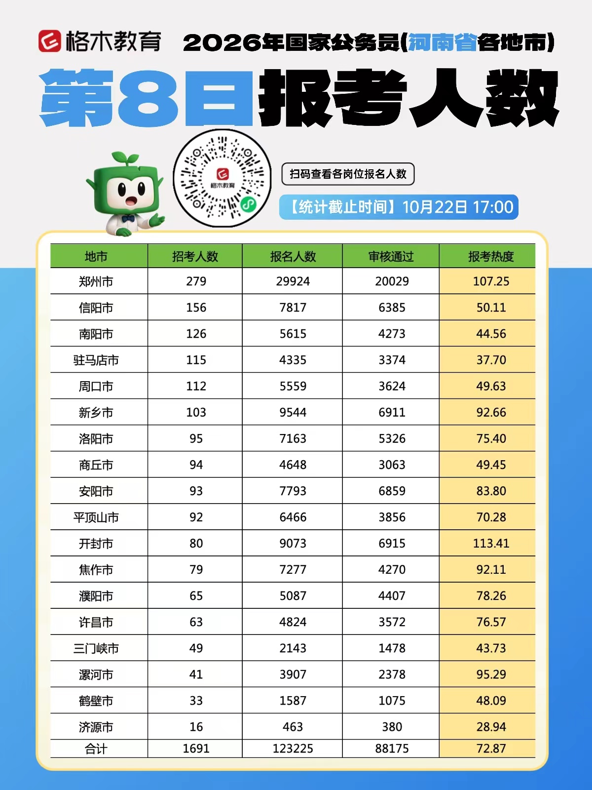 2026国家公务员考试共计招录3.81万人,考生可于10月15日8:00至10月24日18:00期间登录“中央机关及其直属机构2026年度考试录用公务员专题网站”(http://bm.scs.gov.cn/kl2026)进行网上报名,公共科目笔试将于11月30日在全国各直辖市、省会城市、自治区首府和部分城市同时举行。 2026年国考报名人数统计:截至10月22日17:00时,河南招录1691人,报名人数123225人,审核通过88175人。 |