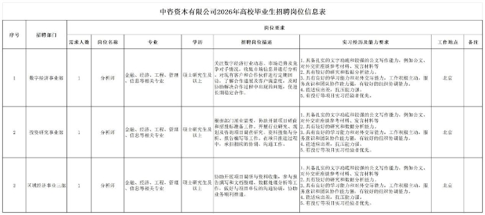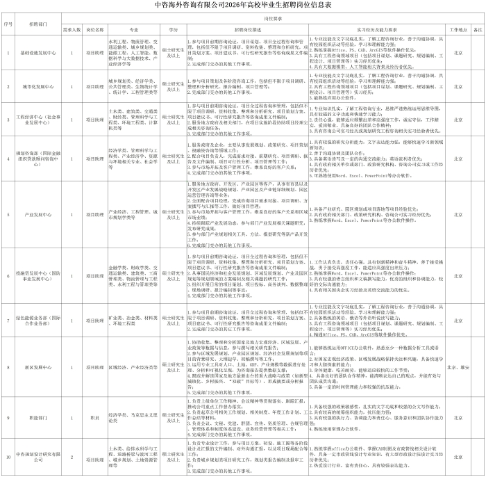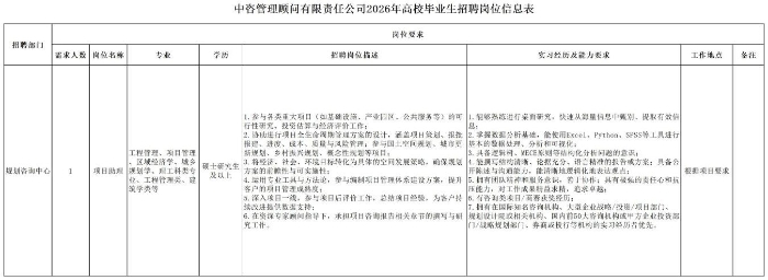 | 中咨工程管理咨询有限公司 一、公司简介 中咨工程管理咨询有限公司(简称中咨管理)成立于1989年,是中国国际工程咨询有限公司的核心骨干子公司,注册资金1.55亿元。现有各项资质证书持证2800余册,中高级职称比例超50%。 中咨管理公司是国内从事工程管理类业务最早、规模最大、行业最广、业绩最多的企业之一,具有工程咨询甲级资信、工程监理综合资质以及设备、公路工程、地质灾害防治工程、人民防空工程等多项专业监理甲级资质,并列入政府采购招标代理机构和中央投资项目招标代理机构名单。业务涵盖工程前期咨询、项目管理、项目代建、招标代理、造价咨询、工程监理、设备监理、设计优化、工程质量安全评估咨询等项目全过程咨询服务,涉及房屋建筑、交通、石化、水利、电力、冶炼、矿山、市政、生态环境、通信和信息化等多个行业。业务遍布全国及全球近50个国家和地区,累计服务各类咨询管理项目超过1万个,涉及工程建设投资近5万亿元。曾荣获56项中国建设工程鲁班奖、15项中国土木工程詹天佑奖、64项国家优质工程奖、23项中国钢结构金奖以及各类省级或行业奖项500余项。 经过30余年的不懈努力,我们积累了丰富的工程管理经验,为各类工程建设项目保驾护航,“中咨管理”品牌成为行业的一面旗帜。我们崇尚简单、包容、共享的理念,秉持创造价值、贡献社会的使命和专业创造精品、价值成就客户的核心价值观,为成为全过程工程管理咨询的领先者而奋斗。优秀的你值得更好的平台,加入我们,携手共创新篇章! 二、应聘条件 (一)2026年全日制本科及以上应届毕业生。 (二)年龄要求:本科生26周岁及以下(2000年1月1日后出生),硕士研究生30周岁及以下(1996年1月1日后出生)。 (三)在校就读期间无在职工作经历,无社保缴纳记录和派遣落户记录。 (四)成绩优秀,人品端正,积极进取,愿与公司共改革、奋进。 (五)具备扎实的专业理论知识和良好的沟通能力,实践能力较强。 (六)熟练使用各类办公软件。 (七)简历需注明出生日期、生源地(即入学前户籍所在地)。 三、应聘程序 发布招聘公告→简历投递→简历筛选→笔试→面试→确定人选并公示→发放录用通知。 四、岗位信息 五、报名方式 本次招聘报名采取在线填报方式进行:应聘者请使用Chrome内核浏览器(如:Chrome浏览器、360浏览器、百度浏览器、搜狗浏览器、UC浏览器等)登录网站报名,网站链接:https://hcmcloud.ciecc.com.cn/recruit/#/index 或使用手机扫描二维码: 中咨工程有限公司 一、? 公司简介 中咨工程有限公司成立于2010年,是中国国际工程咨询有限公司(简称中咨公司)的控股子公司,由中咨公司和中国广核电力股份有限公司合资成立。 公司作为中咨公司工程管理业务板块的核心成员,主营业务为全过程工程管理(咨询)服务业务,包括全过程中的各节点业务(1+X),业务范围涉及石化、核电、冶金、交通和民用市政等多个领域行业工程项目的前期咨询及咨询管理、勘察管理、设计管理、监理、采购管理、造价咨询、建造过程管理、项目管理(IPMT、PMC等)、项目代建和技术服务等。 公司以为国家、社会和股东创造价值为己任,以两大股东提供的广阔市场机遇和成熟先进的管理体系为发展驱动力,通过积极参与市场竞争,努力培育公司核心竞争能力,打造一支特别能战斗的具有复合型人才的专业化队伍,矢志发展成为具备承接大中型全过程工程管理(咨询)服务业务能力的、具有国际竞争力的工程公司。 二、? 应聘条件 (一)2026年全日制本科及以上应届毕业生(部分岗位硕士研究生学历),在校就读期间无在职工作经历,无社保缴纳记录和派遣落户记录,学习成绩优良。 (二)良好的语言表达能力和沟通能力,执行力强,学习能力强,协作能力强。 (三)身体健康,具有良好的职业道德修养,具有较强的责任心。 (四)熟练使用常用办公软件,具有一定的文字功底。 (五)无违规违法记录,无不良嗜好,身体素质好,能吃苦耐劳,能承受较大的工作压力。 三、? 招聘程序 发布招聘公告→简历筛选→资格审查→综合能力测评→面试→确定人选并公示→发放录用通知→入职。 四、? 岗位信息 五、? 报名方式 本次招聘报名采取在线填报方式进行:应聘者请使用Chrome内核浏览器(如:Chrome浏览器、360浏览器、百度浏览器、搜狗浏览器、UC浏览器等)登录网站报名,网站链接:https://hcmcloud.ciecc.com.cn/recruit/#/index 或使用手机扫描二维码: 中咨海外咨询有限公司 一、公司简介 中咨海外咨询有限公司是中国国际工程咨询有限公司所属二级子公司,于1988年成立,经过30多年发展,为各级政府、企事业单位提供了万余项咨询服务,在国内咨询领域具有一定知名度和较高信誉,具备较好的发展基础。2021年入选国资委“管理标杆”企业,2022-2025年连续4年蝉联国资委“双百行动标杆”企业。 公司主要从事战略谋划、投资策划、全过程咨询以及规划设计和建设投资管理经营五大业务。善于谋划策划创造发展新优势,努力成为工程建设领域原创思想策源地;善于科学设计项目功能成本方案,致力成为国内优化设计领域先行者;善于系统提供区域发展整体解决方案,努力成为国内有影响力的具有研究特质的咨询设计企业。公司为国家高新技术企业,拥有工程咨询行业综合甲级资信、15项专业专项甲级资信;公路、建筑、市政行业7项专业甲级设计