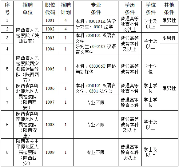 陕西省人民检察院及派出检察院2025年面向社会公开招聘聘用制书记员公告 根据工作需要,陕西省人民检察院及派出检察院2025年面向社会公开招聘聘用制书记员15名。现将有关事项公告如下: 一、招聘职位及要求 ![]() 二、招聘条件 (一)基本条件 1.具有中华人民共和国国籍; 2.拥护党的理论和路线方针政策,拥护中华人民共和国宪法,遵纪守法; 3.年龄为20周岁以上,30周岁以下(1994年10月28日至2005年10月28日期间出生); 4.品行端正,具有良好的政治素质和道德品行; 5.身体健康,具有正常履行职责的身体条件和心理素质; 6. 学历、学位、专业等要求详见职位表,且应已取得相应证书; 7.具备速记、计算机操作及办公软件运用等岗位必需的业务技能; 8.符合法律法规和招聘职位规定的其他条件。 (二)有下列情形之一的,不得报考: 1.曾受过刑事处罚或治安处罚的; 2.被开除公职或者被人民法院、人民检察院辞退的; 3.从陕西省人民检察院及其派出院辞职的聘用制书记员; 4.涉嫌违纪违法正在接受调查、审查尚未得出结论的; 5.被依法认定为失信联合惩戒对象的; 6.在公务员招录、事业单位招聘中因违纪违规行为被处理,尚在处理期间的;因在公务员招录、事业单位招聘中违规违纪,在禁考期间的; 7.现役军人、普通高等院校在读学生; 8.聘用会违反《中华人民共和国公务员法》关于任职回避相关规定的; 9.具有其他不适合在人民检察院工作情形的。 三、报考程序 招聘公告在 “陕西检察”微信公众号和“陕西智远人力网”(http://www.sxzyhr.com/)、“陕西智远人力”微信公众号同时发布,招聘环节的有关信息也将在上述网站发布,请考生及时关注。 考试报名采取网络报名和网上资格审查的方式。考生登录报名网站“陕西智远人力网”考试报名系统,按照要求注册报名,程序如下: (一)提交报名资料 1.考生应在2025年10月28日9:00至11月1日18:00登录考试报名系统填写、提交报名信息,并上传本人近期免冠2寸正面彩色证件照(要求:像素不低于220×300,jpg格式,大小在30kb以内,红底、蓝底或白底,照片须清晰,禁止使用有景物背景或缩放的照片以及P图、抠图、涂画的照片,不符合要求的照片均不予受理)。另需在附件处上传本人有效的居民身份证、学历学位证书(国内学历须同时上传学信网《教育部学历证书电子注册备案表》,境外学历须同时上传教育部留学服务中心认证的《国外学历学位认证书》)等报考要求中所涉及资料。 2.考生每人限报一个招聘职位。 3.考生提交确定报名信息及上传相关资料前,须仔细核对本人填报的信息及上传的照片、扫描件,因身份证过期、信息填写失误或照片模糊、变形等个人原因造成后续过程出现问题的(无法通过资格审核、无法进入考场等),后果由考生自负。 4.考生应仔细查阅职位资格条件说明,谨慎选择报考职位,未按资格条件报考的将取消资格。 (二)资格审查及结果查询 1.资格审查时间为2025年10月28日9:00至11月2日12:00。在此期间,考生可登录报名系统查询是否通过资格审查。 2.在报名期间,资格审查通过后,报考信息不得更改。报名结束后,考生可以查询审核状况,但不得修改任何报名信息。 3.对考生的资格审查将贯穿考试招聘工作全过程,任何环节发现报考者不符合报考条件、弄虚作假的,一律取消录用资格,且责任自负。 (三)网上缴费 通过资格审查的考生可于2025年10月28日9:00至11月2日18:00进行网上缴费。笔试和岗位技能测试两科目共缴费100元/人。缴费成功后方视为报名成功,报名费不予退还。未按期缴费的,视为自愿放弃报名。 (四)开考比例 本次招聘职位计划数与应聘人数的开考比例不低于1:3,未达到规定开考比例的,招聘计划数予以核减或核销,并在“陕西检察”微信公众号和“陕西智远人力网”公布。报考职位被核销的考生报名费予以退还。 (五)网上打印《准考证》 《准考证》打印时间为2025年11月5日9:00至11月7日18:00,已报名成功的考生可通过“陕西智远人力网”进入报名系统自行打印本人《准考证》(请使用A4纸打印,保证字迹、照片清晰,且内容完整)。 《准考证》是考生参加笔试、岗位技能测试、资格复审、面试、体检和考察的必备证件,请务必妥善保管。 四、考试 考试包括笔试、岗位技能测试和面试,总分为100分,其中笔试成绩占40%、岗位技能测试成绩占10%、面试成绩占50%。 (一)笔试 笔试科目为《公共基础知识》,主要考查考生的政治理论、时事政治、法律基本常识、文化知识、基础写作能力等;笔试采取闭卷形式,时间为120分钟,满分为100分。笔试成绩达不到最低控制分数线的,不能进入面试程序。 笔试时间2025年11月8日(星期六)上午9:00-11:00,地点西安市,考点详见《准考证》。 (二)岗位技能测试 岗位技能测试为计算机文字速录能力考试,采取听打的方式进行,现场播放录音资料,考生同步计算机输入,考试时间10分钟,满分100分。主要测试考生在规定时间内使用计算机中文文字输入技能的熟练程度,即速度及准确率。岗位技能测试设最低控制分数线,达不到最低控制分数线的,不能进入面试程序。 岗位技能测试使用台式计算机、标准键盘、耳机,预装有极点五笔、万能五笔、微软全拼、搜狗拼音、百度拼音、QQ拼音、谷歌拼音输入法。严禁考生携带并使用其他键盘或携带U盘、光盘等外部存储设备现场自行安装输入法及词库。 岗位技能测