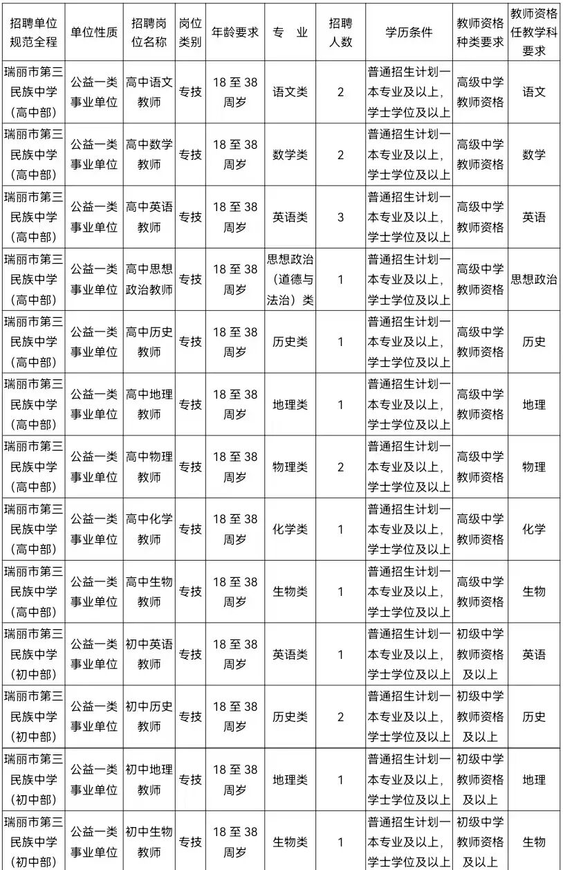 | 招聘公告 根据《德宏州人力资源和社会保障局关于印发2026年教育卫生部门考核招聘紧缺专业学科优秀人才工作方案的通知》(德人社发〔2025〕34号)、《瑞丽市教育体育系统2026年考核招聘紧缺专业学科优秀人才工作方案》文件精神,2026年瑞丽市第三民族中学考核招聘紧缺专业学科优秀人才19名,现将有关事宜公告如下: 一、招聘原则 坚持德才兼备的用人标准,遵循“公开、平等、竞争、择优”的原则,面向社会,公开报名,统一考核,综合评定,择优聘用。 二、聘用岗位及对象 (一)招聘岗位 公开考核招聘紧缺专业学科优秀人才19名,具体招聘岗位及招聘条件如下: ![]() (二)招聘对象 (1)教育部直属师范大学免费应届毕业生。 (2)普通招生计划一本专业及以上学历2024年、2025年、2026年优秀毕业生,所学专业与招聘教学岗位要求相符(未在编在岗,在校期间总体成绩优异,所学专业必修科目无挂科且须在资格复审时提供相应的教师资格证)。 部分岗位要求与上述不一致的,以岗位表所列为准。 三、招聘条件 (1)应聘人员应具备以下条件: ①具有中华人民共和国国籍,遵守宪法和法律; ②拥护中国共产党的领导,具有良好的品行; ③具备招聘岗位所需的学历、专业或任职资格、职业(执业)资格及技能要求; ④具备适应岗位要求的身体条件; ⑤具有岗位所需要的其他条件。 (2)有下列情形之一者不能应聘: ①现役军人; ②在读的非应届毕业生。 (3)有下列情形之一者不得应聘: ①受到党纪、政务处分期限未满或者正在接受纪律审查和监察调查的人员,正在接受司法调查尚未作出结论的人员; ②因犯罪受过刑事处罚的人员、被开除中国共产党党籍的人员、被开除公职的人员、吸毒人员、被依法列为失信联合惩戒对象的人员、在校期间受过院系级以上处分的人员,以及法律法规规定不得招聘为事业单位工作人员的其他情况的人员; ③国家机关、事业单位在职在编工作人员(含试用期); ④在公务员招录或事业单位公开招聘考试中被认定有舞弊等行为,严重违反纪律的人员; ⑤聘用后即构成《事业单位人事管理回避规定》第六条所列情形的人员。 四、招聘程序 (一)发布公告 2025年10月28日,通过瑞丽市第三民族中学微信公众号进行发布。 (二)报名时间、地点及注意事项 1.报名:本次招聘采用网络报名和现场报名的方式进行。 网络报名:2025年10月30日09:00至11月6日24:00 本次招聘可通过向学校邮箱投递简历报名,报名材料命名要求“毕业院校+应聘岗位+姓名+联系电话”。 瑞丽市第三民族中学邮箱:(ruilisanzhong@126.com) 现场报名: ①第一场:2025年11月7日至10日,地点:云南师范大学呈贡校区大学生活动中心; ②第二场:云南省师范类高校毕业生双向选择洽谈会,具体时间和地点根据省教育厅招聘会要求确定。 若第一场已招聘满额,用人单位不再参加第二场招聘会。 2.报名要求: 应聘人员按照本公告的相关要求与各用人学校联系报名。报名时须提供本人的自荐材料(含个人简历信息)、《毕业生就业推荐表》、身份证、毕业证、学位证、教师资格证(2024年、2025年毕业生)、成绩登记表、英语专业的提供英语等级证书、获奖(受表彰)证书等岗位所要求的相关证书材料。2026年的毕业生还须提供学校出具并盖有公章的2026届毕业生证明;2026年毕业的纳入中小学教师资格免试认定改革范围内的教育类研究生和师范生还须提供学校出具的教师资格证办理证明;2026年的非师范类毕业生还须提供《中小学教师资格考试合格证明》。 (三)资格初审 资格初审由各用人学校对应聘人员提供的材料进行审查,初选考核对象。应聘人员务必在提交报名信息材料前认真核对,确保信息无误,凡提交报名信息不准确、不真实的,造成的一切后果由应聘人员自己负责。 (四)现场面试测评 组织专家考核测评,学校严格按照制定通过的测评方案,组织测评专家组5人,按岗位招聘人数1:3的比例择优,确定进入面试人员,达不到比例的,经招聘工作领导小组批准后按实际人数进行面试。通过现场对初选的考核对象从所修学科的成绩、获奖情况、学校推荐就业意见、说课讲课情况等方面进行测评,并填写《测评表》。 (五)面试时间和地点 另行通知。应聘人员须保持电话畅通,无法联系或未按要求按时到场的考生,视为自动放弃面试资格。 (六)面试 面试在监督人员的监督下,采取课堂模拟的方式进行。课堂模拟准备时间为30分钟,课堂模拟时间为15分钟。面试主要考察应聘者适应岗位要求的业务素质与工作能力等,同一岗位使用同一套考题,实行量化打分,面试成绩按100分计算,70分及以上为合格。5位测评专家组的打分,按照要素去掉一个最高分和一个最低分,考生面试成绩为各要素平均分之和(四舍五入保留小数点后两位)。面试成绩未达到最低合格分数线的人员不得参与后续的招聘环节。面试结束当初宣布成绩,同一岗位应聘人员面试成绩相同,出现需要加试情形的则加试一题,以加试成绩高者胜出。 (七)确定拟聘用人员 考核完成后,考核测评专家组向考核招聘单位工作组织汇报测评情况(包括每个考核对象的具体表现、特点、优势、测评成绩、考核测评组意见)。考核招聘单位工作组根据考核测评情况,按测评成绩从高到低的顺序确定拟聘用人员。拟聘用人员与用人单位签订《全国普通高等学校毕业生就业意向协议书》一式三份。 (