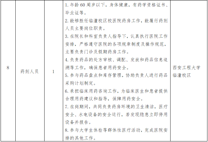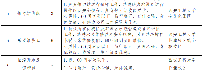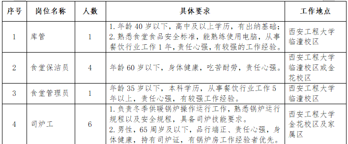 |                一、基本条件 1.具备坚定的政治立场,遵守国家法律和学校的各项规章制度,具有履行岗位职责所需的基本能力。 2.热爱服务工作,服从上级安排,爱岗敬业、吃苦耐劳,品行端正,责任心强,身体健康,无不良嗜好。 二、招聘岗位及具体要求 ![]() ![]() ![]() 三、管理方式及待遇 1.采用劳务派遣方式用工。 2.薪资待遇: (1)自营食堂库管高中及以上学历3500元/月。 (2)临潼校区综合楼一食堂保洁员:3900元/月(2160元/月+超8小时工作时间等津贴1740元)。 工作时间:6:30至21:30,中午13:30至15:00午休,午休期间安排4人值班。 (3)金花校区学生二食堂保洁员:3700元/月(2160元/月+超8小时工作时间等津贴1540元)。 工作时间:早8:00至20:00,中午14:00至16:00休息,安排一人值班。晚上8:00安排一人值班至9:00左右。 (4)临潼校区食堂管理员:工资面议。 (5)司炉工工资标准:5000元/月。 (6)热力站值班工资标准:3500元/月。 (7)采暖维修工工资标准:金花校区4500元/月,临潼校区3500元/月。 用工时间:2025年11月15日至2026年3月15日 (8)临潼开水房值班员:2160元/月。 (9)药剂人员:3000元/月。 四、报名截止日期:2025年11月4日下午17:00时 联系人:范老师 029-81369472(西安工程大学) 余老师 029-85393591(上海外服陕西公司) 扫描二维码提交报名即可 ![]() 标签: 西安工程大学 劳务派遣 岗位招聘 人员招募 教育机构招聘  |
