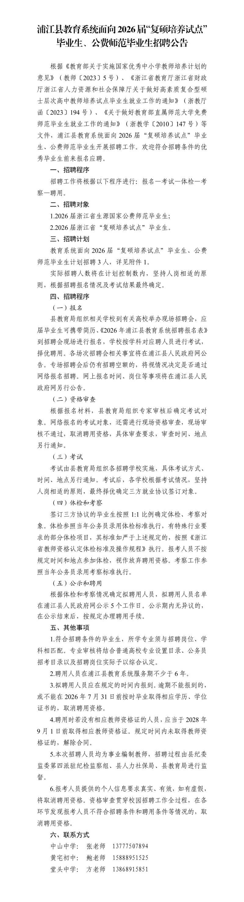 标签: 浦江县教育系统 2026届复硕培养试点 公费师范生 教育系统招聘 毕业生招聘