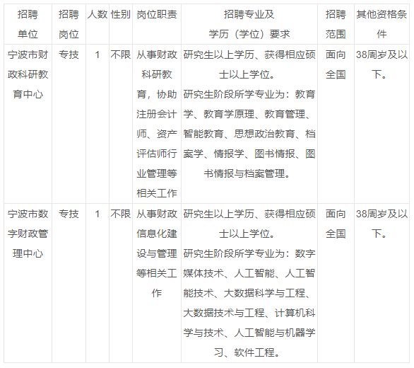 宁波市财政局下属事业单位公开招聘工作人员公告   根据《宁波市事业单位公开招聘工作人员实施办法》有关规定,宁波市财政局下属事业单位宁波市财政科研教育中心、宁波市数字财政管理中心决定面向全国公开招聘事业编制工作人员各1名。现就有关事项公告如下:   一、招聘单位简介   (一)宁波市财政局下属事业单位宁波市财政科研教育中心是宁波市财政局下属公益一类正处级事业单位,经费预算形式为财政全额补助。   主要工作职责是:承担全市财政系统重要课题的调查研究;开展财政科研成果宣传与应用,编辑出版《宁波财税与会计》;承担市注册会计师资产评估行业联合党委日常工作;承担全市注册会计师、资产评估师资格全国统一考试的组织实施;负责注册会计师、资产评估师继续教育工作,开展全市注册会计师、资产评估师行业业务规范的培训与指导;承担全市会计师事务所、资产评估机构以及注册会计师、资产评估师的执业质量检查与服务等。   (二)宁波市财政局下属事业单位宁波市数字财政管理中心是宁波市财政局下属公益一类正处级事业单位,经费预算形式为财政全额补助。   主要工作职责是:协助制订全市财政信息化发展规划,拟订信息化建设管理制度,制订具体实施的技术规划与技术标准;配合做好全市数字财政建设的规划、实施和管理;承担全市财政信息系统应用的技术支撑工作,承担财政业务软件的开发、推广、信息安全和财政数据仓建设;承担全市财政系统广域网的规划建设,制订相应运行管理制度;承担局机关和局属单位信息化项目、信息化基础设施的建设和管理。   二、招聘原则和办法   招聘工作坚持公开、平等、竞争、择优原则,按照德才兼备的用人标准,采取公开报名、统一考试和择优聘用的办法进行,通过笔试、面试、体检和考察等程序面向社会公开招聘事业编制工作人员。   三、招聘对象基本条件   (一)遵守中华人民共和国宪法、法律和法规;   (二)遵守纪律、品行端正,具备良好的职业素质;   (三)具有招聘岗位所需的学历、学位、专业、任职资格、职业(执业)资格及技能要求;   (四)具有适应岗位要求的身体条件;   (五)具备岗位所需的其他条件。   四、招聘岗位、人数、专业、学历和范围及资格条件 ![]()   备注:   1、年龄的计算截止时间为公告发布之日(1986年10月30日(含)以后出生)。   2、2026年普通高校应届毕业生报名时应提供毕业生就业推荐表和《教育部学籍在线验证报告》,并于2026年9月30日前取得学历学位证书,到期未取得的或取得学历学位证书上的学历学位、专业与报考岗位所要求的学历学位、专业不相符的,不予录用;2026年1月1日至2026年12月31日毕业的国(境)外留学回国(境)人员可等同于国内2026年普通高校应届毕业生,报考时仍未毕业的可凭国(境)外学校学籍证明报名,但须在2026年12月31日前取得相应的学历学位证书和教育部留学服务中心出具的国外学历学位认证书,到期未取得的或取得国外学历学位认证书上的学历学位、专业与报考岗位所要求的学历学位、专业不相符的,不予录用。   五、招聘办法和步骤   (一)报名与资格审查   1.报名时间:2025年11月3日9:00至11月7日16:00   2.报名方法:本次考试采取网络报名方式。报考者登录宁波市考试网上报名系统(https://bmxt.nbhr.org.cn/),点击进入“2025年宁波市事业单位第三批集中公开招聘工作人员”,在仔细阅读相关公告信息后,按要求输入个人信息,严格按照招聘所设条件选择岗位进行报名,每位报考者只能选报一个单位一个职位,填报过程中请认真填写报考信息(不如实填写的,取消报名资格)。在网上填写报考信息后,将《宁波市财政局下属事业单位公开招聘工作人员报名登记表》(见公告附件)、身份证、学生证、研究生学历学位证书(2026年普通高校应届毕业生提供毕业生就业推荐表和《教育部学籍在线验证报告》、国(境)外留学回国(境)人员提供教育部留学服务中心出具的国外学历学位认证书或国(境)外院校学籍证明)等材料的扫描件以PDF格式打包发送到邮箱nbsczj_sjh@163.com,发送的报名材料以压缩包形式、以“招聘单位+姓名”命名。逾期不再受理注册及报名。   3.资格初审   时间:2025年11月10日9:00至11月11日16:00   此期间,招聘单位将对应聘人员的报考资格进行初审,应聘人员提供个人信息必须真实有效。初审期间系统不对考生开放。   4.资格审核结果查询并再次报名   时间:2025年11月12日9:00至11月12日16:00   已报名人员登录报名系统查询资格初审结果。通过者不能再报考其他职位;未通过的可再次报名并接受资格初审。   5.缴费确认   时间:2025年11月13日9:00至11月14日16:00   报考人员在规定时间内登录宁波市考试网上报名系统(https://bmxt.nbhr.org.cn/),选择进入“2025年宁波市事业单位第三批集中公开招聘工作人员”,查询初审结果。通过资格初审人员,在规定时间内进行缴费确认,并查询是否完成。未按时缴费确认的,视作自动放弃报考(注:完成缴费才算报名成功)。   笔试考务费标准:50元/科/人(浙价费〔2018〕21号)   报考同一岗位的缴费确认人数与招聘计划数之比不能低于3:1,在规定的缴费确认时间内,符合报考条件的缴费确认人数和招聘计划数比例不足3:1的,取消该岗位招聘。   6.下载打印准考证   时间:2025年12月3日9:00至12月5日16:00   已报名并缴费确认的人员,在