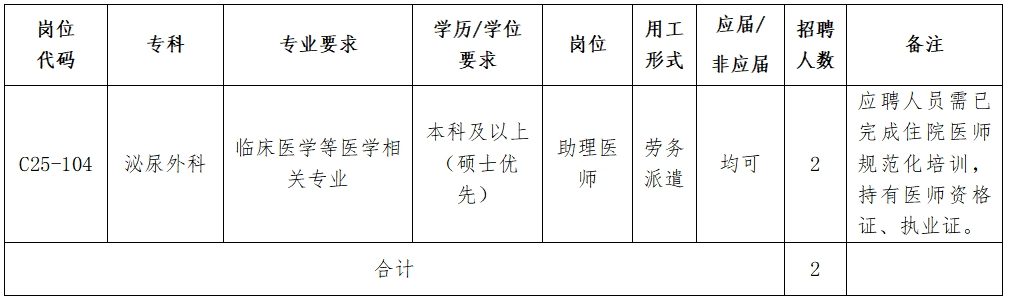 备注:助理医师的主要职责为辅助医师、管理患者、保障诊疗。助理医师需在上级医师指导下,完成医疗文件书写、查房、值班(值班期间按照住院医师权限开立医嘱)、换药拆线、科研辅助、协助手术等临床工作。 三、基本条件和要求 应聘者须具备以下条件: 1.遵守中华人民共和国宪法和法律,忠诚拥护“两个确立”,不断增强“四个意识”、坚定“四个自信”、坚决做到“两个维护”。有较强的事业心和责任心,严谨求实、爱岗敬业。 2.身心健康,工作认真负责,积极主动,有较强的沟通能力和团队协调能力,具有耐心、细心的品质。 3.年龄不超过35周岁,应往届均可。 四、招聘程序与时间安排 (一)受理报名,凡应聘我院岗位者,需提交如下材料: 1.《中山大学孙逸仙纪念医院应聘人员情况表》(请点击附件下载); 2.个人简历; 3.已取得的所有毕业证和学位证(按大专、本科、硕士、博士顺序排列,应届毕业生附上毕业生推荐表、成绩单)及各类资格、获奖证书等业绩材料。 请将上述应聘材料电子版按顺序整合成一个PDF文件,文件名按“岗位代码+泌尿外科助理医师岗位+毕业学校+学历+专业+姓名”命名,并通过电子邮件附件发送至zseyhr@163.com,邮件主题注明“应聘岗位代码+泌尿外科助理医师岗位+姓名”。不接收纸质简历投递,未按要求提交应聘简历者,将取消应聘资格。 报名时间:2025年11月3日-2025年11月14日 (二)资格审查 (三)用人科室初试 (四)面试 (五)体检及考察 (六)人力资源部审批 (七)聘用 五、聘用和待遇 (一)一经聘用,第三方劳务派遣公司与聘用者签订签订劳动合同,并购买社会保险及住房公积金。 (二)薪酬待遇按医院规定执行。 (三)按照国家的规定享受年假。 六、其他说明 (一)若应聘人员不符合招聘岗位需求,招聘单位可不确定人选,并可申请该岗位再次招聘。 (二)本次招聘人员定岗在花都院区泌尿外科五区工作。 (三)本次招聘岗位工资绩效全部由花都院区泌尿外科五区绩效承担。 联系地址:广州市越秀区沿江西路107号中山大学孙逸仙纪念医院人力资源部(邮编:510120) 联系人:苏老师、吴老师联系电话:020-81332510 E-MAIL:zseyhr@163.com 附件:中山大学孙逸仙纪念医院应聘人员情况表(2025版)_4.doc 标签: 中山大学孙逸仙纪念医院 泌尿外科 助理医师 岗位招聘 医师招聘 |