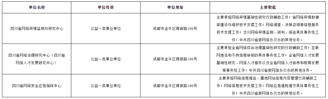 中共四川省委网信办直属事业单位2025年公开选调工作人员公告 因工作需要,中共四川省委网信办直属事业单位四川省网络舆情监测与研究中心、四川省网络治理研究中心(四川省网信人才发展研究中心)、四川省网络安全应急指挥中心计划面向川渝两地公开选调工作人员7名。根据《四川省事业单位工作人员流(调)动试行办法》等有关规定,公告如下。 一、公开选调范围、岗位和条件 (一)公开选调单位基本情况 ![]() (二)公开选调范围、岗位及基本条件 1. 选调范围 川渝两地各级党政群机关公务员、参照公务员法管理人员;川渝两地各级各类型事业单位在编在岗人员;中央在川渝两地单位(包括垂直管理单位、派出单位等)在编在岗机关事业单位人员。 报名时,中共四川省委网信办机关及直属事业单位的在编在岗工作人员,不属于本次选调对象范围。 2. 选调岗位 本次选调涉及中共四川省委网信办3个直属事业单位,共7个选调名额,其中:四川省网络舆情监测与研究中心管理八级及以下岗位1名,四川省网络治理研究中心(四川省网信人才发展研究中心)管理八级及以下岗位1名、专业技术十级及以下岗位2名,四川省网络安全应急指挥中心管理八级及以下岗位3名。 3. 选调基本条件 报考人员应具备如下条件。具体岗位和选调条件详见附件《中共四川省委网信办直属事业单位2025年公开选调工作人员岗位和条件要求一览表》(以下简称《一览表》)。 (1)报考人员应同时具备以下条件: ①中共党员(含预备党员),政治立场坚定,政治素质过硬,道德品行良好。 ②在机关事业单位工作期间年度考核均为称职(合格)及以上等次(试用期不确定等次情况不含在内),并符合《四川省事业单位工作人员流(调)动试行办法》等有关规定。 ③年龄应当符合《一览表》各岗位要求。 ④具有较强的政策理论水平、专业素养和业务能力。 ⑤身心健康,具有正常履行职责的身体条件和心理素质。 ⑥符合法律、法规规定和职位要求的其他资格条件。 凡涉及年限(如年龄、最低服务年限、其他工作经历年限、任职经历年限等,以及选调岗位要求的学历学位、工作经历、政治面貌等其他条件取得时间)的计算时间均截至2025年11月14日。 (2)具有下列情形之一的,不得报考: ①通过公开招聘试用期未满的,以及不约定试用期或试用期满但在原单位工作不满1年的。 ②尚在国家、四川省和重庆市规定最低服务年限内的。 ③公务员或参照公务员法管理人员在机关工作不满5年的;乡镇事业单位工作人员在公开招聘单位服务不满5年的。 ④因涉及工作秘密、工作延续性等不宜流(调)动的。 ⑤人事档案中身份、年龄、工龄、党龄、学历、经历等存疑尚未查清的。 ⑥涉嫌违纪违法正在接受有关部门审查调查尚未作出结论的,以及受到诫勉、组织处理或者党纪政务处分等影响期未满或期满影响使用的。 ⑦按照中共中央组织部、人力资源社会保障部《事业单位人事管理回避规定》应当回避的。 ⑧不符合相关政策规定的其他情形。 二、选调程序 (一)报名 每位报考人员在本次公开选调中仅限报考一个岗位。 本次选调采用网络方式报名,报名网站:四川省人力资源和社会保障厅官网“人事人才测评服务”专栏(https://www.jdpta.com),报名时间为2025年11月14日9:00至11月28日17:00。报名及资格初审按以下程序进行。 1. 报考人员登录报名网站,按网络提示完成注册(已注册的可直接登录报名),按系统提示上传近期免冠证件照片(JPG格式,须使用“照片处理工具”处理后方可上传),点击“网上报名”处选择相应考试项,填写《中共四川省委网信办直属事业单位2025年公开选调工作人员报名登记表》(以下统称《报名登记表》)。报考人员应认真对照报考职位要求的资格条件,真实、准确、完整填报《报名登记表》。资格审查会对报名各项信息进行真实性核实,凡隐瞒真实信息、弄虚作假的,一经查实取消报考资格或者选调资格,且3年内不得报考。 2. 报考人员需上传本人独立或主笔撰写的文稿2篇(按公文格式排版,文稿首页须有本人署名,超出2篇无效)。 (二)资格初审和择优比选 2025年12月9日17点前,对报考人员进行资格初审和比选。笔试开考比例为3:1,符合报考资格条件人员人数未达到岗位开考比例,取消或调减该岗位数量。在资格初审合格的情况下,通过比选报考人员工作经历、文稿质量、专业背景、表彰奖励等,按照不低于3:1不超过20:1的比例综合研判择优确定参加笔试人员。 报考人员请在2025年12月10日10:00至12月15日18:00期间,及时登录报名网站查看审核结果,显示“审核通过”代表通过资格初审和比选。 (三)笔试 考试分为笔试和面试。 打印笔试准考证。资格初审和比选通过的考生,在2025年12月16日至12月19日登录四川省人力资源和社会保障厅官网“人事人才测评服务”专栏打印本人准考证,并于考试当天持本人准考证和有效居民身份证(过期身份证、身份证复印件不得作为参考证件)到指定考点参加笔试。 笔试。笔试由中共四川省委网信办统一组织,主要测试应试者的政策理论水平、分析和解决实际问题的能力、文字表达能力等综合素质,满分为100分。具体时间、地点见准考证。缺考笔试科目或者笔试科目成绩为0分的报考人员,视作自动放弃报考资格。笔试成绩低于60分的,不能进入下一环节。 (四)资格复审 笔试结束后,根