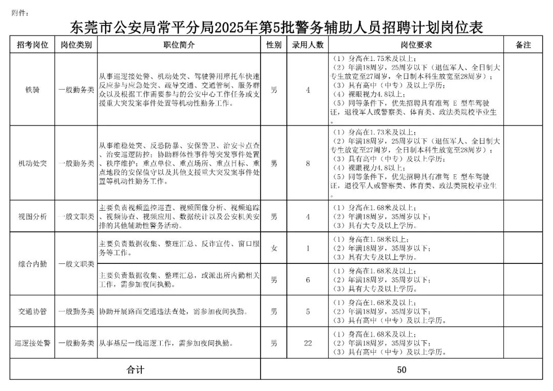 东莞市公安局常平分局2025年第5批警务辅助人员招聘公告 根据《广东省公安机关警务辅助人员管理办法》有关规定,按照“公开、平等、竞争、择优”的原则,我分局决定面向社会公开招聘警务辅助人员(简称辅警),现将有关事项公告如下: 01招录计划 本次招聘人员为履行《广东省公安机关警务辅助人员管理办法》规定的辅助性警务职责的人员,不具有人民警察身份。招聘人员工作地点在东莞市(日常在常平镇),工作时间根据任务安排确定,需服从管理,能接受常态化体能训练、紧急召回、24小时值班备勤、轮值夜班、节假日值班、离莞出差、一线执勤、岗位调配等安排。 本次招聘共设置6个岗位,计划招聘50人,具体招聘岗位、人数、资格条件等详见《东莞市公安局常平分局2025年第5批警务辅助人员招聘计划岗位表》(附件)。 ![]() 02招聘条件 (一)报考辅警应当具备下列资格条件: 1.具有中华人民共和国国籍,拥护中华人民共和国宪法,遵守国家法律法规和社会公德,品行端正; 2.年满18周岁,不超过35周岁,其中铁骑岗位、机动处突岗位为25周岁以下(退伍军人、全日制大专生放宽至27周岁,全日制本科生放宽至28周岁),年龄计算截止时间为公告发布之日; 3.具有国家承认的高中(中专)及以上文化程度,其中文职类岗位需具有国家承认的大学专科及以上学历,专业性较强的岗位应当获得岗位需要的专业资质或者专业技能,报考人员须于报名首日前取得相应毕业证书、学位证书、专业证书、技能证书; 4.具备履行岗位职责所需的身体素质、心理素质和工作能力:身体健康,体型端正(无肢体功能障碍,无不能自行矫正的斜颈、步态异常等情况),无色盲、无纹身、无残疾、无传染性疾病、无癫痫、无心脏病、无影响面容且难以治愈的皮肤病(白癜风、银屑病、血管瘤、斑痣等)或其它急发性重大疾病; 5.男性体重指数(BMI)介于17.3与27.3之间,女性体重指数介于17.1与25.7之间〔体重指数(BMI)的计算公式为体重(千克)÷身高(米)的平方〕,运动健身体质等特殊情形可适当提高上限; 6.具备招聘岗位所要求的其他资格条件; 7.同等条件下,优先招聘公安烈士和因公牺牲公安民警的配偶子女、在职公安民警配偶子女、退役军人、见义勇为积极分子和先进个人、警察类或政法类院校毕业生。 (二)具有下列情形之一的人员,不得招聘为辅警: 1.本人或家庭成员、主要社会关系人参加非法组织、邪教组织或者从事其他危害国家安全活动的; 2.本人家庭成员或主要社会关系人正在服刑或正在接受调查的; 3.受过刑事处罚或者涉嫌违法犯罪尚未查清的; 4.编造、散布有损国家声誉、反对党的理论和路线方针政策、违反国家法律法规信息的; 5.因吸食、注射毒品,卖淫、嫖娼,赌博或为赌博提供条件等涉及“黄赌毒”违法行为受到处罚的; 6.被行政拘留、司法拘留或收容教育的; 7.被吊销律师、公证员执业证书的; 8.被开除党籍、公职、军籍或者因违纪违规被辞退解聘的; 9.从事警务辅助工作合同期未满擅自离职的; 10.有较为严重个人不良信用记录的; 11.有精神病史的; 12.其他不适宜从事警务辅助工作的。 03招聘程序 01网上报名 报考人员请于2025年11月25日12:00前登录“平安常平”微信公众号进行网上报名,根据系统提示填写相关资料并上传附件,如因未提供相关资料或附件导致资格初审未通过,视为放弃报名。 常平公安分局2025年 公开招聘警务辅助人员 ↓↓报名入口↓↓ ![]() 识别二维码进入链接报名 02现场复核 ![]() 网上报名初审通过后,报考人员本人于2025年11月27日9:00-12:00携带以下资料到常平分局机动队(地址:地图搜索常平特警大队)参加现场资格复核: 1.近期一寸白底彩色免冠正面照片3张; 2.身份证原件和正反面复印件; 3.户口本原件和首页、户主页、本人页的复印件,直系亲属信息情况(户口本或户籍证明的复印件、扫描件或电子照片等户籍资料,姓名、称谓、政治面貌、身份证号码、学习/工作单位及职务等信息,亲属成员包括祖父母、外祖母、父母、亲生兄弟姐妹、配偶、配偶父母、子女,已故人员亦需提供姓名及身份证号,方便填写报名); 4.最高全日制学历及最高在职学历的毕业证、学历验证报告、学位证、学位验证报告的原件和复印件(大专及以上学历学位需打印在线验证报告、电子注册备案表,高中、中专学历由属地教育或人社部门出具学历证明,证明需留下出具方的联系人和联系电话); 5.退伍士兵需退伍证原件和复印件; 6.驾驶证原件和复印件; 7.个人信用(征信)报告(可到银行出具或登录中国人民银行征信中心〔http://www.pbccrc.org.cn〕个人信用信息服务平台下载打印,如有逾期情形的须到银行打印明细); 8.现场查询社保缴费记录; 9.现场查询出入境记录(可登录“移民局12367”微信小程序查询); 10.无违法犯罪记录证明(可登录“粤省事”微信小程序申请出具,户籍地不在广东的,可到户籍地公安部门开具); 11.国有单位在职人员报考须征得工作单位同意,并出具书面证明; 12.现场填写《东莞市公安机关警务辅助人员招聘报名表》; 13.现场填写《应聘公安机关警务辅助人员承诺书》。 以上资料第2至第6项需提供复印件各1份,原件检查后归还本人;第1项、第7至13项收取原件。 未按要求参加现场资格复核、资格复核结果不通过或未签订《应聘公安机关警务辅助人员承诺书》的,不予通知考试具体事宜。