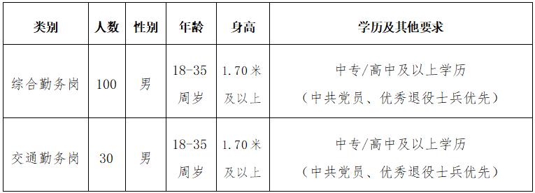 三河市公安局关于公开招聘警务辅助人员的公告 为充分利用社会优质人力资源,提高行政效能,维护三河社会治安秩序持续稳定,加大社会面巡防管控力度,提高群众的安全感和满意度,根据实际工作需求,按照三河市人民政府办公室关于印发《三河市公安机关警务辅助人员管理办法》(三政办〔2023〕1号)的规定要求,三河市公安局现面向社会公开招聘130名警务辅助人员。 一、招聘原则 坚持德才兼备、以德为先的用人标准,按照公开、公平、公正、择优录取的原则实施招聘工作。 二、招聘人员性质、任务 (一)招聘人员性质 所有招聘人员均为劳务派遣人员。 (二)招聘人员任务 三河市公安局警务辅助人员,配合民警开展警务辅助工作。 三、招聘岗位和条件 ![]() 基本条件: 1、具有中华人民共和国国籍(户籍地不限),拥护中华人民共和国宪法,遵守国家法律法规,品行端正; 2、热爱公安工作,具有一定法律法规和工作基础知识的人员优先,中共党员、优秀退役士兵优先; 3、招录年龄限制:18周岁以上,35周岁以下(2007年11月29日至1989年11月29日出生,大专学历及以上可放宽至38周岁即1986年11月29日以后出生); 4、综合勤务岗和交通勤务岗应具备中专/高中及以上学历; 5、吃苦耐劳,身心健康,体貌端正,服从组织工作安排,无残疾、无色盲、无口吃、无传染病、无文身、无吸毒史、无家族精神病遗传病史等,单侧裸眼视力均应在4.8以上,或单侧矫正视力均应在5.0以上,身高1.70米以上(含1.70米),并且具备履行职责的身体条件和工作能力;过于肥胖或消瘦者,不能录用; 判定过于肥胖或消瘦者按以下方法: 实际体重超过标准体重40%以上者为过于肥胖; 实际体重低于标准体重15%以上者为过于消瘦。 标准体重计算方法: 标准体重(千克)=身高(厘米)-110。 超出和低于标准体重的百分数计算方法: 〔实际体重(千克)-标准体重(千克)〕÷标准体重(千克)×100%。 6、体能、体检和政审参照人民警察招录条件; 7、本人未与其他单位签订任何劳动合同或确立劳动关系; 8、法律法规规定的其他条件。 有下列情形之一的人员不得报考: 1、本人或者家庭成员参加非法组织、邪教组织或者从事其他危害国家安全活动的; 2、本人受过刑事处罚或者涉嫌违法犯罪尚未查清的;直系血亲或对本人有重大影响的旁系血亲中有被判处死刑或正在服刑的; 3、编造、散布有损国家声誉、反对党的理论和路线方针政策、违反国家法律法规信息的; 4、曾因黄、赌、毒、盗窃、诈骗、酒醉驾、故意伤害等违法行为被行政处罚的; 5、曾被行政拘留、司法拘留的; 6、被吊销律师、公证员执业证书的; 7、被开除公职、开除军籍或者因违法违规被辞退解聘的;受过党内严重警告以上或行政记过以上处分的; 8、从事警务辅助工作合同期未满擅自离职、开除、辞退、退工的; 9、有较为严重的个人不良信用记录以及被依法列为失信联合惩戒对象的; 10、国家、省、市以及公安机关规定的其他不适宜从事警务辅助工作的。 四、招聘程序 招聘工作由三河市公安局委托第三方具体组织实施,按照网上报名与资格初审、身高测量、笔试、体能测试、面试、资格复审、政审考察、体检、毒检、公示、集训、递补调剂、录用等步骤实施。 (一)报名及资格审查 1、本次公开招聘实行网络报名 报名时间:2025年11月29日9:00--2025年12月8日17:00。 网络报名:电脑登录网址https://zhaokao.caidaocloud.com/rp-web/#/index/11475按要求进行报名。 网络报名所需证件电子版材料: (1)个人小2寸免冠蓝底彩色照片; (2)有效居民身份证; (3)毕业证书; (4)学信网电子注册备案表(有效期内); (5)军人退伍证或退役军人优待证; (6)中共党员党组织证明材料; (7)个人征信报告; (8)体侧免责声明(招聘网址自行下载); (9)特殊技能、专业特长相关证明等材料。 2、资格初审 资格初审时间:2025年11月29日9:30--2025年12月8日17:00。报考人员提交的申请,在报名提交24小时内审核完毕,初审结论将会在报名网站显示。报名时间截止后未通过审查的,不能再次提交报名。 3、缴费确认 通过资格初审的报考人员,请于2025年11月30日9:00--2025年12月8日17:00。在报名网站进行确认缴费(笔试报名费每人100元)。最低生活保障家庭人员凭相关证件、证明办理减免考务费用手续(办理减免考务费请咨询0316-3212055)。 4、打印准考证 资格初审通过后缴费成功的报考人员请于2025年12月9日8:30--2025年12月10日17:30。在报名网站下载《笔试、体能测试准考证》,打印准考证,并按准考证要求携带相关证件参加考试。未在规定时间内完成考前准备的人员将被视为自动放弃考试资格。 (二)考试 考生应按照准考证载明的时间和考试地点参加考试。参加考试时,考生须持准考证、法定有效的身份证件参加考试,缺少证件的考生不得参加考试。 1、身高测量与笔试 (1)身高测量与笔试同步进行,首先进行身高测量,身高合格者进入考场参加笔试。身高测量与笔试考试时间和地点:详见《笔试、体能测试准考证》。 身高测量时间:2025年12月11日上午8:00-9:30,地点:三河市职教中心。 笔试考试时间:2025年12月11日上午10:00-11:30,地点:三河市职教中心。 (2)笔试采取闭卷考试方式进行,考试时间为90分钟,满分100分,试卷为一张试卷。考试内容参照公安类公务员考试内容:职业素养、基本能力和相关法律基础知识。笔试不指定考试用书,不举办也不委托任何