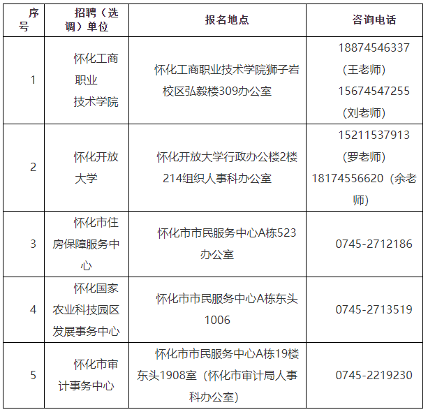 怀化市部分市直事业单位2025年下半年集中公开招聘、公开选调工作人员公告 为进一步建设怀化高素质专业化事业单位干部人才队伍,根据《事业单位人事管理条例》(国务院令第652号)《关于进一步做好事业单位公开招聘工作的通知》(人社部发〔2024〕57号)《湖南省事业单位公开招聘人员办法》(湘人社规〔2025〕1号)和《关于进一步规范机关事业单位人员流动调配工作的意见》(湘组发〔2015〕26号)等相关文件要求,结合我市事业单位工作需要,面向社会公开招聘,面向全市范围内公开选调一批市直事业单位工作人员。现将相关事项公告如下: 一、招聘及选调原则 (一)坚持德才兼备、以德为先的用人标准; (二)坚持公开、平等、竞争、择优的原则; (三)坚持工作需要、人岗相适,注重综合能力和专业知识相结合。 二、招聘岗位条件 (一)基本条件 1.具有中华人民共和国国籍; 2.遵守中华人民共和国宪法和法律,拥护中国共产党领导和社会主义制度; 3.具有良好的政治素质和道德品行; 4.具备岗位所需的专业或者技能条件; 5.适应岗位要求的身体条件和心理素质; 6.岗位所需要的其他条件。 (二)应聘人员有下列情形之一的,不得报名: 1.曾因犯罪受过刑事处罚的人员; 2.曾被开除中国共产党党籍、被开除公职的人员; 3.尚未解除党纪、政务、事业单位工作人员处分或者正在接受纪律审查和监察调查的人员; 4.涉嫌违法犯罪正在接受司法调查尚未作出结论的人员; 5.在各级各类事业单位公开招聘中因违反《事业单位公开招聘违纪违规行为处理规定》被记入事业单位公开招聘应聘人员诚信档案库,且在记录期限内的人员; 6.按照《事业单位人事管理回避规定》等应当执行回避制度的人员; 7.现役军人; 8.在读高校非2025届毕业生(指2026年及以后毕业的毕业生,研究生不能以本科学历报考,其他情形以此类推); 9.有吸毒史的人员; 10.法律、政策规定不得聘用为事业单位工作人员的其他情形的人员。 三、选调岗位条件 (一)选调范围 全市党政机关、事业单位具有公务员(参公)身份或全额拨款事业单位人员身份,且在编在岗工作人员(工勤岗位人员除外)。公务员(参公管理)身份考生选调后一律聘用到事业岗位,服从用人单位的聘用安排。 (二)选调人员的资格条件 1.具有中华人民共和国国籍; 2.遵守中华人民共和国宪法和法律,拥护中国共产党领导和社会主义制度; 3.具有良好的政治素质和道德品行; 4.具备岗位所需的专业或者技能条件; 5.适应岗位要求的身体条件和心理素质; 6.近三年或入职以来年度考核均为称职(合格)及以上等次; 7.在现工作单位或新提任现职务(职级)满1年的; 8.符合选调岗位的其他报考要求(详见附件1)。 (三)有下列情形之一的人员,不得报名: 1.在试用期内或未满最低服务年限的; 2.违规进入机关事业单位、违规取得相应身份尚未作出处理的; 3.曾受到组织处理或党纪政务处分的,因犯罪受过刑事处罚的或曾被开除公职的; 4.涉嫌违纪违法正在接受有关部门审查调查尚未作出结论的; 5.存在违规破格提拔、突击提拔等违反干部选拔任用政策规定尚未作出处理的; 6.在现工作单位或新提任现职务(职级)未满1年的; 7.近三年或入职以来年度考核未达到称职(合格)及以上等次; 8.有吸毒史的人员; 9.法律法规规定的其他情形。 四、招聘和选调岗位、计划及具体要求 此次招聘、选调岗位合计16个,计划20名。其中,公开招聘岗位13个,招聘计划17名;选调岗位3个,选调计划3名。岗位具体招聘、选调计划及专业等要求见附件1,其中: (一)30周岁及以下是指1994年12月17日以后出生,38周岁及以下是指1986年12月17日以后出生,45周岁及以下是指1979年12月17日以后出生; (二)岗位所要求的工作经历应为全职工作经历,工作年限按足年足月累计计算,工作经历计算截止到2025年12月17日。在全日制学校就读期间参加社会实践、实习、兼职、见习等不能视为工作经历。 (三)应聘人员的学历(学位)必须为国家承认的学历(学位),出国留学人员学历应通过教育部相关部门的学历认证。 (四)报考人员的专业应严格按照毕业证书填写,专业要求参照《湖南省2025年考试录用公务员专业指导目录》(附件)执行。所学专业已列入《湖南省2025年考试录用公务员专业指导目录》但未列入招聘岗位专业要求的,不符合报考条件;留学归国等应聘人员所学学科专业与资格条件要求的学科专业相近但不在《湖南省2025年考试录用公务员专业指导目录》的,用人单位及主管部门结合所学课程、研究方向等进行审查认定,报事业单位人事综合管理部门。 五、招聘(选调)程序 (一)发布公告 本次考试各环节的公告、公示均在怀化人事考试网发布。报考人员务必及时关注怀化人事考试网发布的公示与通知,特别要关注报名、岗位计划调整、笔面试时间及成绩公布、体检、考察等重要信息,及时了解相关情况。若因本人不及时关注相关信息,造成的后果,责任自负。 (二)报名 1.报名方式:须本人现场报名。 2.报名时间:2025年12月22日-12月26日(上午8:00-12:00,下午14:30-17:30,仅工作日接受报名) 3.报名地点: ![]() 每人限报一个岗位,报考人员须认真阅读招聘公告及附件,慎重、理性报考符合条件的岗位,报名确认后不得修改报名信息和报考岗位。 4.公开招聘岗位报名应提交材料如下: (1)《湖南省事业单位公开招聘人员报名表》(附件2,承诺栏需手写签