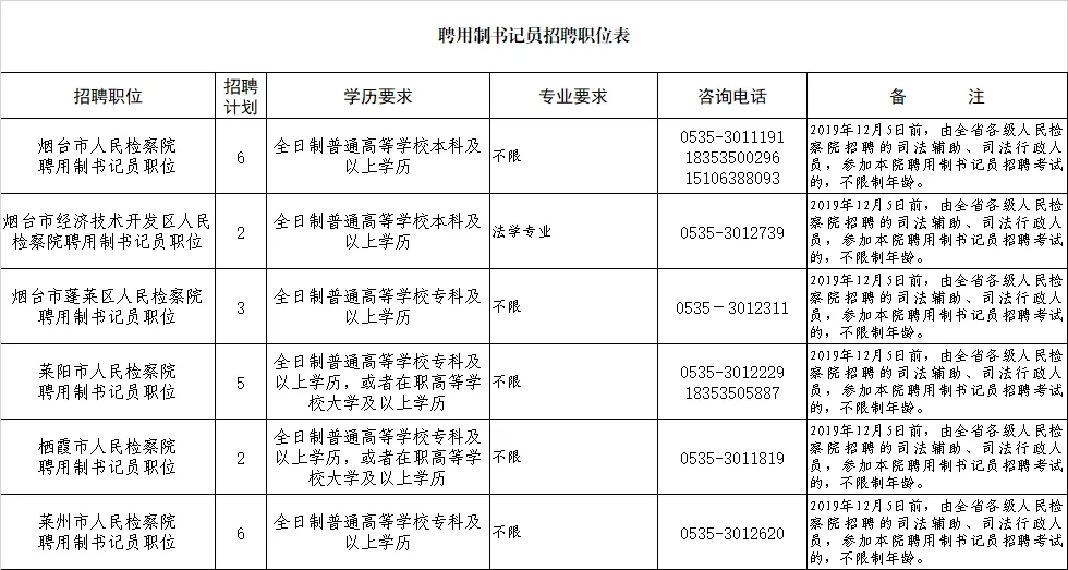 关于为烟台市检察机关公开招聘聘用制书记员的公告 受烟台市人民检察院委托,为烟台市检察机关招聘聘用制书记员24名。现将有关事项公告如下: 一、报考条件 (一)报考人员应当具备以下条件 1.具有中华人民共和国国籍; 2.拥护党的理论和路线方针政策,具有良好的政治、业务素质,品行端正; 3.年龄在18周岁以上,30周岁以下(1994年12月至2007年12月期间出生); 4.具有全日制普通高等学校专科及以上学历,或者在职高等学校大学及以上学历; 5.熟悉掌握法律基本知识; 6.具有岗位必需的业务技能; 7.身体健康、具备正常履行职位职责的身体条件; 8.符合招聘检察院的其他资格和条件。 (二)有下列情形之一的不予招聘 1.因犯罪受过刑事处罚的人员; 2.被开除中国共产党党籍的人员; 3.曾被开除公职或被辞退的人员; 4.被列为失信联合惩戒对象的人员; 5.涉嫌违纪违法正在接受有关专门机关审查尚未作出结论的人员; 6.受处分期间或者未满影响期限的人员; 7.现役军人,在读的全日制非应届毕业生; 8.父母、配偶在招聘检察院辖区内以律师身份担任诉讼代理人、辩护人,或者为诉讼案件当事人提供其他有偿法律服务的; 9.与招聘检察院政法专项编制人员有夫妻关系、直系血亲关系、三代以内旁系血亲关系、近姻亲关系的; 10.具有其他不适宜担任聘用制书记员情形的人员。 二、报名程序 (一)职位查询 招聘职位、招聘人数、资格条件等详见《聘用制书记员招聘职位表》(附件)。报考人员如需咨询资格条件等有关事项,可通过《聘用制书记员招聘职位表》公布的咨询电话联系。报考人员如需咨询报名系统技术方面问题的,可以通过报名平台技术咨询电话联系(联系方式附后)。 (二)网上报名 报名主要采取网上报名的方式进行,报名网址: http://ytw.bm.cptae.com/tip。 网上报名按以下程序进行: 1.提交报名申请。报考人员可在2025年12月20日9:00至12月26日16:00期间登录报名平台,提交报名申请。每名报考人员限报考1个职位,在资格初审前多次提交报名信息的,后一次填报自动替换前一次填报信息。报名人员应当仔细阅读《报考诚信承诺书》,提交的报考申请材料应当真实、准确、完整。报考人员提供虚假报考申请材料的,一经查实,即取消报考资格。 2.查询报名审查结果。报考人员可于2025年12月20日11:00至12月27日16:00期间登录报名平台查询是否通过报名审查。通过审查的,不能再报考其他单位;未通过审查的,可在规定时间内改报其他单位。2025年12月26日16:00以后,报名申请未审查或者未通过资格审查的,不能再修改报名申请材料和改报其他职位。 资格审查贯穿招聘工作全过程。在招聘各环节发现报考人员不符合报考资格条件的,均可以取消其报考资格或者录用资格。 3.报名确认。招聘单位于2025年12月27日16︰00前完成资格初审工作。报考人员通过资格初审后,应于2025年12月20日11︰00至12月28日16︰00登录报名平台进行网上缴费确认。报考人员应缴纳考试组织服务费,每人50元。逾期不办理网上缴费确认手续的,视作放弃报考资格。 4.打印报名资料和准考证。报名成功后,报考人员应登录报名平台,及时打印《聘用制书记员报名登记表》,打印并签署《报考诚信承诺书》等报名资料(以上材料在面试前资格审查时提供),并于指定时间登录报名平台打印笔试准考证。准考证打印时间,另行发布公告。 5.招聘计划核减及职位改报。最终缴费确认人数达不到计划招聘人数3倍的招聘职位,按比例相应核减或取消录用计划。 取消招聘计划职位的报考人员,可于规定时间内登录报名平台改报其他单位。 三、考试 (一)笔试 1.内容。笔试内容分为基础知识测试和岗位技能测试两项,采取上机考试方式进行,使用台式电脑、标准键盘,满分均为100分。 基础知识测试包括客观题和主观题,考试时间为120分钟,主要考察考生的法律基础知识、时事政治、判断推理能力等。岗位技能测试主要考察考生在规定时间内的打字速度及正确率,考试时间为15分钟。 2.时间地点。笔试时间另行发布公告。 报考按照准考证上确定的时间和地点,同时携带准考证和本人有效居民身份证(与报名时一致)参加考试。 3.成绩查询。按照基础知识测试成绩占80%,岗位技能测试成绩占20%的比例计算笔试成绩,笔试成绩满分100分,保留小数点后2位。 报考人员可登录报名网站查询本人笔试成绩、排名及进入下一环节情况。笔试成绩查询时间另行公告。 (二)面试 笔试结束后,按照面试人数与招聘计划3:1的比例,根据笔试成绩从高到低的顺序,确定各职位参加面试的人选。 面试前,组织面试人选资格复审,确定参加面试的人员。报考者须按照指定的时间、地点和规定要求,参加资格复审。资格复审合格的,领取《面试通知书》。凡与报考条件不符、不能提供规定证件材料的,不在规定时间接受资格复审的,取消其进入下一环节资格,出现入围人选缺额的,在规定时间内等额递补。资格复审时间另行公告。 面试采取结构化面试形式,采取百分制计分办法。面试成绩在本场面试结束后采取适当方式向面试人员公布。 考试结束后,报考人员总成绩按笔试、面试成绩分别占40%、60%的比例百分制计算(保留小数点后2位,尾数四舍五入),并在烟台市人民检察院网站上发布。 四、考察和体检 根据招聘计划,按照考试总成绩从高到低的顺序,等额确定各单位进入考察范