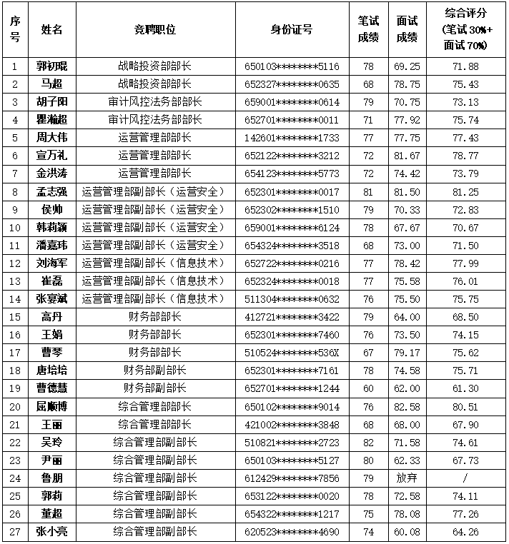 新疆恒泰智慧能源股份有限公司中层管理岗位竞聘进入面试环节共计27人,现将笔试、面试综合成绩进行公示,公示期自2025年12月24日至12月28日。 一、综合考评成绩为笔试30%+面试70%。面试评分:公司竞聘考核领导小组占比50%,外部专家评委占比50%。