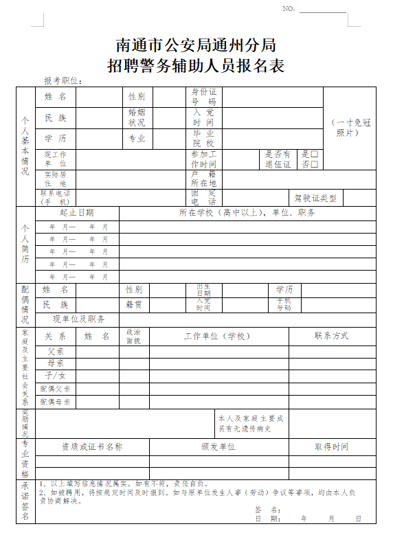 南通市公安局通州分局警务辅助人员招聘简章 为提升公安机关维护社会稳定、服务经济发展的水平,进一步提高公安机关应急处突和快速反应能力,南通市公安局通州分局现面向社会公开招聘46名辅警。现将有关事项公告如下: 一、招聘岗位、人数及岗位要求 ![]() ![]() 每个报考人员限报1个岗位。 二、应聘条件 1、政治素质好,正义感强,工作积极,有较强的责任心和事业心,品行端正,服从管理,能够从事夜班,服从岗位调配。 2、本人无违法犯罪记录,无个人不良信用记录,本人或家庭成员、近亲属未被判处过刑罚、未参加非法组织、邪教组织或从事其他危害国家安全活动,无其他不适合从事警务辅助工作的情形。 3、身体健康,五官端正,女性身高1.60米以上,男性1.70米以上,无伤残、口吃、重听、色弱、色盲、传染性疾病等,能胜任警务辅助工作。 4、公安、司法学校毕业,计算机操作水平达到中级以上,普通话水平二级甲等以上,英语水平四级以上优先。 三、报名时间 2025年12月25日至2026年1月8日(休息、节假日除外)。 上午:9:00-11:00;下午:14:00-17:00 四、报名方式 现场报名时须本人到场,携带本人身份证、户口簿、学历证明等原件、复印件(全部用A4纸复印)、个人征信报告1份、2张一寸免冠照片,本科学历需附加提供“中国高等教育学生信息网”报告一份。报名时本人现场填写《南通市公安局通州分局招聘警务辅助人员报名表》。(在学习、工作期间获得的相关荣誉证书原件及复印件一并附上,作为参考) 五、聘用程序和方法 1、资格审查:对所有报名人员进行资格审查。经初审合格后确定参加理论测试、体能测试人员名单。 2、理论测试内容:时事政治、法律基础知识、语文基础知识及公文写作(勤务辅警可不组织)。 理论测试时间、地点:另行通知。 3、体能测试 体能测试主要项目:1000米跑、100米跑、单杠、双杠、立定跳远。总分100分,每项占20分,评分标准参考《公安机关人民警察体育锻炼达标标准》执行。(文职辅警可不组织)。 体能测试时间、地点:另行通知。 4、面 试:理论测试、体能测试成绩达标(理论不得低于60分,体测不得低于50分)者进入面试(遇达标人数不足招聘人数3倍的情形,按测试成绩递补至招聘人数3倍面试)。 面试时间、地点:另行通知。 面试内容:由面试者介绍本人基本情况,回答相关提问。 5、体 检:按照理论测试、体能测试与面试3:4:3的比例,对综合成绩列前者进行体检。如有体检不合格的,按高分到低分依次递补。 6、考 察:对体检合格者由户籍所在地、实际居住地派出所进行政审考察,政审考察合格者办理聘用手续。 六、用工性质及待遇 通州分局警务辅助人员性质为劳务派遣,聘用后依法签订劳务合同,同时参加岗前培训,试用期为两个月,试用期间不符合工作要求的,依法退回劳务派遣公司解除劳务合同;培训合格、试用期满并考察合格的正式聘用,在通州分局各用辅部门工作。 工资待遇按政府相关标准执行,并按规定缴纳养老、医疗等保险及住房公积金。 最低服务年限一年,否则将按违约处理。 七、纪律与监督 招聘工作坚持“公开、平等、竞争、择优”的原则,全过程接受纪检监察和社会监督,一经发现并查实不符合本公告规定以及徇私舞弊、弄虚作假的,即取消聘用资格。被聘用人员自动放弃入职的,按总成绩从高分到低分一次性递补。 招聘工作不设任何代办机构,笔试、专业技能测试、面试不指定教材,招聘过程中公安机关不收取任何费用。 南通市公安局通州分局 2025年12月24日