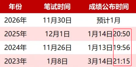 | 2026年国考笔试成绩预计1月14日左右公布,通过整理发现,近几年国考笔试成绩查询入口都是晚上开通。国考成绩发布后次日公布面试名单和合格分数线。届时考生登录国家公务员局专题网站(http://bm.scs.gov.cn/kl2026)查询。