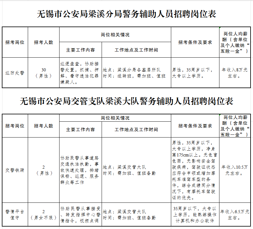 无锡市公安局梁溪分局、梁溪交管大队招聘警务辅助人员简章 因公安工作需要,决定面向社会公开招聘警务辅助人员(非人民警察身份且非事业编制人员身份)34名,现将有关事项公告如下: 一、报名资格条件: (一)基本条件: 1.中华人民共和国公民; 2.拥护中华人民共和国宪法,拥护中国共产党领导和社会主义制度,遵守国家法律法规,品行端正; 3.年满18周岁,具备履行岗位职责所需的身体条件、心理素质和工作能力。 4.具备招聘岗位所需的资格条件及要求。 (二)具有下列情形之一的人员,不得报考: 1.曾被追究刑事责任或者涉嫌违法犯罪尚未结案的; 2.编造、散布有损国家声誉、反对党的理论和路线方针政策、违反国家法律法规信息的; 3.组织、参与、支持色情、吸毒、赌博、迷信等活动的; 4.曾被行政拘留、司法拘留或收容教育的; 5.曾被吊销律师、公证员执业证书的; 6.曾因违法违纪,被开除党籍、公职、军籍或者因违纪违规被辞退解聘的; 7.从事警务辅助工作合同期未满擅自离职的; 8.有较为严重的个人不良信用记录的; 9.本人或家庭成员、主要社会关系人参加非法组织、邪教组织或者从事其他危害国家安全活动的; 10. 家庭成员或主要社会关系人正在服刑或正在接受调查的; 11. 与原用工单位无法解除劳动合同关系或存在劳动纠纷的; 12.本市在职警务辅助人员; 13.其他不适宜从事警务辅助工作的。 回避:报考人员不得报考与其直系亲属有直接上下级关系或密切工作关系的岗位。 二、招聘岗位 各招聘岗位工作内容及条件等详见下表。 无锡市公安局梁溪分局、梁溪交管大队警务辅助人员招聘岗位表 ![]() (点击查看大图) 招聘人员采取第三方劳务派遣用工方式,与劳务公司签订派遣合同。按照合同约定、岗位职责要求,由无锡市公安局梁溪分局及梁溪交管大队根据有关法律法规和规章制度管理、使用及考核。聘用人员试用期为2个月。 三、招聘流程 (一)报名和资格初审: 本次一律采取现场报名的方式,具体方法如下: 1.请应聘人员按照本简章公布的招考岗位、报考条件和要求填写打印《无锡市公安机关警务辅助人员报名信息登记表》(除本人签名外请用电脑填写,不要手写)。 《无锡市公安机关警务辅助人员报名信息登记表》 ![]() 2.请应聘人员于1月8日至1月21日(每工作日9:00-11:00,13:00-16:30)携带报名信息登记表、本人近期1寸免冠照片1张、身份证、学历证书(大专及以上学历须提交学信网学历认证复印件,可自行登录学信网:http://www.chsi.com.cn/xlcx,点击“本人查询”模块后注册并查询,将查询结果页面学历证书电子注册备案表(有效期申请为30天)下载并打印)、退役士兵证、驾驶证、个人信用报告(登录个人信用信息服务平台并打印,网址:https://ipcrs.pbccrc.org.cn/)及报考条件中要求的其他从业资格、技术等级证书等原件及复印件,到以下地址办理报名手续: 公安梁溪分局招聘报名: 公安梁溪分局地址:无锡市梁溪区广瑞路6号门卫,联系电话:0510-82216523。 梁溪交管大队招聘报名: 梁溪交警大队地址:无锡市梁溪区广益路200号4楼,联系电话:0510-82223710。 3.招考单位对考生提供的信息进行审核,凡具有不宜聘用情形或弄虚作假者,一经查实,取消报考及聘用资格。 4.报名所需的证件及资料均需交验原件并提供复印件,证件、资料不全或未按要求填写报名信息并如期到现场报名者视为自动放弃报考资格。 (二)考试与聘用 1. 体能测试 考生通过资格初审后需参加体能测试,体能测试参考公安机关录用人民警察体能测评项目和标准进行。测评项目包括:纵跳摸高和长跑(男1000米、女800米),体能两项均合格者方能进入下一步招聘程序。 测试时间和地点通过短信方式通知。 2. 笔试 体能测试合格者,应聘梁溪交管大队警情平台值守岗位的需参加笔试,笔试内容为《中华人民共和国宪法》《中华人民共和国治安管理处罚法》《江苏省公安机关警务辅助人员管理条例》等法律法规以及政治、经济、文化、社会常识。应聘公安梁溪分局巡防处警岗位、梁溪交管大队巡防铁骑岗位的不需要参加笔试。 笔试时间和地点另行通过短信方式通知。 3. 心理测评 体能测试及笔试均合格人员参加心理测评。 测评时间和地点另行通过短信方式通知。 4. 面试 应聘公安梁溪分局巡防处警岗位、梁溪交管大队交警铁骑岗位的:在体能测试合格人员中,按照与拟招聘人数3:1的比例,根据体能测试成绩从高到低的顺序,确定参加面试人员。达不到规定比例的,确定现有体能测试合格人员作为面试人选。 应聘梁溪交管大队警情平台值守岗位的:在体能测试、笔试成绩均合格人员中,按照拟招聘人数3:1的比例,根据体能测试、笔试成绩总和从高到低的顺序,确定参加面试人员。达不到规定比例的,确定现有体能测试合格人员作为面试人选。 面试时间及地点另行通过短信方式通知。 5. 体检、考察(政审) 应聘巡防处警、巡防铁骑岗位成绩由体能成绩(占比30%)和面试成绩(占比70%)构成,应聘警情平台值守岗位成绩由体能成绩(占比20%)、笔试成绩(占比20%)和面试成绩(占比60%)构成。根据考核成绩按照拟招聘人数1:1的比例确定体检和考察(政审)人选。体检按规定在指定的体检机构进行,体检不合格的,不得进入下一环节。体检标准参照《公务员录用体检通用标准》和《公务员录用体检特殊标准》执行。体检及复检费用由报