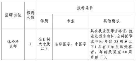 | 现因医院工作需要,拟招聘体检科医师岗位编外聘用人员1人,具体如下: 一、招聘岗位及条件 (一)基本条件: 1.遵纪守法,品行端正,爱岗敬业,具有良好的医德医风。 2.身体健康,五官端正,能胜任岗位工作,符合公务员录用体检标准。 3.以下人员不得报名:曾因犯罪受过刑事处罚和曾被开除公职或开除党籍的人员,人民法院通过司法程序认定的失信被执行人,在各级公务员招考、事业单位及国有企业公开招聘考试中被认定有舞弊等违反录用(招聘)纪律行为的人员,以及有法律规定不得聘用的人员。 (二)岗位及报考条件