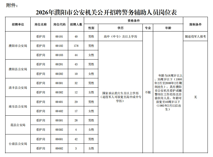 2026年濮阳市公安机关公开招聘警务辅助人员公告 根据《河南省警务辅助人员条例》等相关规定,经濮阳市人民政府批准,决定组织实施2026年濮阳市公安机关警务辅助人员公开招聘工作,现将有关事项公告如下: 一、警务辅助人员身份 警务辅助人员是根据社会治安形势发展和公安工作实际需要,面向社会公开招聘,为公安机关日常运转和警务活动提供辅助支持的非人民警察身份人员。 二、招聘计划 本次共计划招聘警务辅助人员482名(其中男性392名,女性90名),具体招聘岗位及有关要求详见《2026年濮阳市公安机关公开招聘警务辅助人员岗位表》。 三、报考条件 (一)报考者应当具备以下资格条件: 1.拥护中华人民共和国宪法,遵守国家法律、法规和社会公德; 2.自愿从事公安看护工作,具有忠诚奉献、吃苦耐劳精神,服从组织分配; 3.具有河南省户籍; 4.符合岗位要求的年龄; 5.应具有国家承认的大学专科及以上学历;退役军人放宽至高中(中专)学历; 6.具备履行岗位职责所需要的身体条件、心理素质和工作能力; 7.具备招聘岗位所要求的其他资格条件(要求取得学历、户籍时间均截止2026年2月); 8.法律、法规规定的其他条件。 (二)具有下列情形之一者,不得报考: 1.曾被开除中国共产党党籍、开除中国共产主义青年团团籍、在高等教育期间被开除学籍、被机关事业单位开除公职或辞退的; 2.在军队服役期间受记大过以上处分或者受党内严重警告以上处分的; 3.受过刑事处罚或者涉嫌违法犯罪尚未查清的; 4.曾被行政拘留、司法拘留、收容教育或者因吸毒、嫖娼、赌博受到处罚的; 5.在各级公务员招考等国家法定考试中被认定有舞弊等严重违反录用纪律行为的; 6.有较为严重个人不良信用记录的; 7.曾因违反公安机关警务辅助人员和看护队员管理规定,被解除劳动合同的或从事警务辅助和看护工作合同期未满擅自离职的; 8.被吊销律师、公证员执业证书的; 9.本人或家庭成员参加非法组织或从事其他危害国家安全活动的; 10.家庭成员被判处死刑或正在服刑的; 11.濮阳市公安机关在职已确认警务辅助人员身份的; 12.其他不适合从事公安看护工作的情形。 (三)同等条件下优先聘用以下人员: 1.烈士遗属、因公牺牲军人和警察遗属; 2.退役军人、退出国家综合性消防救援队伍的救援人员; 3.见义勇为英雄、模范和先进个人; 4.警察类或者政法类院校毕业生; 5.国家和省规定的其他优先聘用情形。 四、招聘原则和程序 本次招聘遵循“公开、平等、竞争、择优”的原则,按照网上报名、笔试、资格复审、体能测试、面试、体检、考察、公示、聘用等程序进行。 五、报名办法和有关要求 本次招聘实行网上报名,报名程序包括提交报名申请及资格初审、报名确认和缴费、打印准考证三个环节。具体要求为: (一)提交报名申请及资格初审。报考人员于2026年2月9日9:00至2月13日17:00期间,电脑端登录濮阳市公安局官方网站(http://gongan.puyang.gov.cn),点击进入“2026年濮阳市公安机关公开招聘警务辅助人员网上报名系统”进行网上报名,按要求填写个人报名信息并上传本人电子照片(近期免冠正面证件照,红底、蓝底、白底均可,照片应为JPG格式,清晰,完整、无变形),上传的照片由系统自动审核,逾期不再受理报名事宜。 报考人员只能选择一个岗位,报名与考试时使用的有效期内的二代身份证或有效期内的临时身份证(以下简称有效身份证)必须一致。报考人员必须按照本人毕业证书、有效身份证等相关证件显示的专业名称、个人情况填写报名信息,如果出现报考人员重复报名、信息不一致或故意填报虚假信息的,后果由报考人员本人承担。 资格初审由报名系统自动即时审核,主要审核报考者填报的信息是否齐全,格式是否正确。报名申请一旦保存成功,即为通过资格初审。通过资格初审的报考者不能再改报其他岗位,也不能再修改任何信息。未通过资格初审的报考者,可于2026年2月13日17∶00前修改完善相关信息重新提交报考申请,也可改报其他岗位。身份证号是报考人员查询报名资格审查结果、网上缴费和下载打印准考证等事项的依据。 报名前,报考者须仔细阅读并签订《报考警务辅助人员诚信承诺书》,确保提交的报考申请信息全面、真实、准确、有效;需全面了解岗位要求,与自身情况逐一对照,自行判断是否具备相应的资格条件,理性、慎重选择报考岗位,避免误报、错报。报考者提供虚假报考申请材料的,一经查实,将取消报考资格,涉及伪造、变造有关证件、材料、信息骗取考试资格的,将按有关规定严肃处理。因误报、错报岗位或提交虚假信息所产生的一切后果,由报考者本人承担。 (二)报名确认和缴费。通过资格初审的报考者,请务必于2026年2月13日19:00前登录“2026年濮阳市公安机关公开招聘警务辅助人员网上报名系统”进行报名确认并缴费,笔试考务费每人30元。逾期未完成网上报名确认并缴费的视为自动放弃报名资格。 (三)打印准考证。已确认网上缴费成功的报考人员,请在规定的时间内登录“2026年濮阳市公安机关公开招聘警务辅助人员网上报名系统”自行下载打印准考证(A4纸)。具体打印时间将通过濮阳市公安局官方网站和“平安濮阳”微信公众号另行通知,如未及时打印或者丢失准考证造成的后果由报考人员个人承担。 (四)相关要求。完成报名确认和缴费的人数与岗