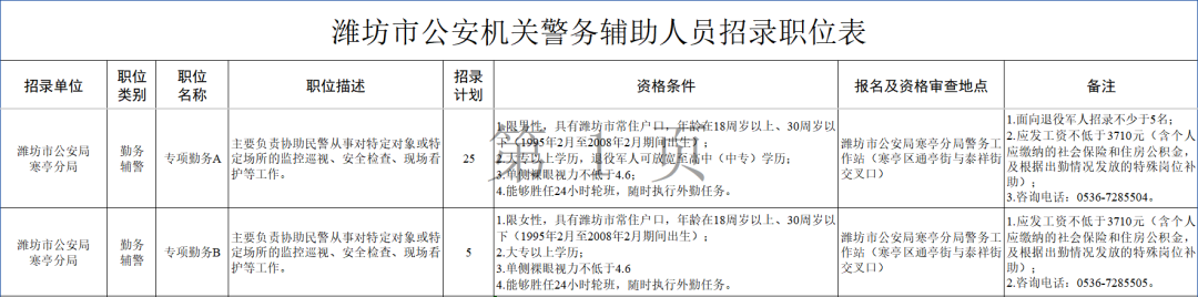 潍坊市公安机关2026年第一季度警务辅助人员招录简章 按照我省警务辅助人员管理有关规定,根据工作需要,潍坊市公安机关面向社会公开招录警务辅助人员,有关事项如下。 一、招录计划及职位 警务辅助人员是在公安机关及其人民警察的指挥和监督下履行辅助性警务职责,由公安机关管理使用,不具有公务员和人民警察身份,不具备执法资格的工作人员。 计划招录158名,其中潍坊市公安局坊子分局15名、潍坊市公安局寒亭分局30名、潍坊市公安局峡山分局18名、诸城市公安局20名、寿光市公安局25名、安丘市公安局50名。具体招录计划及职位要求、资格条件等详见《潍坊市公安机关警务辅助人员招录职位表》(附件1)。 二、报名条件 (一)具有中华人民共和国国籍; (二)拥护中华人民共和国宪法,遵守国家法律法规,品行端正; (三)具有潍坊市常住户口,学历、年龄等资格条件详见《潍坊市公安机关警务辅助人员招录职位表》(附件1); (四)具有履行职责所需的工作能力,具有正常履行职责的身心条件; (五)体形端正,外观无明显疾病特征,无影响面容且难以治愈的皮肤病,无色盲,无嗅觉迟钝,无文身,无肢体功能障碍;单侧裸眼视力不低于4.6; (六)具备招录职位所要求的其他资格条件; (七)在同等条件下可以优先录用下列人员: 1. 烈士的配偶、子女,因公牺牲的军人、人民警察、警务辅助人员的配偶、子女; 2. 退役军人、退出国家综合性消防救援队伍的救援人员; 3. 见义勇为英雄或者见义勇为模范; 4. 人民警察类高等学校毕业生; 5. 具有岗位所需专业资质或者专门技能的人员; 6. 符合国家和省规定优先录用情形的其他人员。 (八)有下列情形之一的人员,不得报考: 1. 参加暴力恐怖、民族分裂、黑社会性质等非法组织,或者从事危害国家安全活动的; 2. 被追究刑事责任的; 3. 有吸毒、卖淫嫖娼、赌博违法行为的; 4. 曾被行政拘留、司法拘留或者强制隔离戒毒的; 5. 被开除公职、开除军籍的; 6. 警务辅助劳动合同期未满擅自离职的; 7. 被依法列为失信联合惩戒对象的; 8. 现役军人、在读的全日制学生;曾连续6个月以上在国(境)外留学、工作、生活,对其在国(境)外期间经历和政治表现难以进行考察的。 9. 国家和省规定不适宜从事警务辅助工作的其他情形。 三、报名和资格审查 本次招录采取现场报名的方式进行。 报名时间:2026年3月2日至3月5日 上午8:30-12:00 下午13:30- 17:30 报名地点:详见《潍坊市公安机关警务辅助人员招录职位表》 (一)提交报名材料 报考人员只能选报1个职位。报名时,应当仔细阅读本简章和《诚信承诺书》(附件2),提交的报考申请材料应当真实、准确、完整。报名与考试时使用的本人有效居民身份证必须一致。报考者提供虚假报考申请材料的,一经查实,即取消报考资格,涉及伪造、变造有关证件、材料、信息,骗取考试资格的,将按照有关规定严肃处理。 1.按要求据实填写并提报《潍坊市公安机关招录警务辅助人员报名表》(附件3)1份; 2.本人有效居民身份证原件及复印件1份; 3.国家承认的学历证书原件及复印件1份。大专及以上学历须提交《教育部学历证书电子注册备案表》(在中国高等教育学生信息网http://www.chsi.com.cn/查询打印);技工类院校毕业人员除提供毕业证外,还需提供毕业生登记表、新生入学花名册和成绩单的复印件。 4.个人信用报告(中国人民银行征信中心出具,报告打印时间应在本公告发布时间之后); 5.退役军人须提交《退出现役证书》或相关证明材料原件及复印件1份; 6.近期免冠彩色电子版照片(重命名为:报考职位代码+姓名+身份证号码); 7.当场签定《诚信承诺书》1份; 8.属于定向、委培毕业生和在职人员的须提交单位出具的加盖单位公章的《所在单位同意报考证明信》(附件4)1份; 9.符合优先招录条件的,提供证明材料原件及复印件1份。(二)资格审查 招录机关对报考者提交材料进行审查,确认报考者是否具有报考资格。资格审查结果当场告知。通过资格审查的,不能再报考其他职位。资格审查期间,报考者未通过资格审查的,可以改报其他符合资格条件的职位。 报考人员要对自己所提交信息的真实性负责。对报考人员的资格审查工作,贯穿于报名、笔试、心理素质测评、面试、体能测评、体检、政治考核、公示、试用期管理等招录工作的全过程。在招录各环节发现报考者不符合报考资格条件的,招录机关均可以取消其报考资格或者录用资格。 四、考试 考试具体时间、地点另行通知。 (一)笔试 笔试内容包括法律法规、政治经济理论、时政方针、省情省况等基础性知识。采取百分制计算笔试成绩。报考人员未按规定时间、地点等要求参加笔试的,视为放弃录用资格。 根据笔试成绩,按照1:3的比例确定参加面试人选,如果进入范围最后一名笔试成绩相同的,一并进入面试,达不到规定比例的按照实有人数确定参加面试人选。 (二)心理素质测评 对参加面试人选进行心理素质测评,测评结果作为择优确定拟录用人员的重要参考,心理素质测评参照公务员招录有关标准执行。测评费用由报考人员承担。报考人员未完成缴费,未按规定时间、地点参加心理素质测评的,招录机关终止其录用程序。缴费成功后,不再退费。 (三)面试 面试主要测试报考人员的逻辑思维、反应应变、语言表达等方面的素质和能力。采取百分制计算报考人员面试成