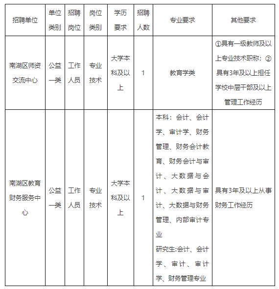 嘉兴市南湖区教育体育局所属事业单位公开招聘工作人员公告 因工作需要,经嘉兴市南湖区人力资源和社会保障局备案,嘉兴市南湖区教育体育局所属事业单位面向社会公开招聘工作人员2名。现将有关事项公告如下: 一、招聘岗位要求 ![]() 二、招聘对象的资格条件 1.遵守中华人民共和国宪法和法律法规、具有良好的政治素质、品行和职业道德,能坚决贯彻党的路线方针政策。 2.具有符合招聘岗位的学历和专业要求。学历以国家教育行政机关认可的相应证件文书为准〔留学人员须取得教育部留学服务中心国外(境外)学历认证书〕;若以第二专业报名的,其第二专业须取得教育行政部门学历认定。招聘岗位所需专业由招聘单位及其上级主管部门参考国家教育行政部门发布的相关专业目录设置及审查认定,并负责解释。对于考生所学专业未列入教育行政部门公布目录的,由招聘单位及其上级主管部门按专业所学课程、研究方向相同或相近原则审查。考生所学专业以毕业证书载明的专业为准。考生学历证书〔留学人员的教育部留学服务中心国外(境外)学历认证书〕均须于2026年2月26日前取得。 3.年龄要求38周岁及以下(1987年2月26日以后出生)。 4.符合招聘计划岗位的其他要求。 5.有下列情形之一的不具备报考资格: (1)现役军人和具有公务员身份累计未满5年(含试用期)的人员。 (2)曾因犯罪受过刑事处罚的或曾被开除公职的;被依法列为失信联合惩戒对象的。 (3)涉嫌违法违纪正在接受纪检监察机关或者司法机关审查尚未作出结论的;受党纪、政纪处分未满处分期限(影响期限)的。 (4)应聘人员不得报考聘用后即构成回避关系的招聘岗位。 (5)按照法律、法规规定不得聘用为事业单位工作人员的。 三、招聘程序与办法 招聘工作贯彻公开、平等、竞争、择优的原则,坚持德才兼备的用人标准,采取报名、考试、体检、考察、公示、聘用等程序进行。 (一)报名 本次报名采用网上报名的方式进行,每位应聘人员限报一个岗位。 1.网上报名:自公告发布之日至2026年3月6日24:00前,应聘人员通过手机扫描下方二维码,选择符合条件的岗位,按提示填写报名信息和上传相关报名材料。 ![]() 2.资格初审:南湖区教育体育局负责对网上报名人员的年龄、身份、学历等资格条件进行资格初审,资格初审合格者参加考试。资格初审合格人数如不足1:3比例的,取消招聘岗位。资格初审情况将于3月10日前在中共南湖区委南湖区人民政府网站区教育体育局“公告公示”栏中公布。 3.打印《准考证》:考生可在3月12日至13日期间按中共南湖区委区政府网站区教育体育局“公告公示”栏中相关通知,自行下载打印《准考证》(贴好照片),并按准考证上明确的要求参加考试。 (二)考试 本次公开招聘考试由嘉兴市南湖区教育体育局组织实施。各招聘岗位资格初审合格人数超过10人的,先进行笔试,再按笔试成绩由高分到低分1:5的比例确定入围面试人选;若资格初审合格人数不足10人(含10人)的,取消笔试环节,直接进行面试。。 1.笔试。笔试形式为闭卷考试,主要考察专业能力、综合应用能力等,满分100分。笔试时间为3月14日(周六)上午9:00-10:30,笔试地点以准考证为准。 2.资格复审:面试前(具体时间地点另行公告),由嘉兴市南湖区教育体育局组织对入围面试对象进行资格复审,资格复审合格者参加面试。资格复审须提供以下材料(原件和复印件1份): (1)报名表(见附件,须由本人承诺签名)。 (2)本人有效居民身份证。 (3)学历证书。 (4)工作单位出具的工作经历证明,其中报考南湖区师资交流中心的考生还需提供职称证书和任职证明(时间截止到2026年2月26日止)。 (5)报考人员是事业单位在编人员的还要提供编制单位出具的同意报考证明。 3.面试。面试采取“结构化面试”的方式进行,主要考查考生的综合素养。面试满分为100分,合格分为75分,面试成绩不合格者,不列入体检、考察人选。面试时间为3月15日(周日),地点放在嘉兴市南湖区。 (三)体检 考试结束后,根据考生总成绩(总成绩=笔试成绩×40%+面试成绩×60%)从高分到低分按照招聘计划的1︰1确定体检对象,体检合格后确定为考察对象。 若总成绩相等的,以面试成绩高的排位在前。若总成绩和面试成绩均相等的,则进行面试加试。若无笔试环节,总成绩=面试成绩,面试成绩相等的则进行面试加试。面试加试成绩只决定最终排名。 体检工作参照《关于修订〈公务员录用体检通用标准(试行)〉及〈公务员录用体检操作手册(试行)〉有关内容的通知》(人社部发〔2016〕140号)和《关于进一步做好公务员考试录用体检工作的通知》(人社部发〔2012〕65号)等文件规定执行。考生不按规定的时间、地点参加体检,视作自愿放弃体检。体检费用自理。 体检不合格或自愿放弃的,依次递补(未参加面试和面试不合格的人员不得递补)。 (四)考察 考察由南湖区教育体育局会同招聘单位组织实施。考察工作参照《公务员录用考察办法(试行)》(中组发〔2021〕11号)执行。在规定时间内,对体检合格的人员进行考察,考察结果仅作为本次是否聘用的依据。考察不合格或自愿放弃的,依次递补(未参加面试和面试不合格的人员不得递补)。 体检、考察实施前,国家、省出台新规定的,按新规定执行。 (五)公示 经体检、考察均合格的人员,确定为拟聘用人员,名单在中共南湖区委区政府网