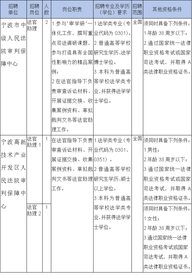 宁波市中级人民法院所属事业单位公开招聘工作人员公告 根据《宁波市事业单位公开招聘工作人员实施办法》的有关规定,宁波市中级人民法院下属事业单位决定面向社会公开招聘事业编制工作人员4名。现就有关事项公告如下: 一招聘单位简介 (一)宁波市中级人民法院审判保障中心是宁波市中级人民法院所属公益一类事业单位,经费预算形式为全额财政补助。主要负责为宁波市中级人民法院审判工作提供计算机网络软件开发使用、计算机硬件维护、网络管理、档案管理、财务管理和代理书记员、速录员等审判保障辅助工作。 (二)宁波高新技术产业开发区人民法院审判保障中心是宁波市中级人民法院所属公益一类事业单位,经费预算形式为全额财政补助。主要负责协助宁波高新技术产业开发区人民法院办理庭前准备、庭审记录、案件整理编目等审判辅助工作以及经费收支管理、网络维护等事务性工作。 二招聘原则和办法 招聘工作坚持公开、平等、竞争、择优原则,按照德才兼备的用人标准,采取公开报名、统一考试和择优聘用的办法进行。根据报名情况,通过考试、体检和考察等程序面向社会公开招聘事业编制工作人员。 三招聘对象基本条件 (一)遵守中华人民共和国宪法、法律和法规; (二)遵守纪律、品行端正,具备良好的职业素质; (三)具有招聘岗位所需的学历、资历、专业、任职资格、职业资格及技能要求; (四)具有适应岗位要求的身体条件; (五)具备岗位所需的其他条件。 四报考条件 ![]() (可点击放大查看) 备注: 1.历届生学历证书、执业资格、有关荣誉称号的取得和年龄计算截止时间均为公告发布之日。 2.2026年普通高校应届毕业生(2025年10月1日至2026年9月30日毕业)可凭学生证、就业协议或就业推荐表报名,但须在2026年9月30日前取得相应的学历学位,到期未取得的不予录用;2026年1月1日至2026年12月31日毕业的国(境)外留学回国(境)人员可等同于国内2026年普通应届毕业生,报考时仍未毕业的可凭国(境)外学校学籍证明报名,但须于 2027年1月31日前取得教育部出具的学历学位认证书(到期未取得的不予录用),国(境)外留学人员专业相近的以所学课程为准。 五招聘办法和步骤 (一) 宁波市中级人民法院审判保障中心 法官助理岗位 1.报名与资格初审 (1)报名时间:2026年3月13日9:00至3月19日16:00。 (2)报名办法:采取电子邮件方式接受报名,不设现场报名,不接受邮寄报名。应聘人员下载并填好附件“报名表”,在报名时间内将报名材料发送至报名邮箱。邮件标题为“宁波中院审保中心报名+应聘人员姓名+手机号码”。 ①报名材料:报名表、个人简历、身份证、学历(学位)证书(其中属于2026年普通高等院校应届毕业生的可凭学生证、就业推荐表和《教育部学籍在线验证报告》;属于2026年1月1日至2026年12月31日毕业的国(境)外留学回国(境)人员可凭国(境)外学校学籍证明和中外文课程成绩单,其他国(境)外留学回国(境)人员可凭教育部中国留学服务中心出具的国(境)外学历和中外文课程成绩单)、法律职业资格证书、招聘岗位要求的其他相关证书和证明等扫描件。 ②报名邮箱及报名确认:在规定时间内将报名材料发送到nbzyzpzy@163.com邮箱,并在发送后于工作日上午9:00—12:00或下午2:00—5:30电至0574-87009331或87009419确认。 (3)应聘人员提供的个人信息必须真实有效。报名时,招聘单位将对应聘人员的报考资格进行初审。证件不全或提供证件与报考资格条件不相符者,不能通过报名资格初审。 (4)应聘人数与招聘计划数之比不能低于3:1,在规定的报名时间内,符合报考条件的应聘人数和招聘计划数比例不足3:1的,将核减岗位或取消该岗位招聘。 (5)报名资格初审通过名单将于报名结束后3个工作日内在宁波法院网(www.nbcourt.gov.cn)上公布。 (6)资格审查工作贯穿于整个招聘过程,在任一环节发现应聘人员的条件与招聘条件不符或者提供虚假材料等,立即取消应聘资格或聘用资格。 2.考试 本次公开招聘考试采取直接面试方式,委托具有考试命题资质的独立第三方机构命题。 (1)资格复审 招聘单位将在面试前,对入围人员进行资格复审,复审具体时间、地点将另行通知。 参加资格复审者须在规定时间内携带报名表、个人简历、身份证、学历(学位)证书(其中属于2026年普通高等院校应届毕业生的可凭学生证、就业推荐表和《教育部学籍在线验证报告》;属于2026年1月1日至2026年12月31日毕业的国(境)外留学回国(境)人员可凭国(境)外学校学籍证明和中外文课程成绩单,其他国(境)外留学回国(境)人员可凭教育部中国留学服务中心出具的国(境)外学历和中外文课程成绩单)、法律职业资格证书、招聘岗位要求的其他相关证书和证明等原件及复印件。 证件(证明)不全或所提供的证件(证明)与报考资格条件不相符者,不能通过资格复审;不按规定的时间和地点参加资格复审者视作自动放弃。通过资格复审的考生现场领取《面试通知》,考生凭身份证和《面试通知》,按照《面试通知》上规定的时间和地点参加面试。 (2)面试 面试采用结构化面试,主要测试报考者法律专业知识、综合分析能力、口头表达能力、应变能力、回答问题准确性和举止仪表等。考生凭身份证和《面试通知》参加面试,面试总分为100分,不足60分者淘汰。面试人员不按规定的时间和地点参加面试的,视作放弃。 (3)成绩