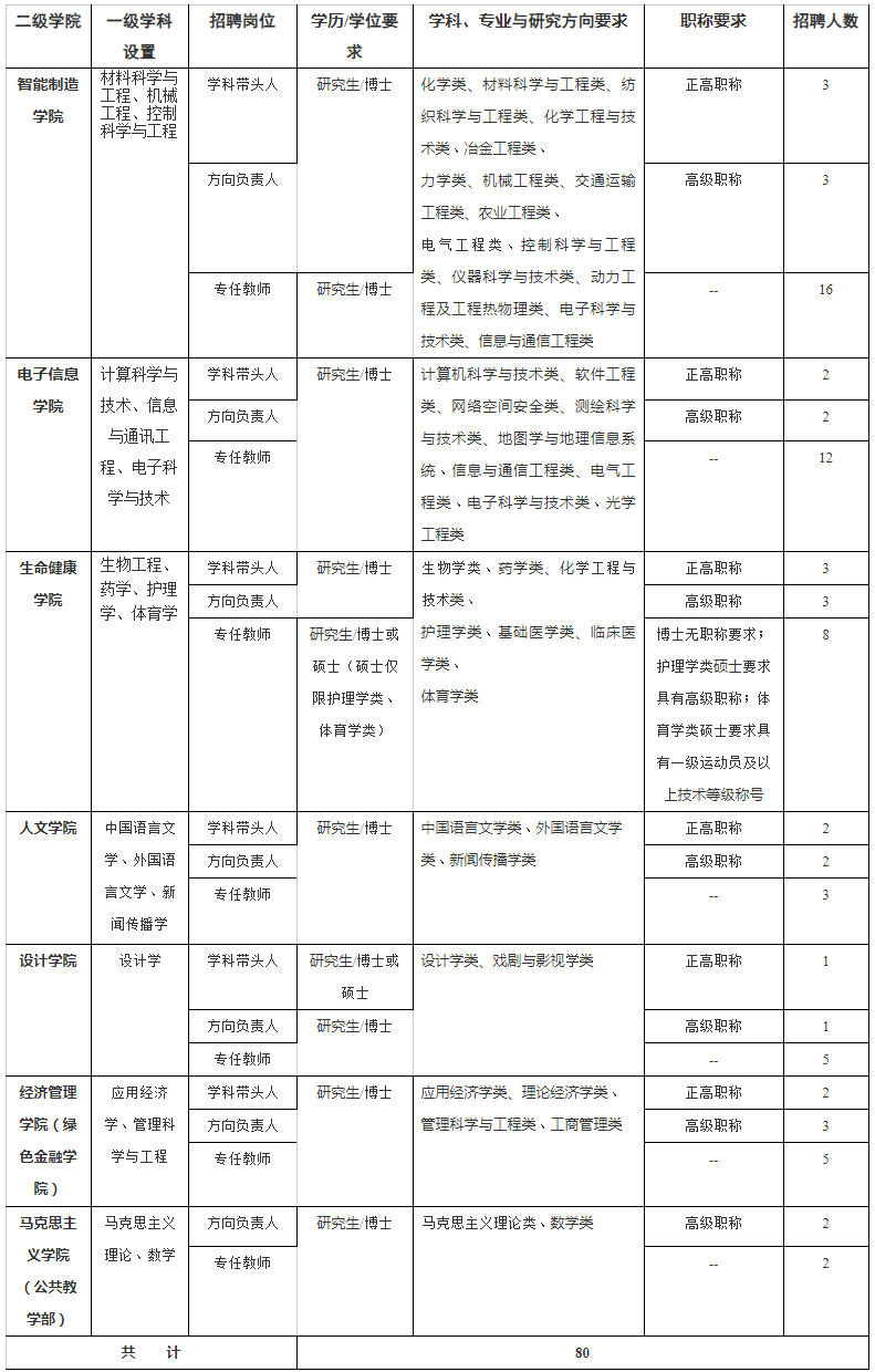 永岸公考整理了浙江事业单位考试相关备考资料,包含真题、时政常识等,点此咨询客服免费领取。 湖州学院2024年诚聘高层次人才(教师)公告 一、学校简介 湖州学院是一所全日制公办普通本科高等学校。学校前身是成立于1999年的湖州师范学院求真学院。2021年1月,经教育部同意转设为公办普通本科高校,更名为湖州学院。学校现为浙江省应用型高校建设试点院校。 目前学校占地面积500余亩,建设中的学校新校园坐落于湖州南太湖新区科技谷,占地1000余亩。拥有工学、理学、经济学、医学、文学、艺术学等学科门类,现有以理工类专业为主的36个本科专业,全日制在校生8300余人,规划在校生规模达到13000人。 学校坚持高水平应用型大学目标定位,立足湖州,面向浙江,辐射长三角,围绕智能制造、新材料新能源、数字经济、生命健康、高端商贸服务、文化创意等领域,着力培养高素质应用型人才。现拥有机械工程、药学2个省一流学科,在电子信息、健康护理、经济贸易等方向建有省重点专业1个、省一流本科专业建设点6个、省新兴特色专业3个、省优势特色专业2个。 面对新时代高等教育高质量发展机遇,学校将始终坚持社会主义办学方向,落实立德树人根本任务,努力提高学校核心竞争力,为长三角一体化发展提供人才支撑与智力支持,为加快建设全国知名、特色鲜明的高水平应用型大学的目标而努力奋斗! 学校全称:湖州学院 学校代码:4133013287 学校网址:https://www.zjhzu.edu.cn/ 办学地点:浙江省湖州市学士路1号 二、岗位需求 (一)顶尖领军人才需求计划 学校面向全球,全职引进顶尖/领军人才。 涉及学科:计算机科学与技术、信息与通信工程、光学工程、材料科学与工程、控制科学与工程、机械工程、电气工程、护理学、药学、中国语言文学、新闻传播学、设计学、应用经济学、管理科学与工程、工商管理、马克思主义理论。 需求人数:根据学校学科发展需要设置。 (二)学科带头人、方向负责人、专任教师需求计划 本次计划引进学科带头人、方向负责人、专任教师共80名,年龄一般在45周岁以下(体育类硕士研究生年龄一般在35周岁以下),但经湖州市人才办认定符合湖州市D类及以上人才,年龄可适当放宽。具体岗位及要求详见下表。 ![]() 应聘人员如有特殊业绩,经学校认可,博士研究生可不受以上职称、学科等条件限制。 四、应聘方式 应聘人员请填写《湖州学院高层次人才(教师)应聘报名表》并附相关支撑材料,通过电子邮件形式将应聘报名表、学历学位证书、职称证书及教科研项目等支撑材料发送至各二级学院邮箱进行报名,邮件主题请注明:姓名+学历学位+应聘目标二级学院+应聘岗位。 学校及时对报名人员进行资格审核,择机择优确定参加考核人员名单,考核具体形式、内容和时间另行通知。学校将根据考核、体检和考察结果确定拟录用人员名单,公示无异议后办理相关录用手续。 本次招聘自公告发布之日起至2024年7月31日期间有效,分批组织实施,直至相应岗位落实聘用人员为止。 五、其他说明 (一)符合应聘条件的各类人才,经考核并同意录用的,可按学校最新引进人才文件规定,享受相应购房补贴、安家补贴、租房补贴、科研启动费等待遇,具体待遇对照文件一人一议。 (二)港澳台地区优秀博士人才可采用年薪制聘任,待遇参照同类人员,具体待遇一人一议。 (三)学校负责协调安排学科领军人才和学科带头人人才配偶的工作岗位,根据实际情况和上级部门有关政策协助其他层次人才配偶对口落实工作。 (四)业绩突出的优秀人才,可以按学校职称有关规定享受职称直聘绿色通道。 (五)学校协助安排引进人才子女就学。 (六)湖州市各类人才补贴以人才引进时湖州市最新颁布的文件为准,补贴申请手续由人才根据湖州市相关文件细则自行办理。 六、联系方式 联系地址:浙江省湖州市学士路1号湖州学院 学校主页:https://www.zjhzu.edu.cn/ 各层次人才引进类别相应要求及待遇情况,可致电湖州学院人事处。人事处人事处联系电话:0572-2322556 邮箱:rsc@zjhzu.edu.cn 人事处联系人:陈老师 二级学院联系方式: ![]() |