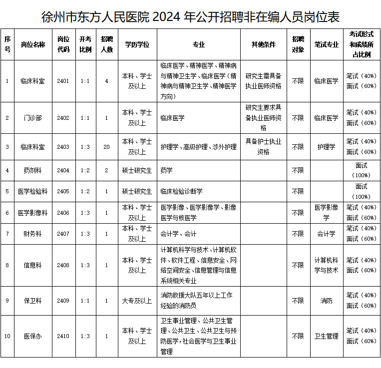 徐州市东方人民医院2024年公开招聘非在编人员公告 根据医院发展及工作需要,经研究决定,现面向社会公开招聘非在编工作人员33人。现将有关事项公告如下: ![]() 一、资格条件 (一)具有中华人民共和国国籍; (二)遵守中华人民共和国宪法和法律,拥护中国共产党领导和社会主义制度; (三)具有良好的品行; (四)具备岗位要求的身体条件; (五)符合相应的年龄条件: 应聘人员年龄在18周岁及以上、35周岁及以下(1988年6月1日至2006年5月31日之间出生);博士研究生或具有中级职称应聘人员年龄可放宽至40周岁及以下;具有副高职称应聘人员年龄可放宽至45周岁及以下;具有正高职称应聘人员年龄可放宽至50周岁及以下。年龄计算方法不变; (六)具备《徐州市东方人民医院2024年公开招聘非在编人员岗位表》中岗位要求的资格条件。工作经历计算的截止时间为2024年8月31日; (七)有下列情形之一的,请不要报名应聘:现役军人或国民教育序列普通高校在读非2024届毕业生;《事业单位人事管理回避规定》明确应当回避的岗位;国家和省另有规定不得应聘到事业单位的人员。 二、报名办法 (一)招聘公告、岗位发布网址 徐州市东方人民医院官网(www.xzdfyy.com) 徐州市东方人民医院微信公众号 (二)报名方式 1.报名方式:采用现场集中报名方式进行。 2.报名时间(资格审核):2024年5月2日-3日上午8:30-11:30,下午1:30-4:30。 3.报名地点:徐州市东方人民医院1号楼五楼会议室(徐州市云龙区铜山路379号)。 4.报名审核通过后,招聘岗位要求进行笔试的,微信缴纳笔试考试费用100元,缴费完成且将报名表及相关资料递交医院即为报名成功。缴费成功后,除应聘岗位被取消外,不退还笔试费用。招聘岗位要求只进行面试的,报名时不用缴纳费用,待面试时缴纳面试费。 (三)现场报名须提供材料 应聘人员现场报名时,应提供符合报考条件的相关证明材料(原件及复印件1份): 1.报名表一份(近期免冠1寸彩色照片); 2.本人有效期内的二代居民身份证; 3.学历学位证书、《教育部学历证书电子注册备案表》(在学信网上打印,网址为:http://www.chsi.com.cn); 4.2024年毕业生,暂未取得学历学位证书、可先提供本人的《毕业生就业推荐表》及《教育部学籍在线验证报告》,并于2024年8月31日前提供学历学位证书和《教育部学历证书电子注册备案表》,否则不予聘用; 5.有执业资格要求的岗位,需提供医师资格证、护士资格证或有效期内的执业资格考试考核合格成绩单原件及复印件;报考2403岗位的应届生,需于2024年12月31日前提供执业资格考试考核合格成绩单原件及复印件; 6.国外学校取得学历者,需提供国家教育行政部门出具的学历认证等有关证明材料; 7.其他与应聘岗位相关的证明材料。 (四)报名注意事项 1.应聘人员应按岗位要求,如实填写报名表上的有关信息。 【特别提醒:应聘人员务必诚信报名,参加报名即视为认可本次招聘公告确定的报名办法和招聘程序等规定,个人信息应针对岗位资格条件,真实、准确、有效的填写。应聘人员应确认本人完全符合岗位的资格条件,如对资格条件和岗位要求存在疑问,应及时向徐州市东方人民医院进一步咨询确认。如不符合资格条件仍然坚持报名的,由此产生的后果自行承担。资格审查工作贯穿于招聘工作全过程。在招聘各个环节,如发现应聘人员报名时填报信息不实且影响报名审核结果的、弄虚作假骗取应聘资格者,一经查实,即取消应聘资格。恶意填写报名信息,扰乱报名秩序或者伪造学历证明及其他有关材料骗取考试资格等严重违纪违规行为的,将按照有关规定处理。】 2.应聘人员须使用有效期内的第二代居民身份证选择一个岗位进行报名; 3.手机号码务必填写准确,并保持畅通。 4.笔试及面试相关信息将于报名结束后依次在医院网站(http://www.xzdfyy.com)发布通知。如遇特殊情况需要调整,将及时在网站另行公告,请报名成功者予以关注。 三、考试 本次公开招聘考试方式为笔试和面试。招聘岗位要求硕士研究生及以上的,不参加笔试,报名审核通过后直接参加面试。 (一)笔试 1.考试内容以相关专业知识为主,不指定大纲和教材。 2.笔试具体事宜将通过徐州市东方人民医院官网(www.xzdfyy.com)发布通知。 3.笔试成绩以卷面总分的60%为合格线。笔试阅卷结束后,从报考该岗位笔试成绩合格人员中,从高分到低分的顺序,按不超过计划招聘岗位数1:3的比例确定进入面试人选(末位成绩并列的,一并参加)。出现放弃面试资格人员时,从该岗位笔试合格的人员中按笔试成绩从高分到低分的顺序依次递补(末位成绩并列的,一并参加)。 (二)面试 1.面试具体事宜将通过徐州市东方人民医院官网(www.xzdfyy.com)发布通知。 2.面试费100元,面试当天缴费。(微信支付) 四、体检考察 1.根据报考人员总成绩,按招聘职位数1:1比例从高分到低分确定参加体检人员。因体检不合格或考生自动放弃,岗位出现空缺时,按总成绩从高分到低分依次递补(成绩并列者,按合格面试成绩由高分到低分排序)。参加体检人员名单及体检具体事宜将通过徐州市东方人民医院官网(www.xzdfyy.com)发布通知。体检在三级综合医院进行,体检费自理。 2.体检合格人员按有关规定组织考察,考察不合格者不予录用。 五、公示 考察合格人员名单,在徐州市东方人民医院官网(www.xzdfyy.com)公示,并接受社会监督,期限为5个工作日。公示期满,符合录用
