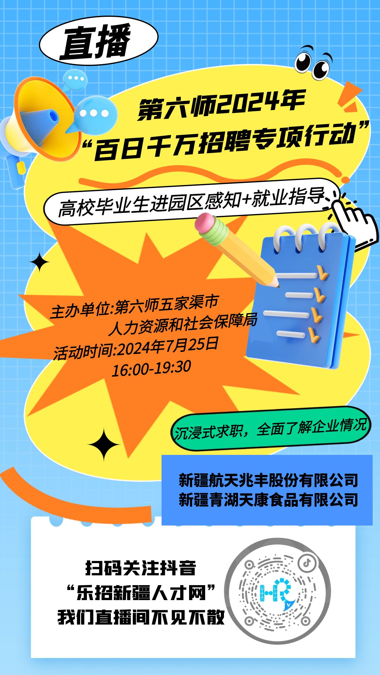 第六师2024年“百日千万招聘专项行动”高校毕业生进园区感知+就业指导主办单位:第六师五家渠市人力资源和社会保障局活动时间:2024年7月25日16:00-19:30沉浸式求职,全面了解企业情况新疆航天兆丰股份有限公司新疆青湖天康食品有限公司扫码关注抖音“乐招新疆人才网”我们直播间不见不散