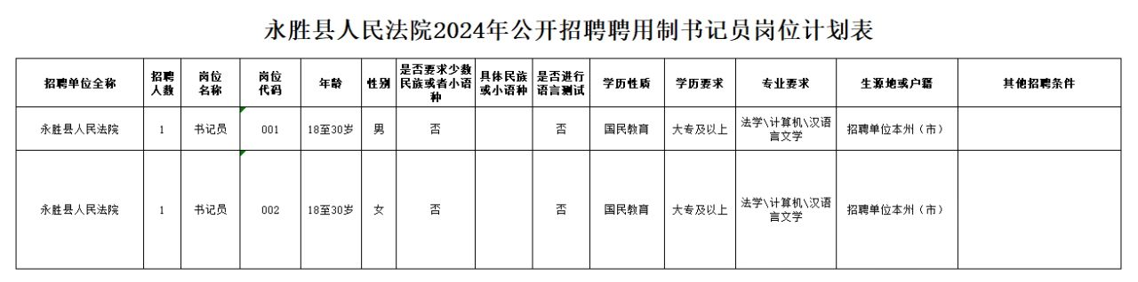 永胜县人民法院2024年公开招聘聘用制书记员公告 因工作需要,永胜县人民法院委托中测高科(昆明)人力资源服务有限公司面向社会公开招聘聘用制书记员2名。现将有关事项公告如下: 一、招聘计划 招聘计划详见《永胜县人民法院2024年公开招聘聘用制书记员计划表》(以下简称《计划表》)。 二、招聘条件 (一)报考人员应当具备下列条件: 1.具有中华人民共和国国籍且户口为丽江市户籍人员; 2.拥护中华人民共和国宪法,遵纪守法,品行端正,作风正派,爱岗敬业,有奉献精神,无违纪违法行为和不良劣迹; 3.具有国民教育大专及以上学历,且专业限制为计算机、汉语言文学、法学; 4.年龄在18周岁以上30周岁以下,计算截止日期为2024年7月31日; 5.政治素质高,业务能力强,遵纪守法,品行端正,具有良好的职业道德。 除上述条件外,报考人员还应当符合《计划表》中岗位设置的其他招聘条件。 (二)下列人员不得报考: 1.曾因犯罪受过刑事处罚的; 2.涉嫌违纪违法正在接受审查,尚未作出结论的; 3.曾被开除公职或被人民法院、人民检察院辞退的; 4.有其他不适宜担任聘用制司法辅助人员情形的。 三、报名与资格审核 本次报名采取网络报名方式进行。 1.报名时间:2024年8月1日(星期四)12:00-2024年8月7日(星期三)24:00。 2.报名方式:本次报名采用网络报名的方式,请电脑登录人事考试服务平台(http://xnrc.easyzp.com/index.php/exam/?EXAMID=2901)按系统提示进行报名。本次考试不接受其他方式报名。 3.报名所需材料:本人身份证、毕业证、学位证(如岗位条件需要则需提供)、报名表;本人近期免冠电子版彩色照片;在职人员在报考前须准备单位同意报考证明备查;与报名条件相关的其他材料。 4.注意事项。 (1)报名提供的个人信息必须真实有效,同时提供清晰的彩色电子照片。 (2)请报考人员关注本人报名审核情况,如系统未审核通过,请及时按系统提示补充完善报名信息。 四、考试内容和方法 考核由笔试+岗位技能测试和面试两个部分组成,综合成绩根据6:4比例确定,总分为100分,即笔试成绩+岗位技能测试成绩占综合成绩的60%,面试成绩占综合成绩的40%。各类成绩折算如出现小数,保留小数点后两位。 (一)笔试和岗位技能测试 1.采取线上考试的方式进行,笔试和技能考试一起进行。笔试主要测评时事政治、法律基础、公文综合应用等内容,满分100分;岗位技能测试考察文字录入,分为看打和听打两部分,满分以100分计(其中看打成绩占岗位技能测试成绩的50%,听打成绩占岗位技能测试成绩的50%)。 2.招聘岗位笔试开考比例不低于1:2,岗位报考人数未达到要求比例的,按岗位开考比例要求对应招聘计划数与报考人数之比削减招录人数,岗位设置情况详见《计划表》; 3.具体考试时间和成绩统一在“永胜县人民法院”官方微信公众平台公布。 (二)面试 1.按照笔试和岗位技能测试成绩的1:5的比例从高分到低分依次确定进入面试人选;出现放弃的情形,依次递补一次。 2.面试采取人机面试的方式,面试为结构化面试,满分为100分。主要考察报考人员的逻辑思维、语言表达、随机应变等能力。 (三)体检 体检由永胜县人民法院政治部组织,按照《公务员录用体检通用标准(试行)》(国人部发〔2005〕1号)执行。体检时,体检医生与体检者有回避关系的,应予回避。对于在体检过程中弄虚作假或者隐瞒真实情况的报考人员,按有关规定处理。 体检费用由报考人员自行承担。 (四)考察 考察由永胜县人民法院政治部组织实施。重点对考察对象的政治思想、道德品质、遵纪守法、自律意识、能力素质、工作态度、学习工作表现等情况进行全面考察。 (五)公示和聘用 拟聘用人员公告在永胜县人民法院官方微信公众号进行公示,公示期不少于3个工作日。体检、考察阶段出现放弃的情形,依次递补一次;公示后出现放弃情形的,不再递补。 公示期满后,对没有反映或虽有反映但不影响聘用的,进入后续的试用环节;对反映有影响录用的问题并查实的,不得进入后续的试用环节;公示期内有反映且对反映的问题一时难以查明的,暂缓试用。为保护个人权益,反映问题时须实名反映,本院将严格做好保密工作。 五、待遇和保障 1.待遇和保障按照《云南省各级人民法院、人民检察院聘用制书记员经费保障办法(试行)》执行。 2.拟录用人员在试用期按规定签订劳动合同并给予试用期工资待遇和保障。 六、其他事宜 (一)笔试、岗位技能测试、面试、体检、考察等招聘工作由永胜县人民法院政治部统筹,部分环节委托中测高科(昆明)人力资源服务有限公司组织实施。对笔试和岗位技能测试、面试、体检、考察、公示等环节的其他具体事宜,将及时在永胜县人民法院官方微信公众号发布公告。 (二)报考人员应及时关注招聘公告,保持联络电话畅通,因通讯不畅导致相应后果由报考人员本人承担。 (三)报考人员对自己报名时填写的信息负责,如若查实报名信息虚假,由此带来其他后果,由报考人员承担。 (四)为保证本次招聘工作公开、公平、公正,永胜县纪委监委派驻人民法院纪检组对招聘工作进行全程监督。监督举报电话:13688758164(颜组长)。 (五)本公告由永胜县人民法院政治部负责解释。 政策咨询电话: 永胜县人民法院政治部 联系电话:0888-6561157 《永胜县人民法院2024年公开招聘聘用制书记员计划表》 ![]() 2024年7月31日 免费学习资源(关