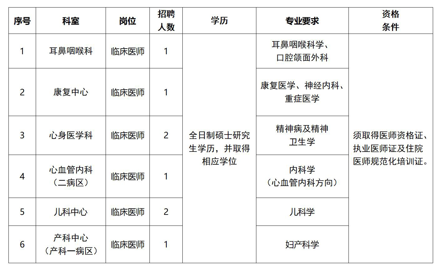 遂宁市中心医院2024年8月公开紧急招聘高层次卫生专业技术人员公告 根据科室业务发展需要,经医院研究,决定面向社会公开紧急招聘高层次人才卫生专业技术工作人员。现将有关事项公告如下: 一、应聘基本条件 (一)具有中华人民共和国国籍,遵纪守法、品行端正; (二)截止报名结束之日,年龄在35周岁以下; (三)符合岗位条件的社会在职人员、非在职人员; (四)身体健康,具有正常履行应聘岗位职责的身体条件; (五)履行岗位职责需具备的其他条件; (六)具有下列情形之一的,不得招聘: 1、曾受过刑事处罚的人员; 2、曾被开除公职的人员; 3、正在接受违法违纪审查及审计尚未终结的人员; 4、尚未解除党纪、政纪处分的人员; 5、违反有关规定不适宜报考的人员; 6、公告规定时间内,未取得相关证书等原件的人员。 二、招聘岗位要求 ![]() 三、待遇 1、按照相关政策可参加遂宁市人力资源和社会保障局组织的公开考核招聘解决事业编制。 2、到岗后经过试用期考核合格一次性发放安家补助及生活补助共计5万元(税前)。 3、其余福利待遇按照遂宁市中心医院相关规定执行。 四、报名须知: 报名前请认真阅读本公告,详细了解招聘对象、范围、条件规定和有关注意事项等内容,根据自身情况选择完全符合报考条件的岗位报名,医院不再另行通知报考人员相关内容;报考者应使用有效居民身份证有关信息选择一个招聘岗位进行报名,报名时填报的身份证信息与考试时使用的身份证必须保持一致。 (一)报名时间: 2024年8月10日-2024年8月20日 (二)报名方式: 网上报名:报名人员通过微信扫描下侧二维码或点击链接https://www.wjx.cn/vm/PBmNJwx.aspx填写个人信息并提交;成功提交后将报名所需材料电子版发至邮箱sns120hr@163.com,材料标题格式“科室-岗位-学历-姓名”,如“急救中心-临床医师-硕士研究生-张三”。 ![]() (三)报名材料: 1、《遂宁市中心医院应聘人员基本信息登记表》(官网下载填写)。 2、身份证扫描件。 3、毕业证、学位证以及教育部学历证书电子注册备案表(备案表须在学信网注册后下载打印)扫描件。 4、医师资格证、执业医师证及住院医师规范化培训证扫描件。 五、考核: (一)医院根据报名人员提交的相关资料进行初选,初选结果会于2024年8月22日之前通过邮箱发送至报名人员,故请密切关注邮箱中我院发送的相关信息。 (二)通过初选的报名人员须在2024年8月28日至2024年8月31日至应聘科室进行岗位技能考核,待科室考核结束后于2024年9月1日进行集中面试 。 (三)依据考核,按照竞争择优、双向选择的原则确定录用人员。 六、体检和录用 (一)根据考核得分排名顺序,等额确定进入体检环节人员名单;按规定在遂宁市中心医院官网及遂宁市中心医院河东院区科教大楼1楼公示栏进行为期5个工作日的公示,公示期间接受社会监督。 (二)体检标准将参照修订后的《公务员录用体检通用标准(试行)》及《公务员录用体检操作手册(试行)》有关规定执行;具体时间另行通知。 (三)体检合格后被确定为拟录用人员,按规定在遂宁市中心医院官网及遂宁市中心医院河东院区科教大楼1楼公示栏进行为期7个工作日的公示,公示期间接受社会监督。 (四)出现以下情况之一者不予录用:在招考过程中弄虚作假者;体检不合格者。 (五)资格审查将贯穿招聘全过程,应聘者应保证报名材料真实可信,任一过程中发现应聘者不符合招聘条件及要求,均取消考核及录用资格。 七、联系方式 联系电话:0825-2292610(人力资源部吉老师) 联系地址:四川省遂宁市河东院区东平北路27号遂宁市中心医院河东院区科教大楼人力资源部502办公室。 八、其他 (一)请各考生做好各项准备工作,异地考生提前规划行程,注意出行安全。 (二)未尽事宜以遂宁市中心医院人力资源部解释为准。 遂宁市中心医院 2024年8月10日 免费学习资源(关注可获取最新开课信息) |