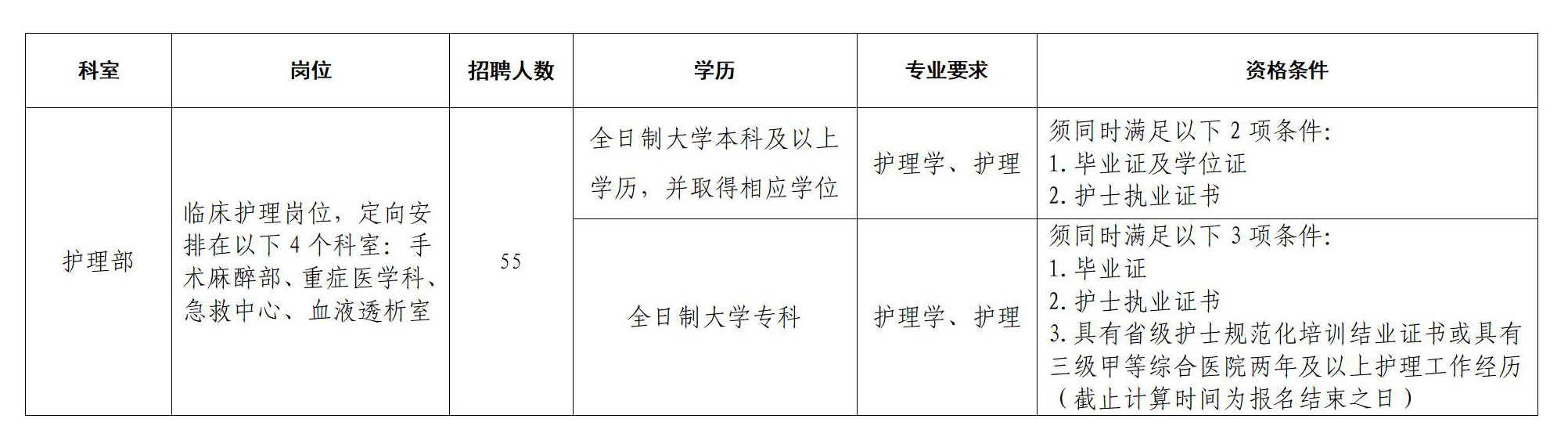 遂宁市中心医院2024年8月公开紧急招聘非在编护理专业技术人员公告 为加强我院护理人才队伍建设,满足临床工作需要,经医院研究,决定面向社会公开紧急招聘55名非在编护理专业技术人员,定向安排在手术麻醉部、重症医学科、急救中心、血液透析室,现将有关事项公告如下: 一、招聘条件 (一)具有中华人民共和国国籍,遵纪守法、品行端正; (二)截止报名结束之日,年龄在28周岁以下; (三)符合岗位条件的社会在职人员、非在职人员; (四)身体健康,具有正常履行应聘岗位职责的身体条件; (五)履行岗位职责需具备的其他条件; (六)具有下列情形之一的,不得招聘: 1、曾受过刑事处罚的人员; 2、曾被开除公职的人员; 3、正在接受违法违纪审查及审计尚未终结的人员; 4、尚未解除党纪、政纪处分的人员; 5、违反有关规定不适宜报考的人员; 6、公告规定时间内,未取得相关证书等原件的人员。 二、专业、学历及资格条件 ![]() 三、报名须知 报名前请认真阅读本公告,详细了解招聘对象、范围、条件规定和有关注意事项等内容,根据自身情况选择完全符合报考条件的岗位报名,医院不再另行通知报考人员相关内容。报考者报名时填报的身份证信息与考试时使用的身份证必须保持一致。 (一)报名时间: 2024年8月10日-2024年8月20日 (二)报名方式: 网上报名:通过微信扫描下方二维码或通过链接https://www.wjx.cn/vm/PAmNJDG.aspx填写个人信息并成功提交。成功提交后将报名所需材料电子版发至邮箱sns120hr@163.com,材料标题格式“岗位-学历-姓名”,如“护理-大学本科-张三”。 ![]() 四、现场资格审核及心理测试 提交报名信息成功的考生,携带报名所需材料的相关原件及复印件按照以下规定时间及地点进行现场资格审核及心理测试。 (一)审核时间:2024年8月28日(上午9:00-12:00,下午14:30-17:00) (二)审核地点:遂宁市中心医院河东院区科教大楼516会议室 (三)资格审核确认须携带的材料有: 1、《遂宁市中心医院应聘人员基本信息登记表》(官网下载填写)。 2、身份证原件及复印件(1份)。 3、毕业证、学位证原件及复印件(1份),在线认证报告或学历证书电子注册备案表(自行在学信网下载打印)。 4、资格条件要求的相关证明材料原件及复印件(1份): (1)全日制大学本科及以上:护士执业证书; (2)全日制大学专科:①护士执业证书 ②省级护士规范化结业证书或三甲综合医院两年及以上护理工作经历相关证明材料。 (四)其他:资格审核通过者,扫描工作人员提供的二维码,完成心理测试。 五、招聘考核内容、方式和成绩计算办法: (一)主要是对个人综合素质测评、专业知识等方面进行考核。采取笔试及面试的方式进行考核,笔试及面试成绩各占50%的比例计入考核成绩。 (二)根据笔试成绩,按照招聘人数与面试人数1:3的比例由高分到低分依次确定进入面试,拟进入面试的最后一名成绩相同的,并列人员一并进入面试;未达比例要求的,则以实际人数进入面试。进入面试人员名单将在笔试结束后2小时在遂宁市中心医院官网及遂宁市中心医院河东院区科教大楼1楼公示栏公布。 (三)面试成绩低于60分的考生不能进入公开招聘下一环节。 (四)具体考核安排: 1、笔试 时间:2024年8月29日9:30-10:30 地点:详见准考证 2、面试 时间:2024年8月29日14:00-18:00 地点:详见准考证 六、体检 (一)根据考核总成绩排名顺序,等额确定前55名考生为参加体检人员,按规定在遂宁市中心医院官网及遂宁市中心医院河东院区科教大楼1楼公示栏进行为期5个工作日的公示,公示期间接受社会监督。 (二)体检标准将参照修订后的《公务员录用体检通用标准(试行)》及《公务员录用体检操作手册(试行)》有关规定执行;具体时间另行通知。 七、录用 (一)体检合格后,按规定在遂宁市中心医院官网及遂宁市中心医院河东院区科教大楼1楼公示栏进行为期7天的公示,公示期间接受社会监督。 (二)出现以下情况之一者均不予录用:在招考过程中弄虚作假者;体检不合格者。 (三)资格审查将贯穿招聘全过程,应聘者应保证报名材料真实可信,任一过程中发现应聘者不符合招聘条件及要求,立即取消考核资格及录用资格。 八、待遇 本次招聘系我院自主招聘,录用人员无事业编制,其福利待遇按照遂宁市中心医院非在编人员相关规定执行。 九、联系方式 联系电话:0825-2292610 (人力资源部吉老师); 联系地址:四川省遂宁市河东院区东平北路27号遂宁市中心医院河东院区科教大楼人力资源部502办公室 十、其它 (一)请各考生做好各项准备工作,异地考生提前规划行程,注意出行安全。 (二)未尽事宜以遂宁市中心医院人力资源部解释为准。 遂宁市中心医院 2024年8月10日 免费学习资源(关注可获取最新开课信息) |
