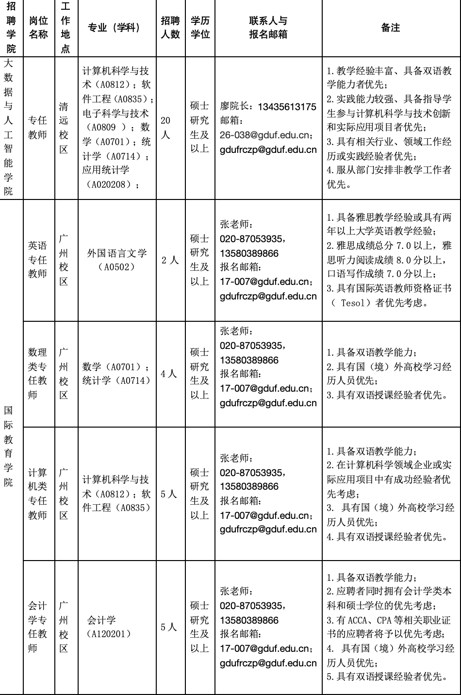广东金融学院2024年招聘合同聘用制硕士专任教师公告 广东金融学院是一所省属公办普通本科院校,是华南地区唯一的金融类高校。学校由中国人民银行创办于1950年,是一所具有“央行基因”的院校。被誉为“华南金融人才摇篮”和“南粤金融黄埔军校”。 学校现有广州校本部和肇庆校区,新建清远校区,总占地面积近2300亩。学校设有21个学院(校区、部),现有本科专业53个,涵盖经济学、管理学、法学、文学、理学、工学、艺术学7个学科门类,以经济学、管理学、法学为主体、以金融学为核心,坚持经济学、管理学、法学、文学、理学、工学、艺术学等多学科门类协调融合发展。学校开设了金融学下设的全部本科专业,是全国唯一一所拥有金融学类全部十个本科专业的高校。金融学、保险学、会计学为国家级一流本科专业建设点,信用管理等14个专业为省级一流本科专业建设点。应用经济学、工商管理、金融学、经济法学是广东省重点学科。应用经济学、工商管理、法学3个学科入选广东省高等教育“冲一流、补短板、强特色”提升计划重点建设学科。学校作为唯一的应用型本科院校参与制定全国本科金融类专业教学质量国家标准。开办了全国首批、广东首个互联网金融专业和广东首个精算学专业,拥有同类高校中最为齐全的金融学类专业体系。 学校入选广东省首批普通本科高校向应用型转型试点高校,入选广东省高等教育“冲一流、补短板、强特色”提升计划。学校以党和国家对金融业和高等教育发展的要求为引领,向应用型深化、向高端化提升、向特色化发展、向国际化迈进,努力建成中国第一所“金融大学”,做广东金融强省建设的支撑者、区域金融事业发展的引领者和国家金融高等教育的示范者。 根据学校事业发展的需要,现公开招聘能够承担大数据与人工智能学院、国际教育学院教学课程和教学任务的硕士专任教师若干名(详见附件1),有关事项公告如下: 一、招聘对象 1.普通高等院校2024年硕士应届毕业生(含择业期内的应届毕业生),须满足同时具有“研究生学历和硕士学位”的条件,并在2024年7月31日前取得相应毕业证书、学位证书。 2.具有硕士研究生学历学位及相应工作经历的社会人员,年龄在30周岁以下(1994年7月1日以后出生);具有三年以上适岗工作经验的硕士研究生以上学历者,可适当放宽年龄要求至35周岁以下(1989年7月1日以后出生)。 3.港澳学习、国外留学人员须于入职截止日前取得教育部中国留学服务中心境外学历、学位认证及有关证明材料。 二、招聘基本条件 1.具有中华人民共和国国籍。 2.遵守中华人民共和国宪法和法律。 3.具有良好的品行和职业道德。 4.具备岗位所需的专业或者技能条件。 5. 港澳学习、国外留学归国人员须在学校规定的入职截止日前取得在港澳地区或国外的学位(历)证书、教育部留学服务中心出具的《香港、澳门特别行政区学历学位认证书》或《国外学历学位认证书》。 6.适应岗位要求的身体条件。 7.有下列情况之一者,不得报考: (1)受行政处分未满5年或其它行政处分正在处分期内的。 (2)近两年内,在机关、事业单位招录(聘)考试、体检或考察中存在违纪行为的。 (3)因涉嫌违法违纪正在接受审计、纪律审查或者涉嫌犯罪,司法程序尚未终结的;或者刑事处罚期限未满的人员。 (4)法律、法规规定的其它不得应聘的情形。 三、招聘需求表 ![]() 四、薪酬待遇及聘用期限 1.薪酬待遇 采用非事业编制合同聘用制管理,薪酬标准按《广东金融学院A类合同聘用制人员管理办法》专业技术十一级岗位执行,在完成年度教学工作量和学院安排任务的前提下,试用期满后,年薪不低于10万元(税前)。 2.聘用期限 岗位聘期为3年,根据相关管理办法考核合格后续聘下一个聘期。首次参加工作人员试用期为6个月,社会人员或有工作经历人员试用期3个月。 有关首次聘期期满后是否续聘的事宜,按学校相关规定执行。 五、报名 1.报名时间 自此公告发出之日起7个工作日后开始报名,报名时间15个自然日。 2.报名方式 采用电子邮件方式网上报名。应聘人员填写《广东金融学院招聘合同聘用制硕士专任教师(非事业编制)报名表》(以下简称《报名表》),并提交以下电子版个人材料。电子版个人材料和《报名表》共同压缩在同一个压缩包中,命名为:“姓名+最高学历学位+专业”,[例如:张三+硕士研究生+人工智能],发送至指定电子邮箱(具体邮箱见招聘需求表)。邮件命名应与压缩包命名一致,未按要求报名者不予受理。邮件须同时发送到我校人事处电子邮箱gdufrczp@gduf.edu.cn及各二级学院电子邮箱(具体见需求表内信息)。 个人材料包括: (1)广东金融学院招聘合同聘用制硕士专任教师(非事业编制)报名表(附件1); (2)个人简历; (3)身份证(正反面); (4)本人照片(彩色小一寸证件照); (5)本科及以上学历、学位证; (6)外语程度证明; (7)专业技术资格或职务证书; (8)获奖证明、公开发表论文、科研等业绩成果材料; (9)具有相关工作经验的请提交工作证明材料; (10)国(境)外留学人员应提供教育部授权机构出具的最高学历学位认证书。 以上材料均应真实有效,若发现有弄虚作假情况将取消应聘或聘用资格;上传的电子扫描版材料须确保清晰、可读,否则视为无效。报名成功以应聘者收到邮件回复为准。 3.资格审查 (1)初审。报名结束后,