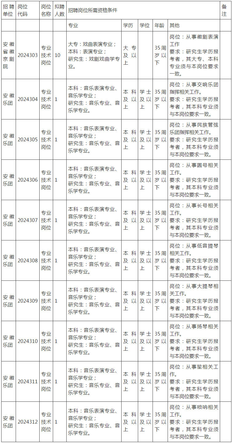 | 为做好2024年度安徽省徽京剧院、安徽乐团面向社会公开招聘工作人员工作,根据《事业单位人事管理条例》(国务院令第652号)和中共安徽省委组织部、安徽省人力资源和社会保障厅《关于印发〈安徽省事业单位公开招聘人员暂行办法〉的通知》(皖人社发〔2010〕78号)规定,现就有关事项公告如下: 一、招聘原则 (一)坚持面向社会、公开招聘。 (二)坚持考试考察、择优聘用。 二、招聘计划 此次公开招聘工作人员19名,具体招聘计划(岗位)如下: