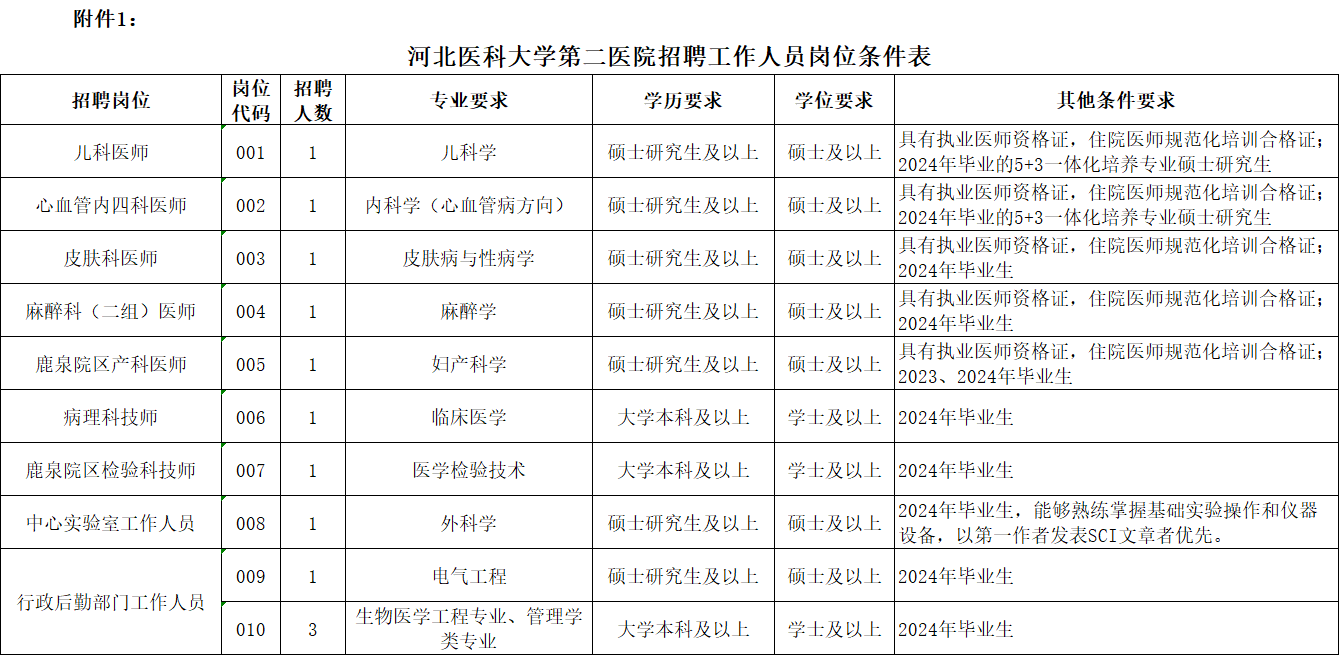 河北医科大学第二医院公开招聘工作人员公告(2025年3月) 根据医院发展需要,我院拟面向社会公开招聘工作人员,现将有关事项公告如下: 一、医院概况 河北医科大学第二医院是一所集医疗、教学、科研、预防、保健、康复、急救为一体的三级甲等综合医院,医院创建于1918年,现有院本部、鹿泉院区、北院区、上庄院区4个院区运行,正定院区正在建设中。 医院总占地面积10.32万平方米,总建筑面积35.08万平方米。编制床位2816张,实际开放床位4126张。甲类大型医用设备(TOMO)1台。乙类大型医用设备5台:内窥镜手术机器人2台、医用直线加速器2台、PET-CT设备1台。有博士生导师120人、硕士生导师492人。中国工程院院士1人、中国中医科学院学部委员、国医大师1人、长江学者1人、国家有突出贡献中青年专家1人、享受国务院特殊津贴专家10人,省级专家人才72人。 医院开设临床医技科室112个,医院有国家级临床重点专科10个,省级临床重点专科30个,国家临床医学研究中心分中心6个,省级临床医学研究中心9个,省级医学重点学科26个,省级质控中心15个,省级重点实验室10个,省级研究所4个。作为河北医科大学规模最大的直属教学医院,拥有国家住培专业基地29个,专培专业基地5个,其中国家级重点住培专业基地7个。 二、招聘原则 坚持德才兼备的用人标准和“公开、公平、竞争、择优”的原则,面向社会公开招聘。 三、招聘对象 普通高等院校毕业生以及在国(境)外院校取得学历学位并已经在教育部门完成学历学位认证的留学回国人员(以教育部门学历学位认证时间视同毕业时间)。 四、招聘条件、人数及岗位要求 (一)应聘人员须具备以下基本条件: 1.具有中华人民共和国国籍,依法享有政治权利的公民; 2.拥护中国共产党的领导,政治立场坚定。热爱祖国,遵守宪法和法律,具有良好的品行。热爱医学事业,具有良好的职业道德追求和奉献精神; 3.具备履行岗位职责的身体和心理条件,能正常履职并有较好的专业发展潜质; 4.具有符合岗位要求的学历、学位、专业和技能条件; 5.符合回避制度的有关规定,具备岗位所需要的其他资格条件。 (二)招聘人数和岗位要求 河北医科大学第二医院拟公开招聘医生、医技和行政后勤岗位工作人员12名,各岗位具体招聘人数和岗位要求详见《河北医科大学第二医院公开招聘工作人员岗位条件表》(附件1)。招聘人员数量根据各岗位招聘条件要求,遵循“择优原则”,可少于或等于公告发布的人员数量。 ![]() (三)其他要求 应聘人员报名时应已取得相应证书,国(境)外留学回国人员报名时应已取得教育部门出具的认证证书。 五、招聘程序和方法 (一)报名和资格审查 1.报名时间:2025年3月18日至21日18:00。 2.报名方式:“河北医科大学第二医院云招聘”系统报名。 3.报名要求:应聘人员登录网址http://hbey.vhzhaopin.com/login,经注册后按要求如实填写报名信息并上传相关佐证材料。 4.每名应聘人员只能应聘1个岗位。应聘人员应保证所提供的各种材料和信息真实、准确,凡本人填写信息不真实、不完整或填写错误的,责任自负;对于发现有弄虚作假、舞弊等行为,一经查实,立即取消考试资格及聘用资格。医院对所提交的资料进行资格审查,初审结果通过云招聘系统通知,通过初审的应聘人员按要求携带所有原件到医院进行现场审核,具体时间、地点另行通知,资格审查最终结果在河北医科大学第二医院官网(https://www.hb2h.com/)予以公示。 5.医院资格审查贯穿招聘工作全过程。应聘人员务必按医院相关要求,按时提供相应资料,逾期视为自动放弃应聘资格。 (二)笔试 1.笔试采取闭卷的方式,笔试内容为专业理论考试,主要测试应聘人员的各专业岗位所需专业及相关技能知识。考试不指定辅导用书。笔试实行百分制,满分100分。符合报名条件的博士毕业生可免于参加笔试,直接进入面试环节。 2.笔试时间、地点和有关要求将在河北医科大学第二医院官网(https://www.hb2h.com/)另行公告通知。 (三)面试 1.面试人选确定 参加笔试的应聘人员依据笔试成绩从高分到低分排序,按计划招聘人数与进入面试人选1:3比例确定面试人选,比例内末位笔试总成绩并列的都进入面试。若参加笔试人数未达到以上比例的,则该岗位参加笔试的考生全部进入面试环节。符合报名条件的博士毕业生不受以上比例限制,不占参加笔试的应聘人员名额,全部进入面试环节。 2.面试方式 根据各专业岗位要求组成专家组,对应聘人员应聘岗位所需的知识及综合能力进行测试,由评委投票表决。同意票数达到评委人数50%以上的方为合格,合格者按照得票数从高到低排序,按各岗位招聘计划确定进入体检阶段人选,各岗位进入体检阶段人选人数不超过计划招聘人数,但可少于岗位计划招聘人数。 3.面试时间、地点和有关要求,将在河北医科大学第二医院官网(https://www.hb2h.com/)另行公告通知。 (四)体检 体检工作由河北医科大学第二医院统一组织,体检参照现行公务员录用体检标准执行,费用自理,放弃体检或体检不合格者不进入下一招聘阶段。体检时间、地点和有关要求将在河北医科大学第二医院官网(https://www.hb2h.com/)另行公告通知。 (五)公示 经考试考察、体检合格的,确定为拟聘用人选,在河北医科大学第二医院官网(https://www.hb2h.com/)进行公示,公示期7个工作日。 (六)聘用 对公示期满无异议的拟聘用人