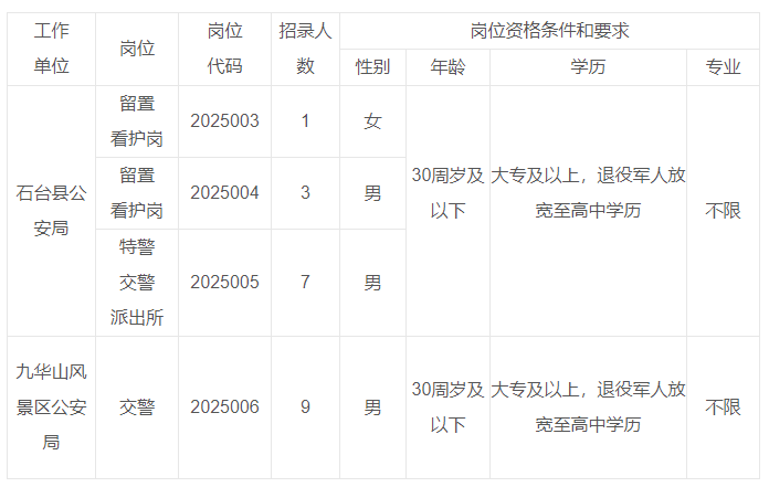 2025年池州市公安局公开招聘辅警公告(第二批) 根据工作需要,池州市公安局2025年面向社会公开招聘辅警(第二批),现将有关事项公告如下: 一、招聘原则 1.面向社会、公开招聘; 2.考试考察、择优聘用; 3.统一组织、分工负责。 二、招聘岗位、数量 本次招聘辅警计划20名,具体岗位详见下表: ![]() 三、招聘条件 (一)具有中华人民共和国国籍; (二)拥护中华人民共和国宪法,遵守国家法律、法规; (三)具有良好的政治素质和道德品行; (四)具备从事警务辅助工作所需的身体素质、心理素质和工作能力;服从组织调配和安排;能适应加(值)班和夜班工作; (五)五官、体型端正,具有正常履行岗位职责的身体条件和心理素质,无明显生理缺陷及特征,无传染性疾病、残疾、色盲、纹身等。 (六)具备招聘岗位所要求的其他资格条件。 招聘条件中“30周岁以下”为1994年3月以后出生。 (七)有下列情形之一的,不得报考: 1.不符合招聘岗位条件要求的人员; 2.在读全日制普通高校非应届毕业生; 3.现役军人; 4.经人力资源和社会保障部门认定具有考试违纪行为且在处分期内的人员; 5.本人或家庭成员、主要社会关系人参加非法组织、邪教组织或者从事其他危害国家安全活动的; 6.受过刑事处罚或者涉嫌违法犯罪尚未查清的; 7.编造、散布有损国家声誉、反对党的理论和路线方针政策、违反国家法律法规信息的; 8.因吸毒、嫖娼、赌博受到处罚的; 9.被行政拘留、司法拘留的; 10.被吊销律师、公证员执业证书的; 11.被开除公职、开除军籍或者因违纪违规被辞退解聘的; 12.池州市公安机关在职辅警,以及曾在池州市公安机关从事辅警工作离职未满三年的; 13.曾因违反池州市公安机关管理制度被解除劳动合同的; 14.有较为严重个人不良信用记录的; 15.国家和省规定的不适合从事辅警工作的其他情形。 四、招聘程序 招聘按照发布招聘信息、报名及资格审查、笔试、体能测试、资格复审、面试、成绩合成、体检、考察、公示、聘用等程序进行。考试分为笔试、体能测试和面试。 (一)发布招聘信息 招聘公告在池州市公安局网站(https://gaj.chizhou.gov.cn)、池州市人事考试网(https://czsrsj.chizhou.gov.cn/rskszx)等网站上发布。 本次招聘的其他后续有关信息将陆续在池州市公安局网站发布,不通过其他形式另行通知,报考人员请及时登录网站了解相关信息。 (二)报名及资格审查 本次招聘考试报名采用网络报名的方式进行,报名网站为池州市人事考试网,报名时间为2025年3月24日09:00至3月28日16:00,逾期不再受理。 报考人员登录池州市人事考试网,严格按照要求填报《报名资格审查表》,上传本人电子照片(近期免冠正面证件照,jpg格式,尺寸为295×413像素,大小20-100kb),并提供有效通讯方式(如错填、手机关机、停机等原因造成无法联系到考生本人,耽误考试、聘用的,其后果由考生自行负责)。报考人员填写的信息必须与本人实际情况、报考条件和所报考的岗位要求相一致。 资格审查工作由池州市公安局组织实施,贯穿于公开招聘的全过程。报考人员提交的报考信息应当真实、准确,提供虚假报名信息的,一经查实,即按有关规定给予取消考试、聘用等资格。对伪造、变造有关证件、材料、信息,骗取考试资格的,将按有关法律法规给予处理。 每位报考人员须使用本人有效居民身份证进行报名和参加考试。 报考人员提交报名信息后至3月31日16:00前可登录池州市人事考试网查询网上资格审查情况。通过审查的,不能更改个人信息或再报考其他职位;尚未审查或未通过审查的,可在3月31日16:00前改报其他职位。 通过网上资格审查的报考人员,应于4月1日16:00前登录池州市人事考试网按规定缴纳考试(测试)费用,逾期未缴费的视为自行放弃。已缴费但未参加考试(测试)考生,费用不退回。 根据安徽省物价局、安徽省财政厅皖价费〔2009〕118号、皖价费函〔2017〕221号文件规定,按标准收取考试费100元/人(含笔试费45元/人、体能测试费55元/人)。 确认报考人数与岗位招聘人数比例低于2:1的,核减该岗位计划数。 (三)考试 考试考务具体工作由池州市人力资源和社会保障局会同池州市公安局具体实施。 (1)笔试 笔试科目为综合知识,主要内容为政治理论、法律基础知识、公安业务基础知识、公文知识等。笔试科目满分为100分。 笔试时间为2025年4月12日上午9:00-11:00。笔试地点设在池州市区,具体考试地点、考场见准考证。报考人员可于2025年4月10日9:00至4月11日24:00,从池州市人事考试网自行下载并打印笔试准考证。 (2)体能测评 体能测评时间为2025年4月12日下午,地点设在池州市区,具体测评时间、地点详见笔试准考证。(如遇恶劣天气则进行顺延,测评时间另行通知) ①男子体能测评项目为1000米跑(标准时间≤6′30〞)、纵跳摸高(标准高度≥255厘米)。体能测评合格方可进入下一环节。其中,以1000米跑时间计算体能成绩,精确到秒,满分为100分,以标准时间对应35分为起点,体能成绩每减少1秒相应增加0.5分,直到100分为止。 ②女子体能测评项目为800米跑(标准时间≤5′50〞)、纵跳摸高(标准高度≥230厘米)。体能测评合格方可进入下一环节。其中,以800米跑时间计算体能成绩,精确到秒,满分为100分,以标准时间对应35分为起点,体能成绩每减少1秒相应增加0.5分,直到100分为止。 因体质等各类原因不宜参加体能测试的,应聘者应主动提出