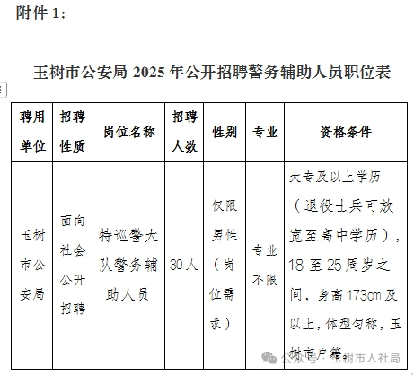 2025年玉树市公安局面向社会公开招聘警务辅助人员公告 警务辅助人员作为公安机关的重要辅助力量,在社会面整体防控工作中发挥着重要作用,为加强玉树市公安局辅警公安工作力量,现决定面向社会公开招聘30名警务辅助人员,现将有关招聘事项公告如下: 一、组织领导 为确保招聘工作顺利有序,本次招聘在市委、市政府及州公安局政治部的统一领导下,在市纪委监委的监督下,由玉树市人力资源和社会保障局和玉树市公安局具体组织实施。 二、招聘岗位及人数 玉树市公安局特巡警大队警务辅助人员30名(男性)。 三、招聘原则 坚持德才兼备的用人标准,贯彻“公开、公平、竞争、择优”的原则,在考试、考核的基础上择优录用。 四、招聘范围和条件 1.具有中华人民共和国国籍;拥护中华人民共和国宪法,拥护中国共产党、热爱祖国,具有维护社会治安稳定,敢于同违法犯罪行为作斗争的勇敢精神,品行端正,热爱公安事业,无违法犯罪行为,无不良嗜好,具有履行职责的工作能力; 2.玉树市户籍(落户日期截止招聘公告发布第一日),录用后无条件服从岗位分配; 3.应聘人员年龄在18至25周岁之间(出生日期截止招聘公告发布第一日),净身高在173CM及以上,体型匀称。 4.大专及以上学历(退役士兵可放宽至高中学历); 5.应聘人员具有正常履行职责所需的身体素质和工作能力,无重大疾病及传染性疾病,体形端正,无残疾,无口吃,无重听,无色盲,无纹身; 6.公安机关规定的其他条件。 五、有以下情形之一的人员,不得报考: 1.本人或家庭成员、主要社会关系人参加非法组织、邪教组织或者从事其他危害国家安全活动的; 2.本人家庭成员或主要社会关系人正在服刑或正在接受调查的; 3.受过刑事处罚或者涉嫌违法犯罪尚未查清的; 4.编造、散布有损国家声誉、反对党的理论和路线方针政策、违反国家法律法规信息的; 5.因吸毒、嫖娼、赌博受到处罚的; 6.被行政拘留、司法拘留或收容教育的; 7.被开除公职、开除军籍或者因违纪违规被辞退解聘的; 8.从事警务辅助工作合同期未满擅自离职的; 9.有较为严重个人不良信用记录的; 10.其他不适宜从事警务辅助工作的。 六、招聘程序 招聘工作按照发布招聘公告、现场报名(资格审查)、笔试、资格复审、体能测试、面试、体检、政审、公示、办理聘用手续等程序依次进行。 1.现场报名 (1)报名时间:2025年6月4日至6月11日(工作日内:上午9时—12时、下午15点—18时)。 (2)报名地点:玉树市公安局政工监督室(地址:玉树市公安局办公大楼四楼) (3)相关要求:现场报名需提交本人有效居民身份证(有效期内临时身份证或由派出所开具的带照片加盖户籍专用章的户籍证明)、户口簿、学历证书和教育部“学信网”打印的学历认证报告原件及复印件各一份,服役相关证件、加分证明佐证资料原件及复印件一份、近期小二寸蓝底彩色免冠照片4张及电子版照片,《玉树市公安局公开招聘警务辅助人员体表检查审查表》《玉树市公安局公开招聘警务辅助人员报名资格审查表》一份,个人征信报告一份(需自行前往中国人民银行出具)。 注:考生提供的信息和材料必须真实有效,凡不提交或提供虚假证明材料的,取消本次聘用资格;考生按照《玉树市公安局公开招聘警务辅助人员报名资格表》要求在户籍所在地派出所进行资格初审,初审合格后进行体表检查,体表检查在玉树市公安局办公大楼1楼治安大队进行,检查中发现考生身高不达标、身体有残疾、纹身、明显疤痕等其他不适合从事警务辅助工作的取消聘用资格。 符合加分条件的考生需现场确认,提供退伍证(退役相关证件)、见义勇为等相关证明材料原件及复印件。未确认的视为无加分项,后期不予追加。 2.笔试 (1)笔试内容。笔试采取闭卷方式。内容主要为行政职业能力测试、公安基础知识、时事政治,分值为100分,笔试成绩占考试总成绩50%。 (2)笔试时间和地点,考试时间拟定于6月14日。具体考试时间和地点以准考证为准(请考生随时关注平台信息发布),逾期或无故不领取准考证、无故不参加笔试者,视为自动放弃(考生须凭本人有效居民身份证、准考证参加考试)。 (3)答题要求。笔试考试时必须使用现代汉语答题。 3.体能测试 体能测试参照《人力资源社会保障部公安部国家公务员局关于印发〈公安机关录用人民警察体能测评项目和标准(暂行)〉的通知》(人社部发201148号)执行。按照笔试成绩由高至低以1:3的比例进入体能测试环节。笔试总成绩并列的考生可一并进入体能测试环节。如遇体能测试不合格,出现名额空缺时,按照笔试成绩排名进行递补。 4.面试 通过体能测试方可进入面试环节。面试采取结构化面试的方式,面试成绩占考试总成绩50%。 笔试成绩、面试成绩、总成绩均保留2位小数。 体能测试、面试时间另行通知。 5.体检 按照总成绩高低顺序,按招聘岗位人数1:1的比例确定体检人员。体检标准参考《公务员录用体检通用标准(试行)》《公务员录用体检特殊标准(试行)》相关规定执行。因个人原因未按要求参加体检的考生,视为自动放弃。应聘人员在体检过程中,有意隐瞒影响聘用的疾病或病史的,一经发现取消聘用资格。体检费用由考生自理。对体检结果有异议的,可申请复检一次,复检不合格的取消招聘资格并根据总成绩排名进行递补。 6.政审 体检合格人员进入政审,政审参照《公