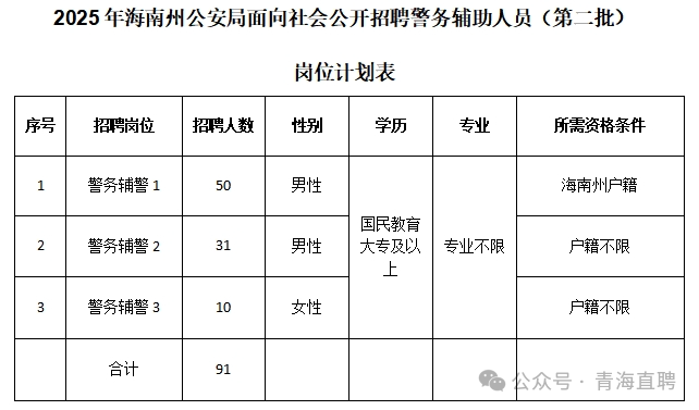 2025年海南州公安局面向社会公开招聘警务辅助人员(第二批)公告 根据《关于明确公安机关警务辅助人员用人额度的通知》的规定,海南州公安局面向社会公开招聘警务辅助人员91名,现将有关事项公告如下: 一、招聘岗位情况 招聘人数:91人 招聘岗位:(详见附表) 二、招聘条件 (一)基本条件 1.具有中华人民共和国国籍,拥护中国共产党领导,拥护社会主义制度,维护国家统一和民族团结; 2.拥护中华人民共和国宪法,遵守法律法规,品行端正; 3.年满十八周岁以上(2007年8月8日以前出生),三十五周岁以下(1989年8月8日以后出生); 4.应具备国民教育大专及以上文化程度,退役士兵可放宽至高中学历; 5.具有正常履行职责所需的身体条件和心理素质; 6.具有良好的身体素质,组织纪律观念强,服从命令,听从指挥,无违法犯罪记录,自愿从事公安辅警工作; 7.身心健康、无传染性疾病,体型端正,面目无明显疤痕、无文身、无残疾; 8.国家和本省规定的其他条件。 报考年龄、学历等各类事项的时间截止日期为本次报名工作第一日。 (二)加分条件 1.公安烈士和因公牺牲公安民警中符合条件的配偶子女、在职公安民警配偶子女、见义勇为积极分子和先进个人笔试成绩(加权前)加5分。 2.警察类或政法类院校毕业生笔试成绩(加权前)加3分。 以上各项加分累计不超过5分 3.符合加分条件的考生需在报名期间(2025年8月8日09:00时至8月21日18:00时)将加分相关证明材料的扫描件打包发送至qhzp010@163.com(压缩包格式:海南州公安局+姓名+加分)进行确认加分,逾期提交则视为放弃不享受加分政策。 4.符合加分条件人员名单将在青越人才发展集团网上报名系统(http://rcfzjt.pzhl.net/index.php)、青越人才招考服务中心、青海直聘微信公众号等平台公示,公示期为3天。 (三)有下列情形之一的人员,不得报考 1.受过刑事处罚或者涉嫌违法犯罪尚未查清的; 2.编造、散布有损中国共产党的领导和社会主义制度,损害国家统一、民族团结的信息或者言论的; 3.因吸毒、嫖娼、赌博等受过行政处罚的; 4.曾被行政拘留、司法拘留的; 5.因违纪违法开除、辞退或者解除劳动合同的; 6.被依法列为失信联合惩戒对象的; 7.曾因违纪、违法等个人原因,被原单位辞退的警务辅助人员; 8.与报考者本人有夫妻关系、直系血亲关系的人员受到过刑事处罚的; 9.国家规定的不适合从事警务辅助工作的其他情形。 三、招聘程序 按照“公开、公平、竞争、择优、自愿”的原则,通过网上报名、资格审查、笔试、资格复审、体能测试、面试、体检、政治考察、公示及聘用等程序进行。 (一)报名、资格审查 1.报名时间为: 2025年8月8日09:00至2025年8月21日18:00。 2.审核时间为: 2025年8月8日09:00至2025年8月22日12:00。 3.缴费时间为: 2025年8月8日09:00至2025年8月22日20:00。 4.报名方式:本次招聘考试采用网上报名,报考人员需详细阅读网上报名须知及考生诚信承诺书,如实提交有关信息并完成报名工作。报名需用电脑端进入网上报名系统(http://rcfzjt.pzhl.net/index.php)“2025年海南州公安局面向社会公开招聘警务辅助人员(第二批)”按要求进行报名,每人限报1个岗位(报名流程详见附件)。 5.报名要求: (1)个人近期免冠小二寸蓝底彩照。 (2)身份证扫描件(原件正反面)。 (3)户口本扫描件(户口本首页及本人页)。 (4)毕业证书扫描件。 (5)《教育部学历证书电子注册备案表》(大专及以上学历登录学信网下载)。 (6)退役士兵提供退役士兵证扫描件。 考生须将报名资料上传至指定网上报名系统(http://rcfzjt.pzhl.net/index.php)。每人限报一个岗位,报名成功后不得改报。报名过程中因个人信息留错导致无法联系到本人的,后果由考生自负。 6.资格审查:招聘单位对报考者是否符合招聘岗位资格条件进行网上审查。报考者在报名、资格审查中,提供虚假材料的,在招聘过程中一经发现,取消资格。资格审查贯穿本次招录考试全过程。 7.考试服务费:通过资格审查的报考人员,登录报名系统进行网上缴费,本次考试收取考试服务费200元。未按规定缴费的,视为自动放弃。报名成功后因自然灾害等不可抗力的原因造成考试统一取消的给予退费,其他原因一律不予退费。 (二)开考比例 笔试开考比例要大于等于1:3,达不到开考比例的职位,根据实际报名情况,经用人单位(或主管部门)研究,确定招聘岗位计划数或开考比例。 (三)笔试 1.笔试采用闭卷方式。内容主要为行政职业能力测试、公安基础知识等。笔试分值为100分,时间为90分钟,笔试成绩占总成绩的60%(保留小数点后2位)。 2.笔试时间地点:具体考试时间、地点以准考证为准,请各位考生密切关注报名网站(http://rcfzjt.pzhl.net/index.php)及青越人才招考服务中心、青海直聘微信公众号通知。 3.准考证下载打印:报考者登录青越人才发展集团网上报名系统(http://rcfzjt.pzhl.net/index.php)自行下载打印笔试准考证。 4.考生必须持准考证、有效二代居民身份证在规定的地点和时间候考。材料不全、证件与本人不符的考生取消考试资格。 5.笔试总成绩及进入资格复审人员名单将在网上报名系统(http://rcfzjt.pzhl.net/index.php)、青越人才招考服务中心、青海直聘微信公众号进行公示,公示期为3天。 (五)资格复审 1.资格复审对象以笔试总成绩排名为依据,按照岗位需求1:3确定进入现场资格复审人员。若招聘岗位笔试人数未达到1:3比例,将按实际报名人数进行