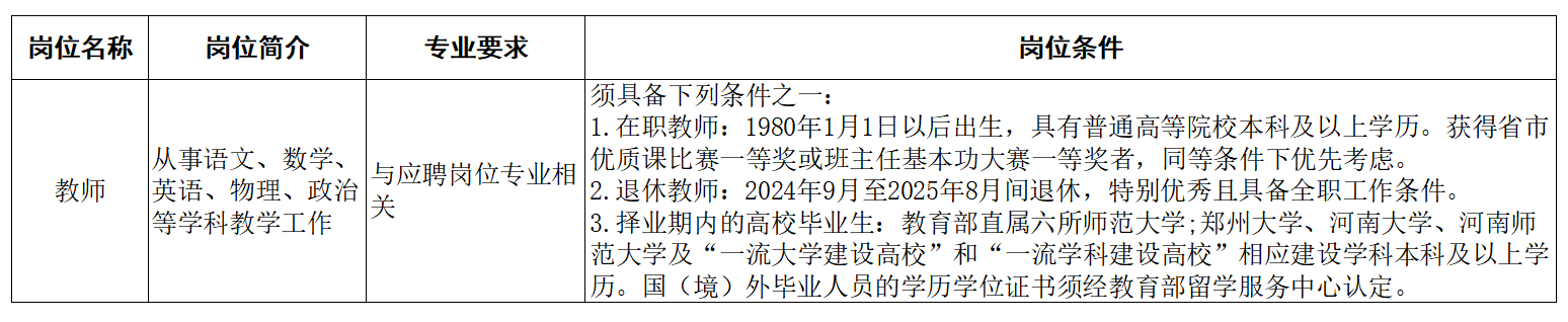 (三)考试安排 资格审查合格者参加考试,考试分为笔试和面试(说课、答辩)。时间、地点等相关信息,电话通知考生本人。 1.笔试 笔试分为科目一和科目二。笔试科目一为合格性考试,达到合格等次的,笔试科目二成绩方可计入总成绩。笔试科目二满分100分。笔试以闭卷方式进行,笔试科目一内容为应聘岗位所需的公共知识,笔试科目二内容为学科专业基础知识。 2.面试 面试采取教学技能测试(说课)+答辩的方式进行,面试满分为100分。 3.成绩核算 总成绩=笔试科目二成绩*30%+面试成绩*70% (四)体检和考察 1.体检。体检参照河南省教师资格申请人员体格检查标准(2017年修订)执行,费用自理。未按要求参加体检者视为自动放弃聘用资格。 2.考察。考察内容主要包括德、能、勤、绩、廉等方面,重点是思想政治素质、道德品行、工作实绩、与工作岗位相关的素质和有无法律纠纷、犯罪记录等。 五、聘用 本次招聘根据报名条件和岗位职责,本着平等竞争、择优录用的原则,按程序考核录用。 经公示无异议的聘用人员,由河南省人力资源开发中心有限公司与劳动者签订劳动合同后以劳务派遣方式到河南省实验中学教育集团工作。 薪资待遇:7000-12000元/月(根据工作岗位和能力确定) 六、联系方式 电话:0371-60337633,0371-63943667 标签: 河南省实验中学 2025年教师招聘 秋季招聘 本科招聘 多学科教师 |