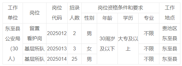 2025年池州市公安局公开招聘辅警公告(第五批) 根据工作需要,池州市公安局2025年面向社会公开招聘辅警(第五批),现将有关事项公告如下: 一、招聘原则 1.面向社会、公开招聘; 2.考试考察、择优聘用; 3.统一组织、分工负责。 二、招聘岗位、数量 本次招聘辅警计划30名。具体岗位详见下表: ![]() 三、招聘条件 (一)具有中华人民共和国国籍; (二)拥护中华人民共和国宪法,遵守国家法律、法规; (三)具有良好的政治素质和道德品行; (四)具备从事警务辅助工作所需的身体素质、心理素质和工作能力;服从组织调配和安排;能适应加(值)班和夜班工作; (五)五官、体型端正,具有正常履行岗位职责的身体条件和心理素质,无明显生理缺陷及特征,无传染性疾病、残疾、色盲、纹身等。 (六)具备招聘岗位所要求的其他资格条件。 招聘条件中“30周岁及以下”为1994年9月 1日(含)及以后出生。 (七)有下列情形之一的,不得报考: 1.不符合招聘岗位条件要求的人员; 2.在读全日制普通高校非应届毕业生; 3.现役军人; 4.经人力资源和社会保障部门认定具有考试违纪行为且在处分期内的人员; 5.本人或家庭成员、主要社会关系人参加非法组织、邪教组织或者从事其他危害国家安全活动的; 6.受过刑事处罚或者涉嫌违法犯罪尚未查清的; 7.编造、散布有损国家声誉、反对党的理论和路线方针政策、违反国家法律法规信息的; 8.因吸毒、嫖娼、赌博受到处罚的; 9.被行政拘留、司法拘留的; 10.被吊销律师、公证员执业证书的; 11.被开除公职、开除军籍或者因违纪违规被辞退解聘的; 12.池州市公安机关在职辅警,以及曾在池州市公安机关从事辅警工作离职未满三年的; 13.曾因违反池州市公安机关管理制度被解除劳动合同的; 14.有较为严重个人不良信用记录的; 15.国家和省规定的不适合从事辅警工作的其他情形。 四、招聘程序 招聘按照发布招聘信息、报名及资格审查、笔试、体能测试、资格复审、面试、成绩合成、体检、考察、公示、聘用等程序进行。 考试分为笔试、体能测试和面试,由东至县公安局会同东至县人力资源和社会保障局具体组织实施,池州市公安局负责指导实施。 (一)发布招聘信息 招聘公告于2025年9月17日在池州市公安局网站(https://gaj.chizhou.gov.cn)、池州市人事考试网(https://czsrsj.chizhou.gov.cn/rskszx)、东至县人民政府网(https://www.ahqy.gov.cn/)统一发布。 本次招聘的其他后续有关信息将陆续在池州市公安局网站发布,不通过其他形式另行通知,报考人员请及时登录网站了解相关信息。 (二)报名及资格审查 本次招聘考试报名采用网络报名的方式进行,报名网站为池州市人事考试网,报名时间为2025年9月22日09:00至9月26日16:00,逾期不再受理。 报考人员登录池州市人事考试网,严格按照要求填报《报名资格审查表》,上传本人电子照片(近期免冠正面证件照,jpg格式,尺寸为295×413像素,大小20-100kb),并提供有效通讯方式(如错填、手机关机、停机等原因造成无法联系到考生本人,耽误考试、聘用的,其后果由考生自行负责)。报考人员填写的信息必须与本人实际情况、报考条件和所报考的岗位要求相一致。 资格审查工作由池州市公安局负责组织,东至县公安局具体实施,贯穿于公开招聘的全过程。报考人员提交的报考信息应当真实、准确,提供虚假报名信息的,一经查实,即按有关规定给予取消考试、聘用等资格。对伪造、变造有关证件、材料、信息,骗取考试资格的,将按有关法律法规给予处理。 每位报考人员须使用本人有效居民身份证进行报名和参加考试。 报考人员提交报名信息后至9月28日16:00前可登录池州市人事考试网查询网上资格审查情况。通过审查的,不能更改个人信息或再报考其他职位;尚未审查或未通过审查的,可在9月28日16:00前改报其他职位。 通过网上资格审查的报考人员,应于9月29日16:00前登录池州市人事考试网按规定缴纳考试(测试)费用,逾期未缴费的视为自行放弃。已缴费但未参加考试(测试)考生,费用不退回。 根据安徽省物价局、安徽省财政厅皖价费〔2009〕118号、皖价费函〔2017〕221号文件规定,按标准收取考试费100元/人(含笔试费45元/人、体能测试费55元/人)。 出现岗位报名人数与岗位招聘人数比例低于2:1的,核减或取消该岗位计划数,被核减或取消的岗位计划数由市公安局研究确定调剂到其他岗位。被取消招聘岗位的报考人员,可于9月30日12:00—16:00改报其他符合条件的岗位。 (三)考试 (1)笔试 笔试科目为综合知识,主要内容为政治理论、法律基础知识、公安业务基础知识、公文知识等。笔试科目满分为100分。 笔试时间为2025年10月18日上午09:00-11:00。笔试地点设在东至县,具体考试地点、考场见准考证。报考人员可于2025年10月16日09:00至10月17日24:00,从池州市人事考试网自行下载并打印笔试准考证。 (2)体能测评 地点设在东至县城区,具体测评时间、地点详见笔试准考证。(如遇恶劣天气则进行顺延,测评时间另行通知) ①男子体能测评项目为1000米跑(标准时间≤6′30〞)、纵跳摸高(标准高度≥255厘米)。体能测评合格方可进入下一环节。其中,以1000米跑时间计算体能成绩,精确到秒,满分为100分,以标准时间对应35分为起点,体能成绩每减少1秒相应增加0.5分,直到100分为止。 ②女子体能测评项目为800米跑(标准时间≤5′50〞)、纵跳摸高(标准高度≥230厘米)。