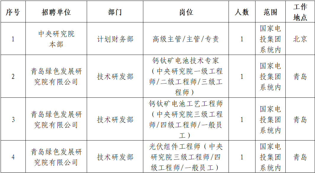 | 国家电投集团科学技术研究院有限公司(以下简称“中央研究院”)是国家电力投资集团有限公司(以下简称“国家电投集团”)二级公司,在国家电投集团科技创新体系中处于先导地位,发挥科技决策参谋作用,是国家电投集团战略性前瞻技术研究的主体。现根据工作需要,招聘本部及三级单位有关岗位,有关事项公告如下: 一、招聘岗位、人数、范围及工作地点
